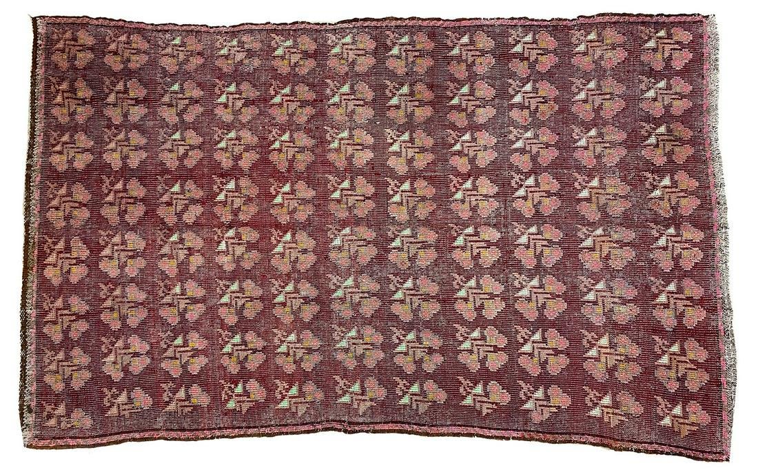 Vintage handmade Soumak area rug, possibly Eastern Turkish Origin, 110"l x 67"w Condition: Fair overall condition, minor wear, a few minor stains Dimensions: 110 x 67 in