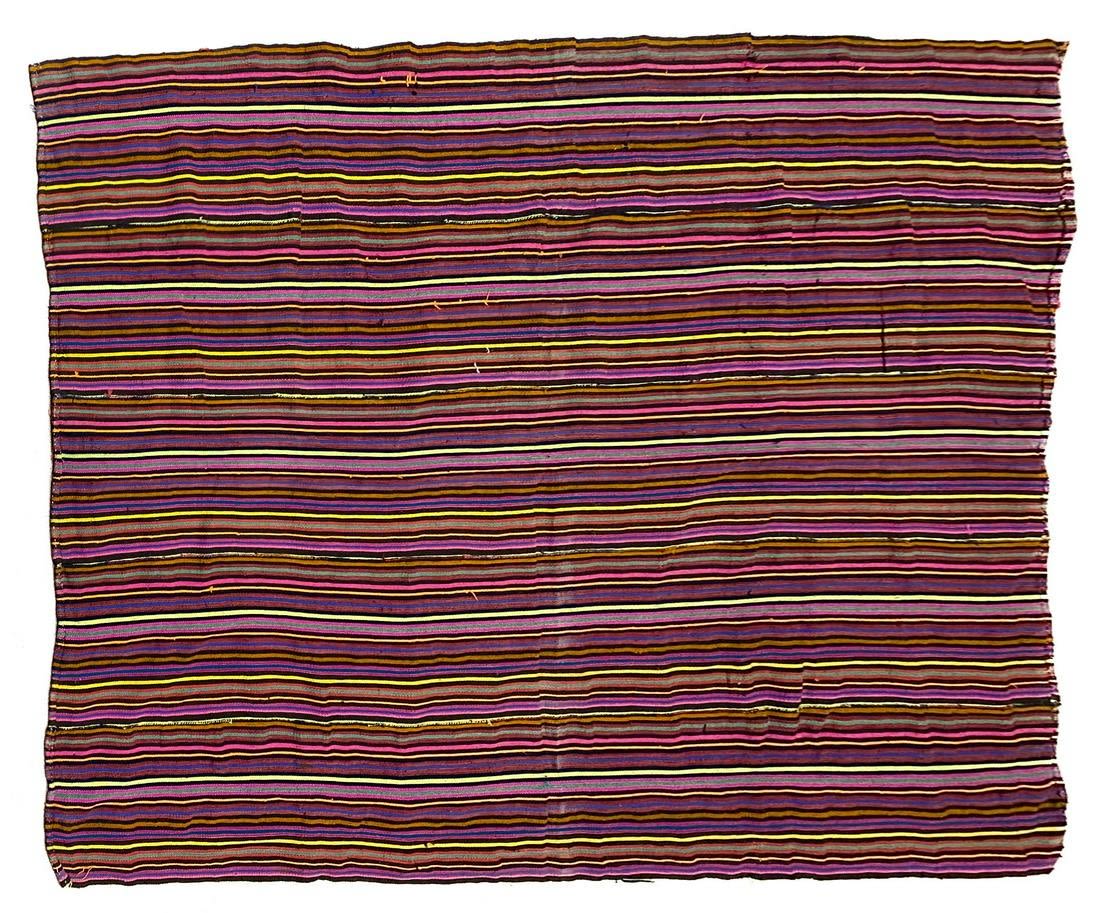 Vintage handmade rug, unknown origin, 92"l x 70"w Condition: Fair, some holes, some tread pulls Dimensions: 92 x 70 in