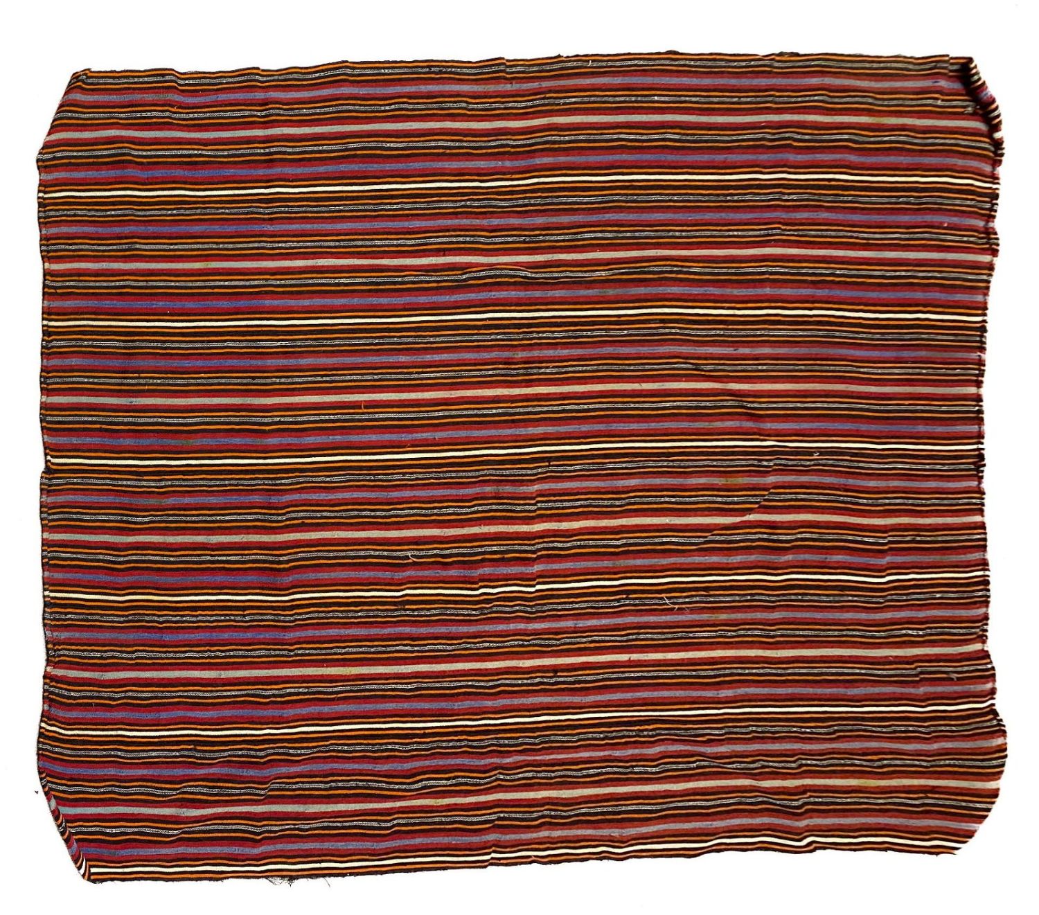 Vintage handmade area rug unknown origin, 93"l x 70"w Condition: Fair, some holes, some staining Dimensions: 93 x 70 in
