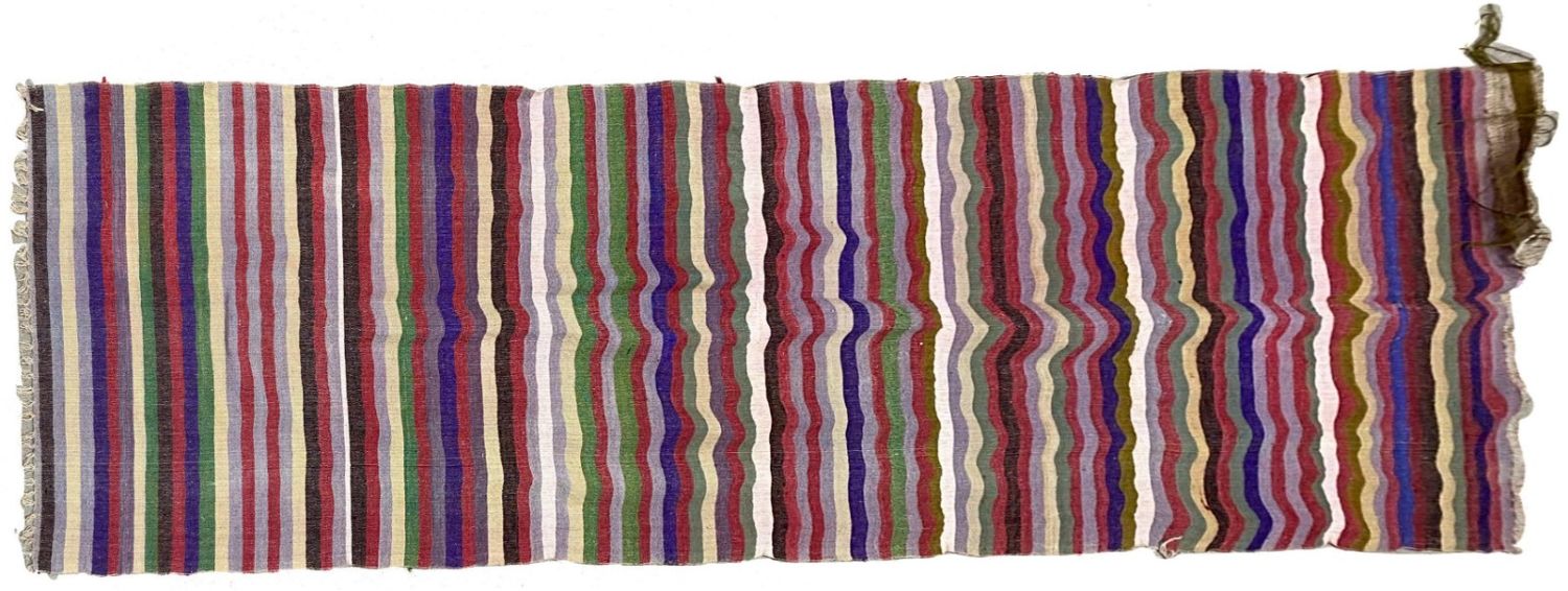 Vintage handmade Turkish Kilim runner, 134"l x 37"w Condition: Fair condition, some holes, frayed edge Dimensions: 134 x 37 in