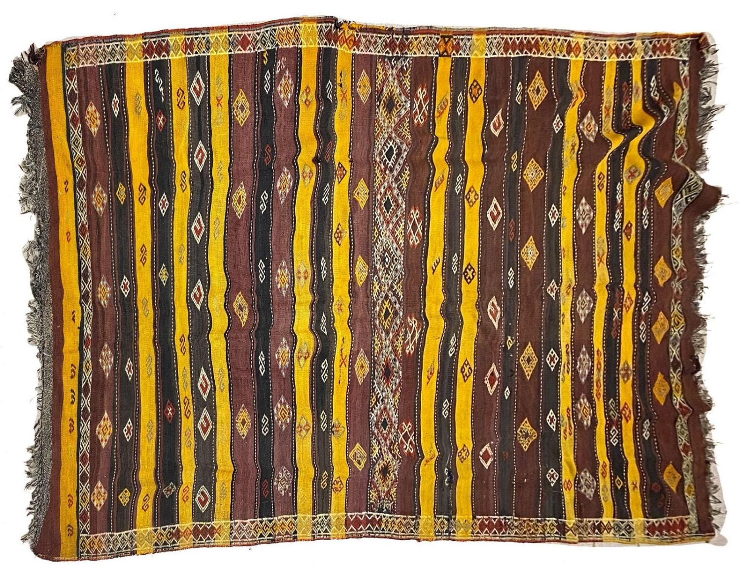 Vintage handmade possibly Soumak or Turkish Kilim area rug, 140"l x 74"w Condition: Fair, fraying on the edge, some holes, some fading, some staining Dimensions: 140 x 74 in