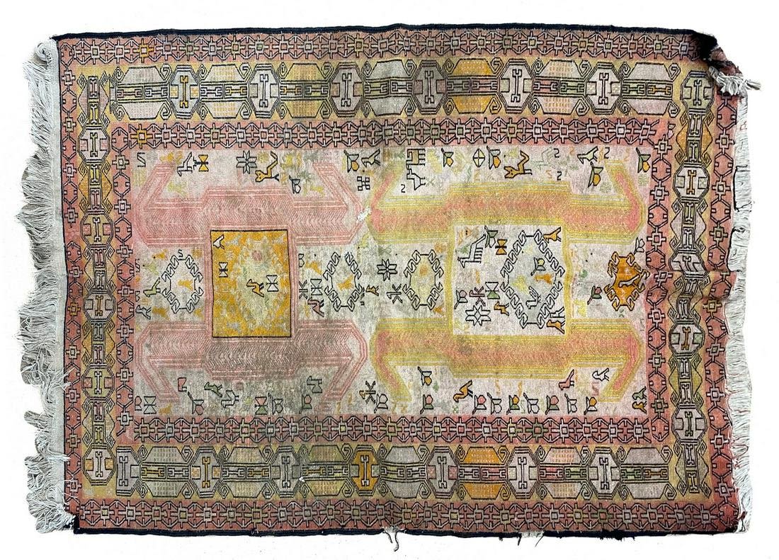 Vintage handmade Turkish Kilim prayer rug, 57"l x 38"w Condition: Fair, fraying on edges, A few holes, signs of wear Dimensions: 57 x 38 in