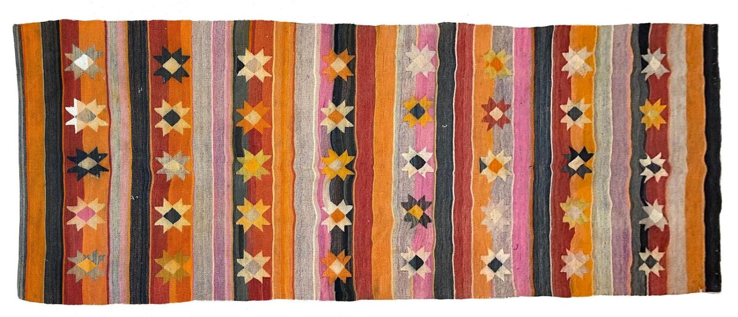 Vintage handmade Possibly Turkish Kilim runner, 143"l x 42"w Condition: Fair, color bleed, a few small holes, signs of wear Dimensions: 143 x 42 in