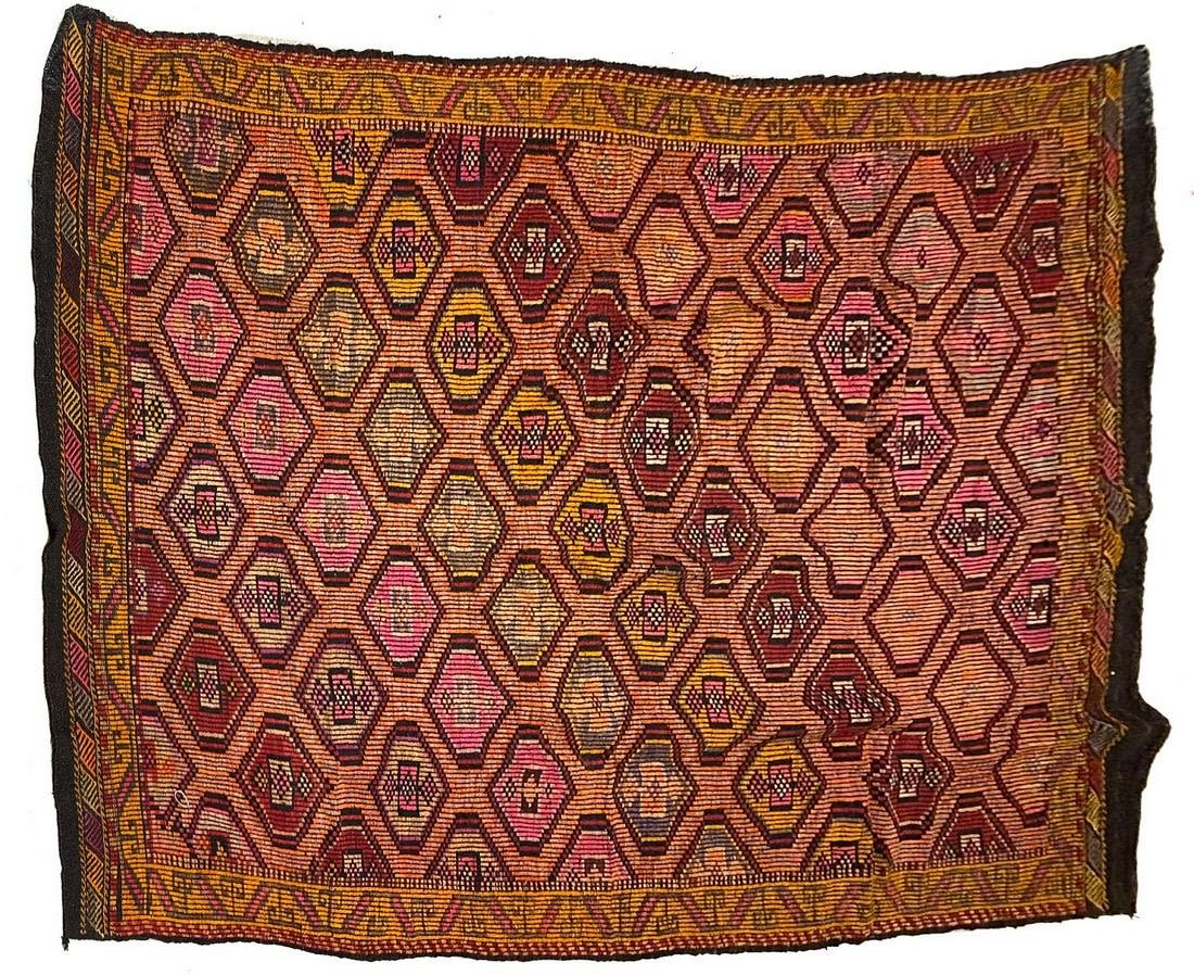 Condition: Fair, color bleed, fading, due to the handmade nature of this rug, there is an overall variation in width and length