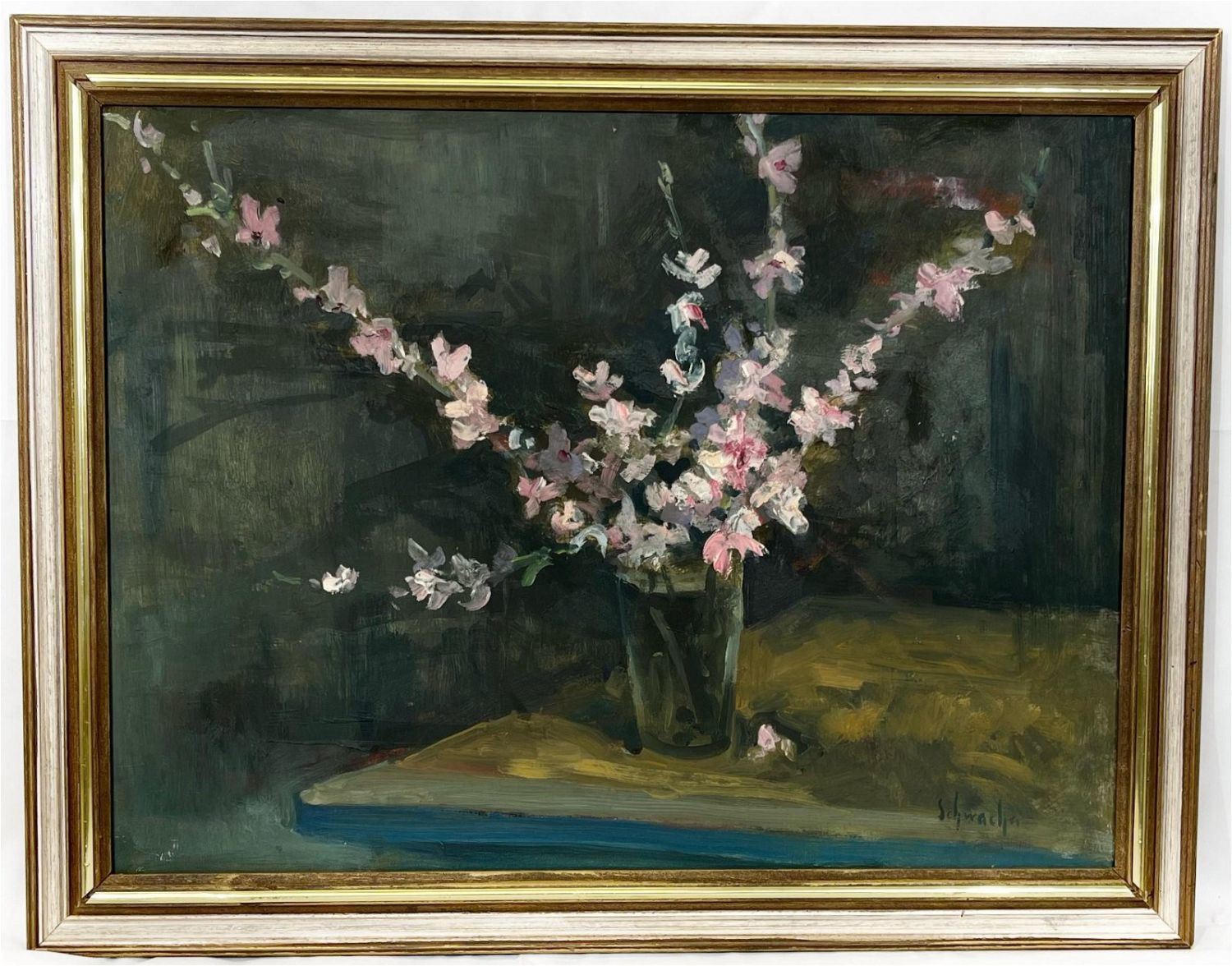 Oil on board, signed lower right, 17.5”h x 23.5”w (sight) 21.5”h x 27.5”w (frame) Condition: Good, a few minor nicks and scratches present Dimensions: 21.5 x 27.5 in