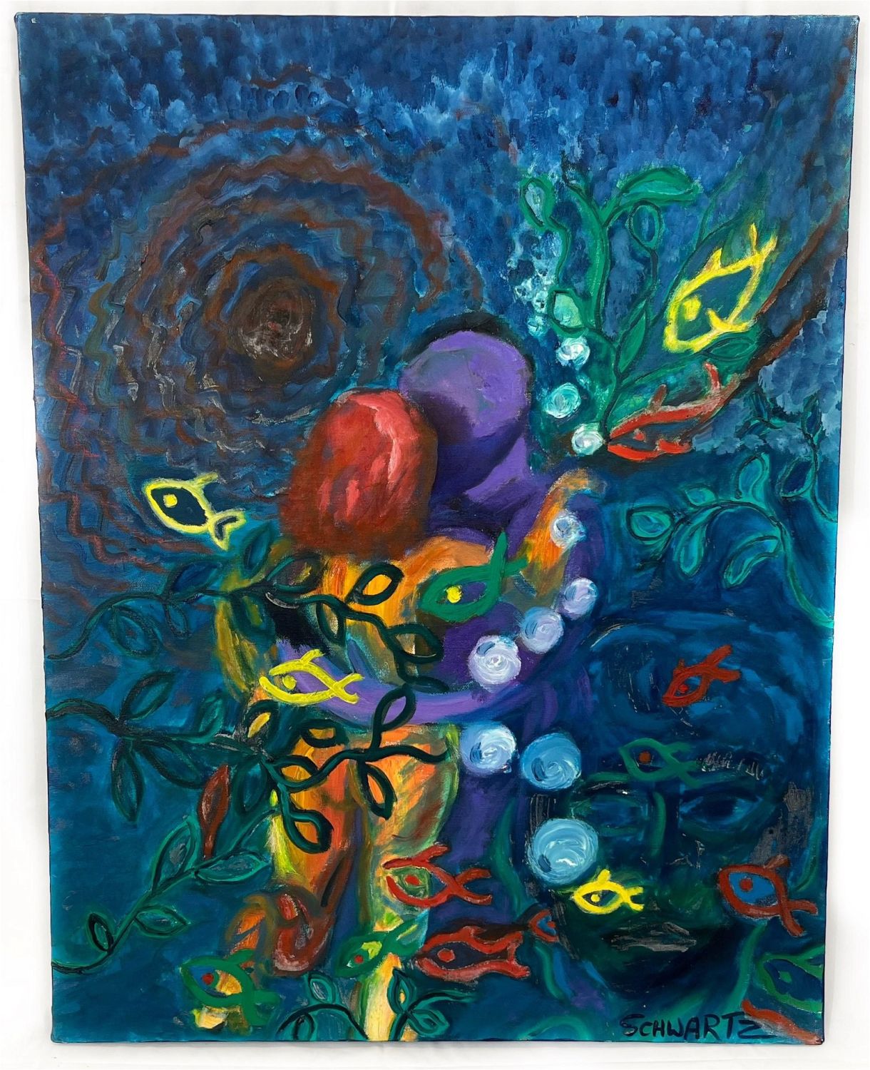 oil on canvas, unframed, signed Schwartz right lower, 28”h x 22”w Condition: Good Dimensions: 28 x 22 in
