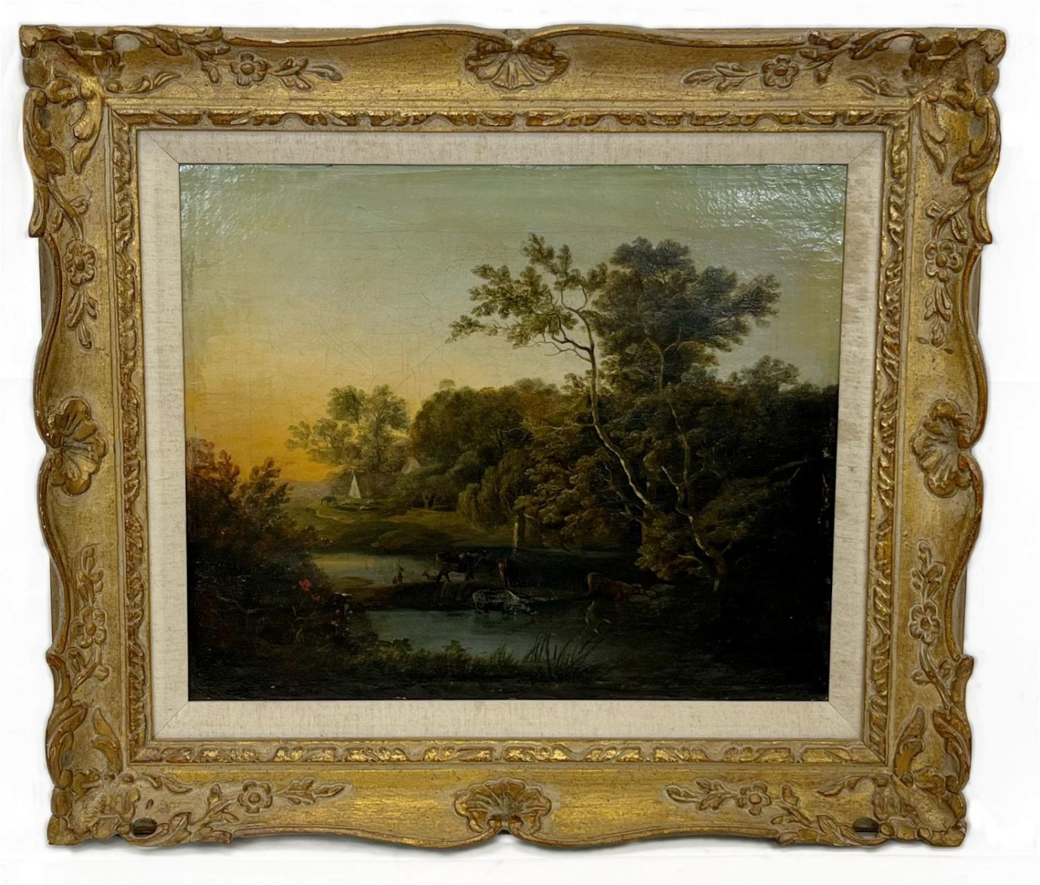oil on canvas, signed on verso, old label on verso, 14.5”h x 17.5”w (sight) 21.5”h x 24”w (frame) Condition: Fair, craquelure, possible signs of restoration Dimensions: 21.5 x 24 in