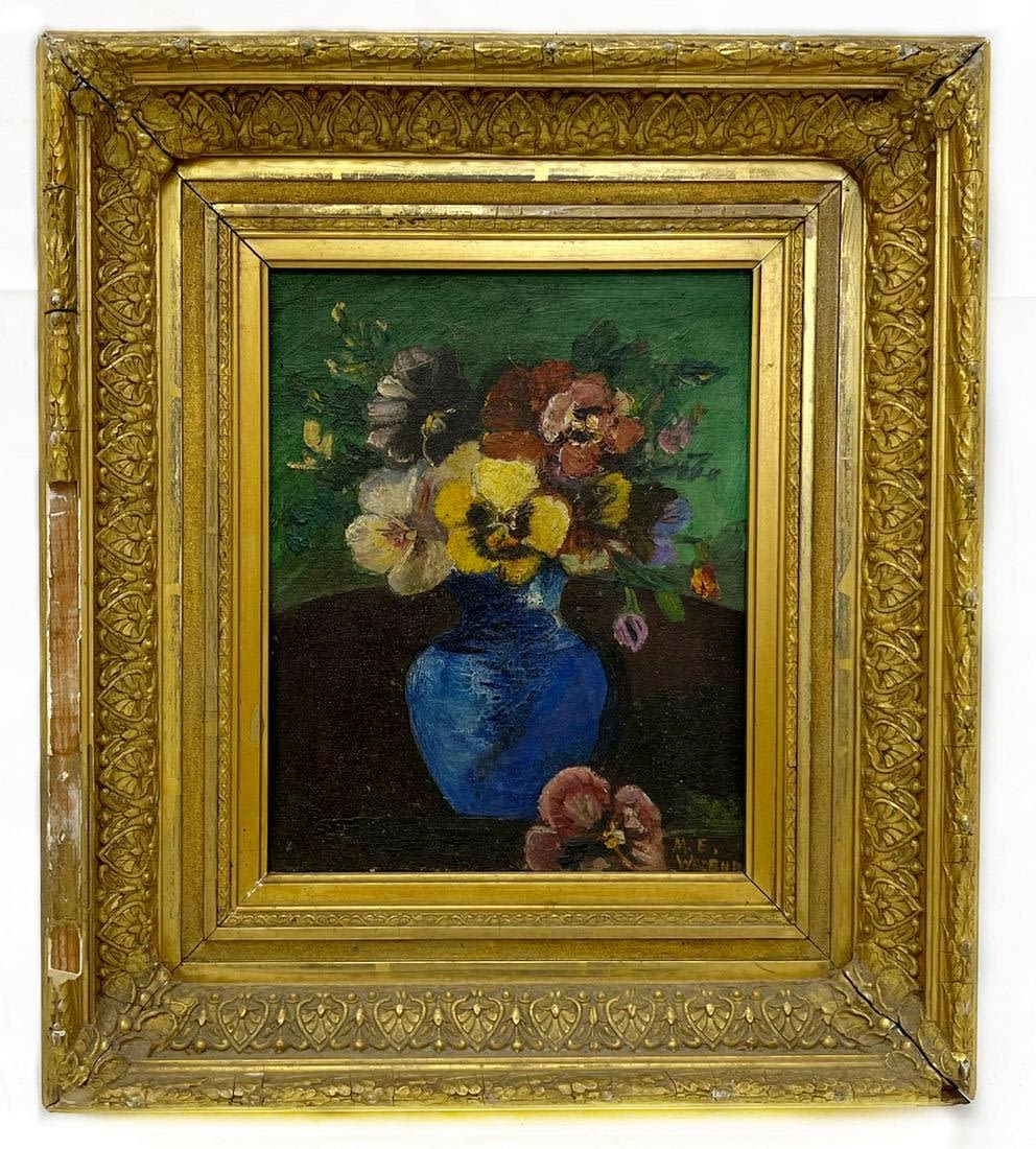 oil on canvas mounted on board, signed possibly M. E. Weburn lower right, 9.5”h x 7.5”w (sight) 16.5”h x 14.5”w (frame) Condition: Good, frame in poor condition Dimensions: 16.5 x 14.5 in