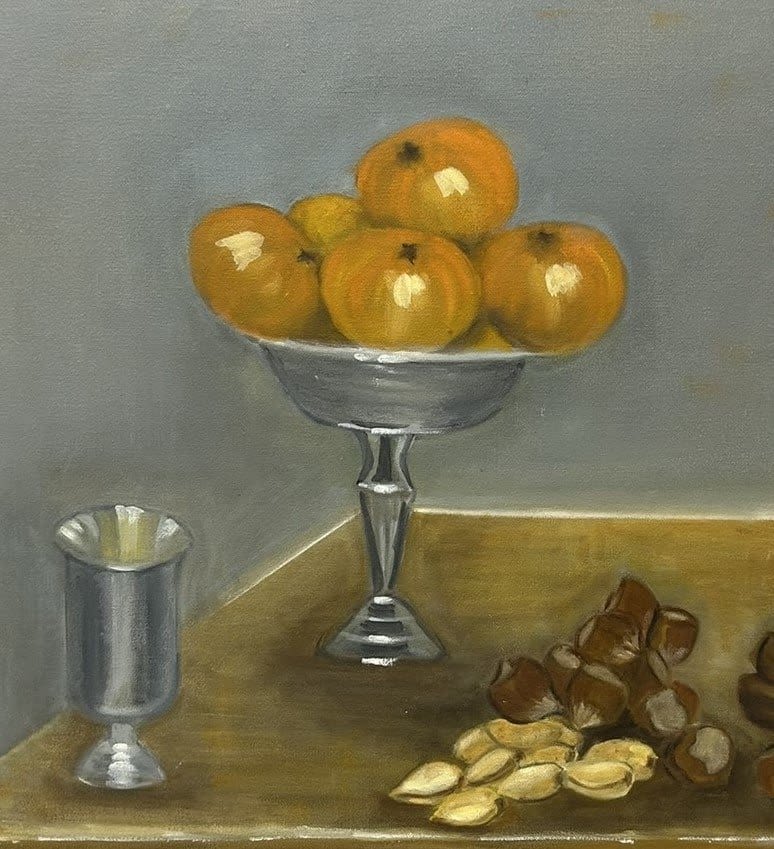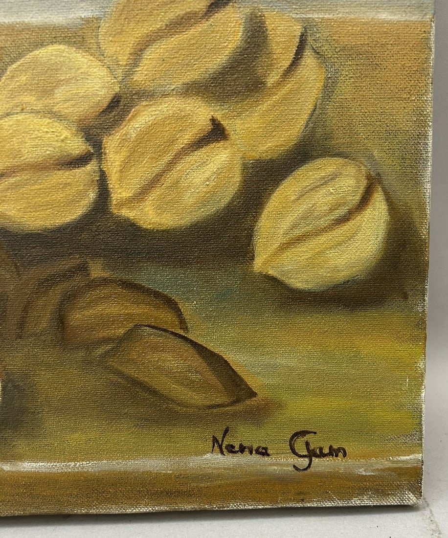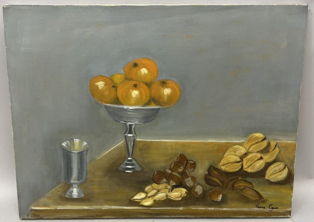 Oil on Canvas Still Life Painting, Signed by Neria Gun? at Lower Right, canvas size 18"h x 20"w Condition: Good