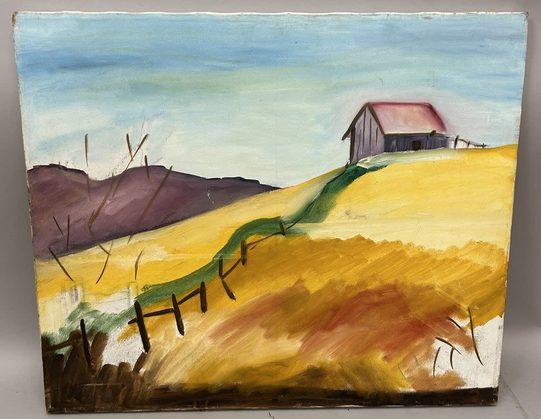 Oil on Canvas Landscape Painting, Illegibly Signed Verso, canvas size 20"h x 24"w Condition: Good, minor scratches and scuffs, sign of age and use