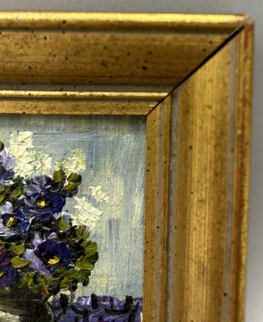 Framed Vintage Oil on Canvas Still Life Painting by Irene Rozek, Frame: 4.5"h x 4.5"w -Sight: 3"h x 3"w Condition: Good, minor scratches and chips on frame