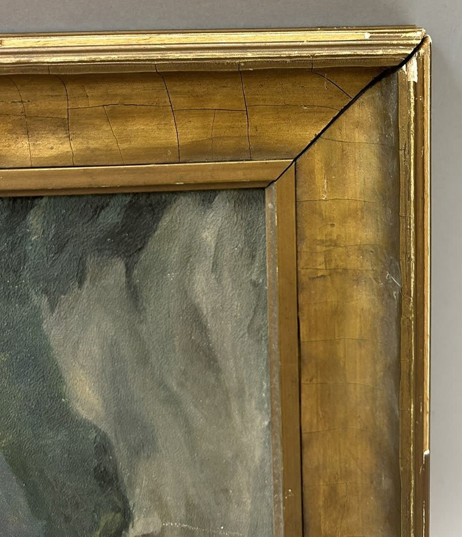 Vintage landscape painting with frame, unsigned, frame size 14”h x 20.25”w and sight size 5”h x 10.5”w