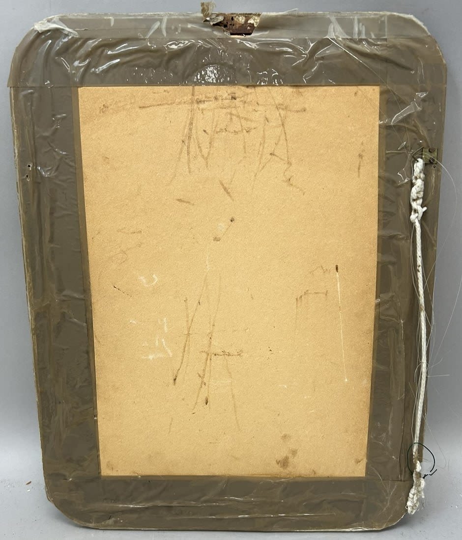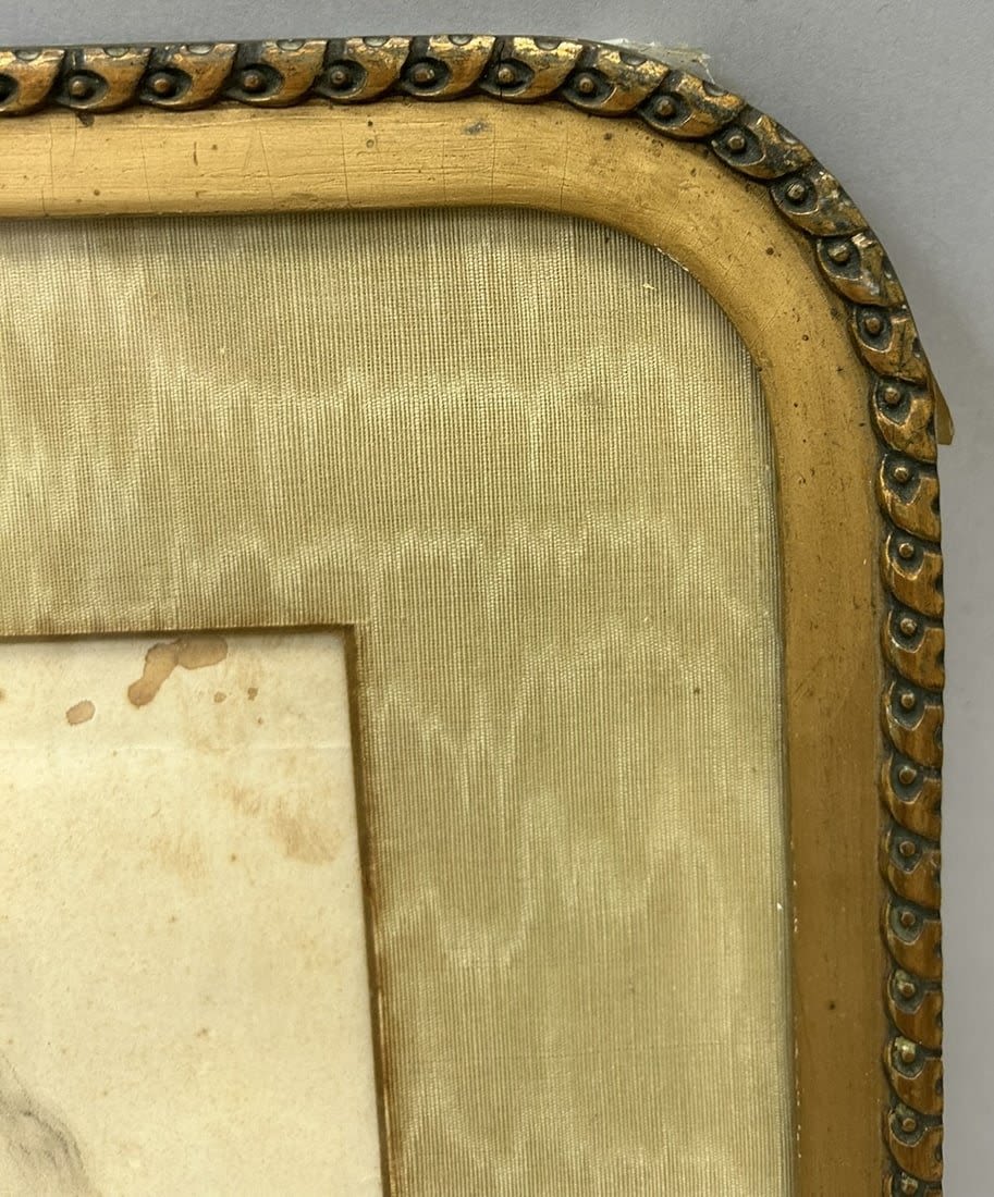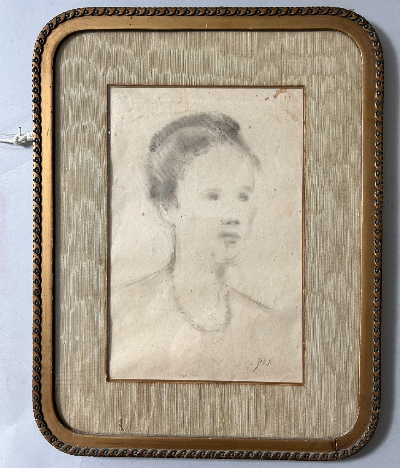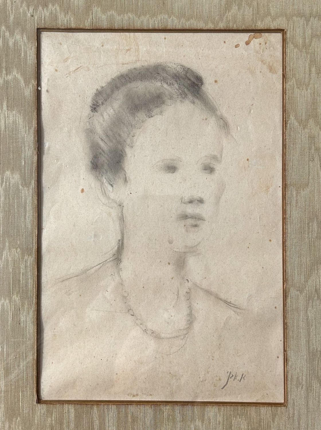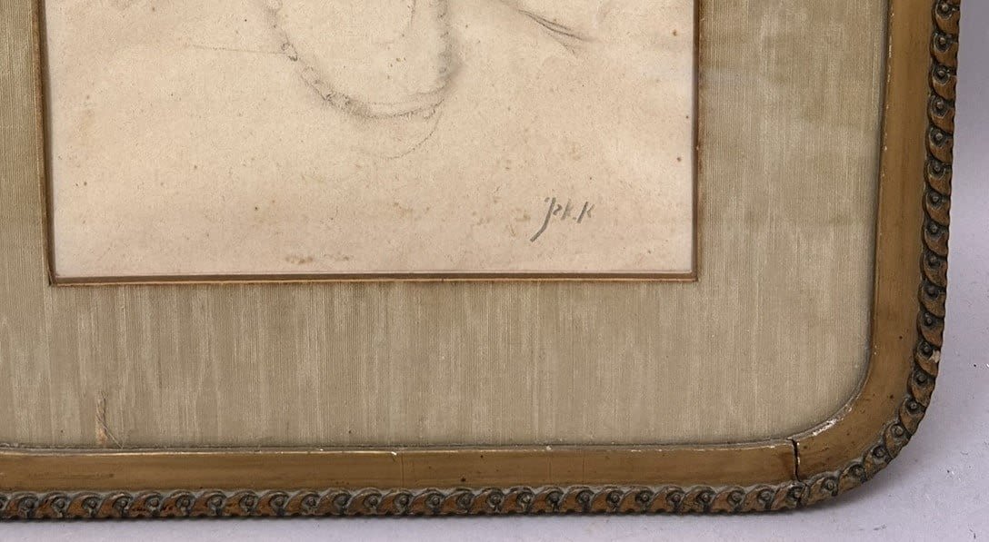 Antique Framed Pencil Drawing on Paper Woman Portrait by J. K. K. ?, Frame bronze gilded in front, frame size 17.5”h x 13.5”w and sight size 11.5”h x 7.5”w