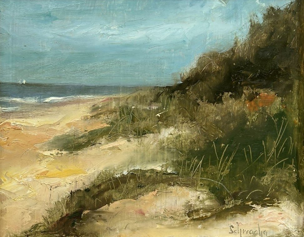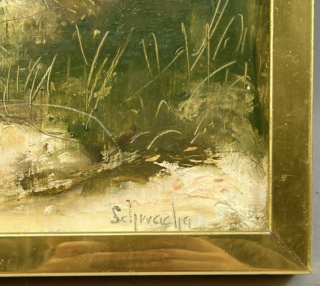 Framed Oil on Board Seascape Painting, Signed by Schwacha, frame size 9”h x 11”w and sight size 7.5”h x 5.5”w Condition: Good, minor scratches on painting and on frame, sign of use and age
