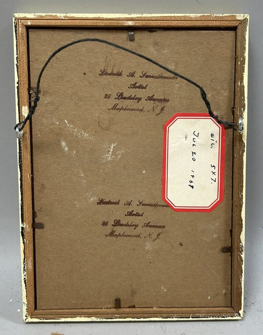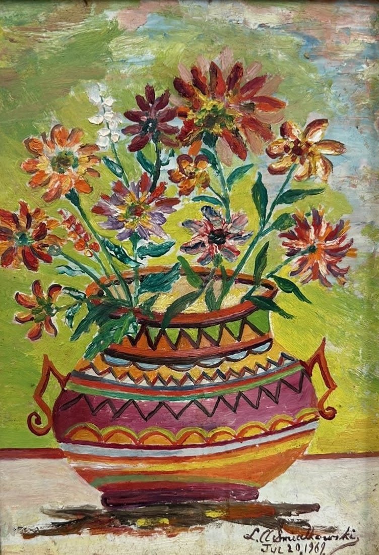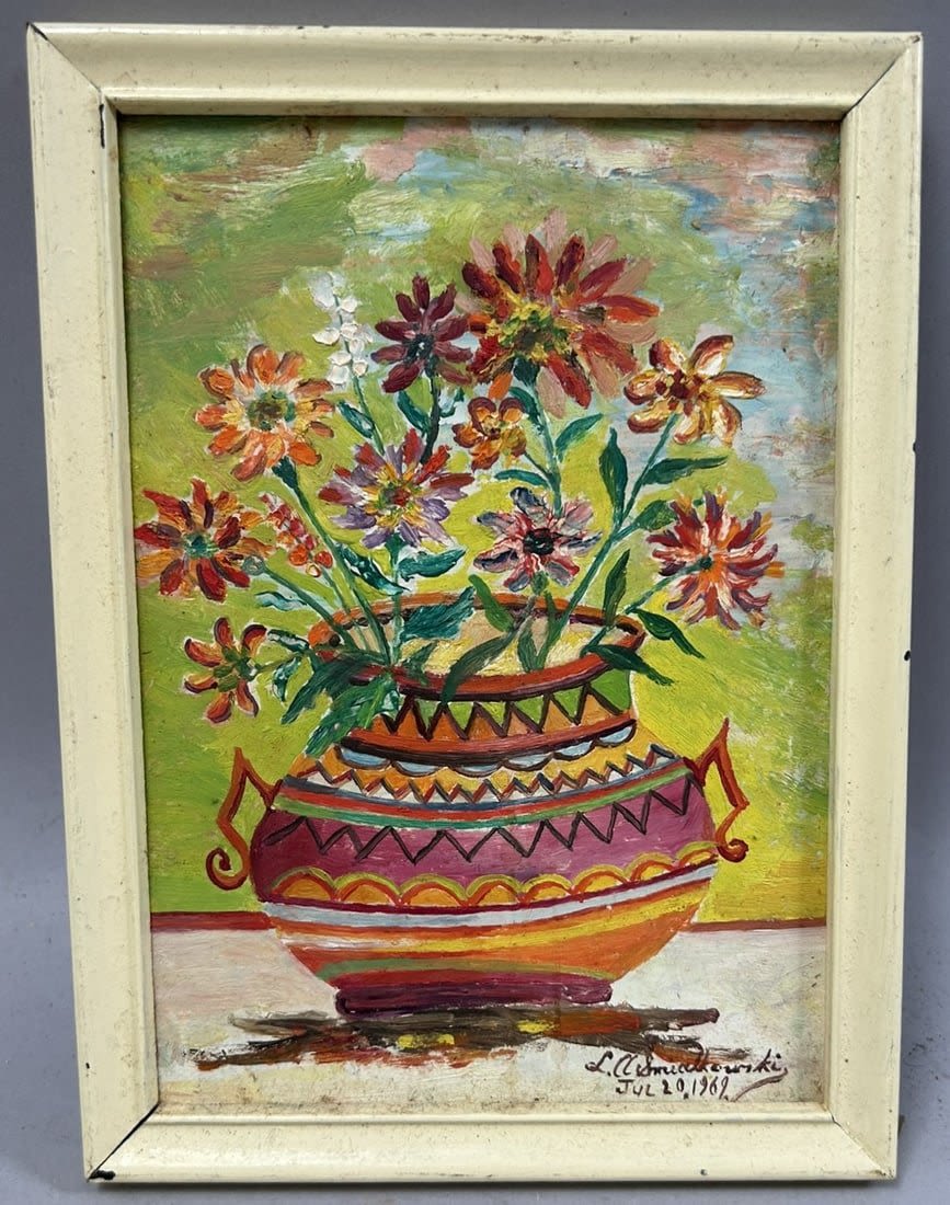 Framed Vintage Oil on Board Still Life Painting by L. A . Smialkowski, July. 1969, frame size 7.5”h x 5.5”w and sight size 6.5”h x 4.5”w Condition: Good