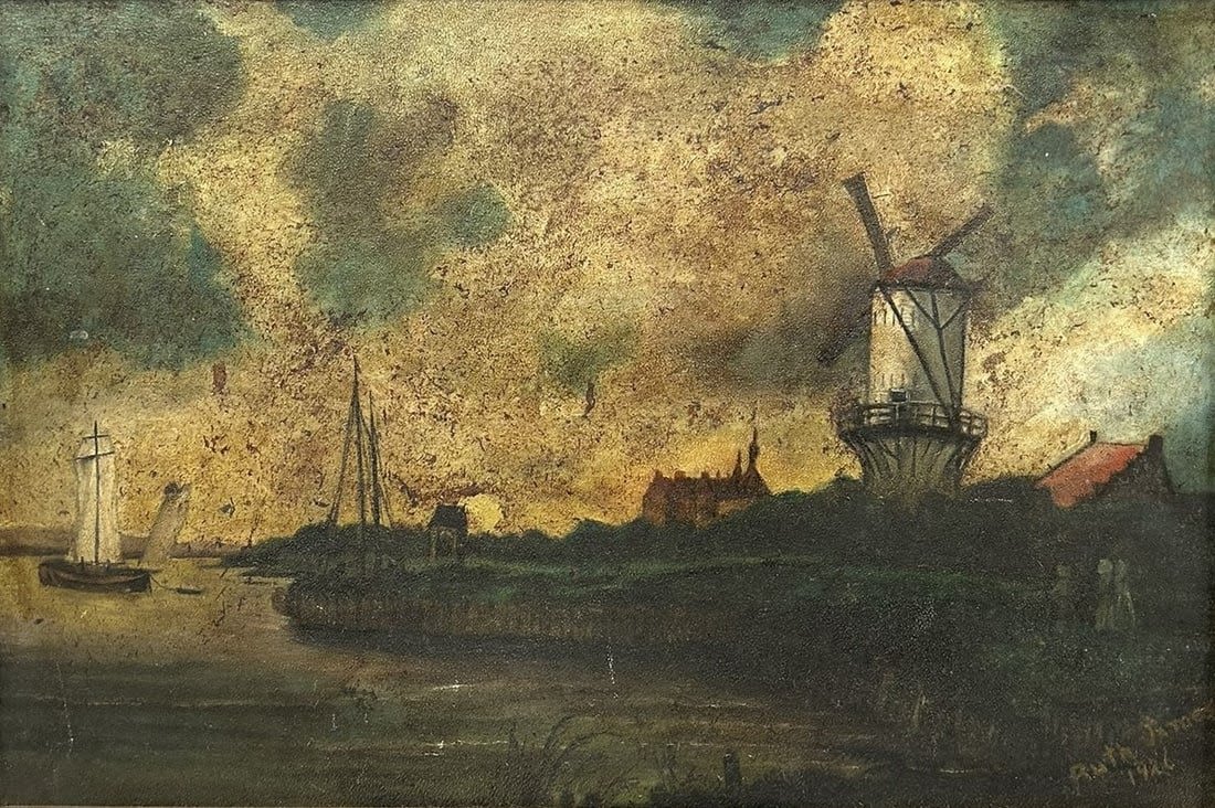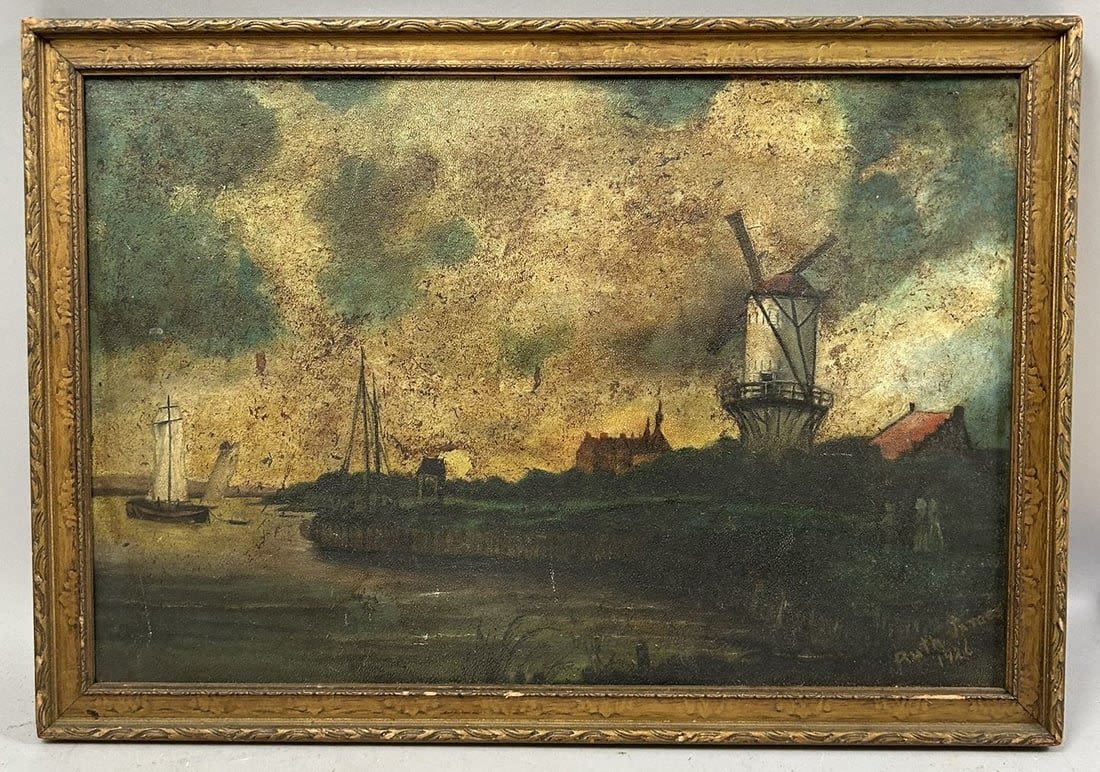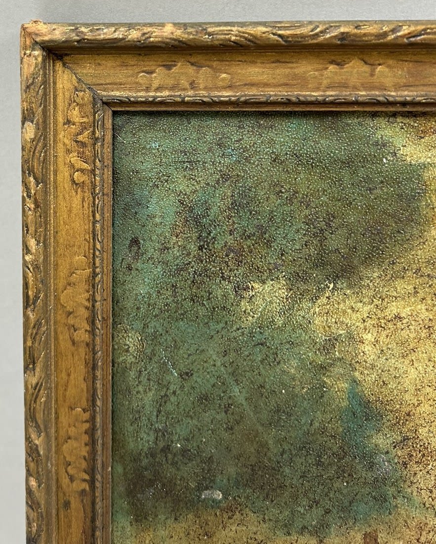 Condition: Fair with minor paint loss and staining, slightly dented on upper right, some surface dirt, chips and scratches on frame, sign of use and age