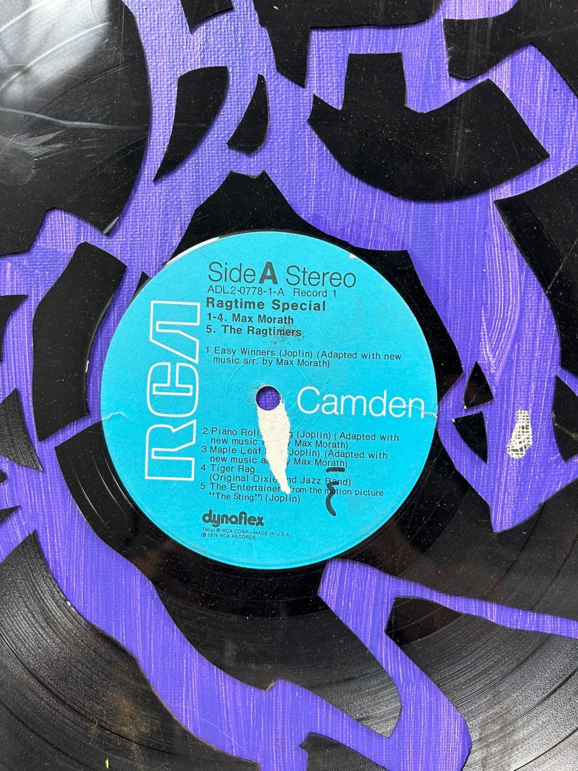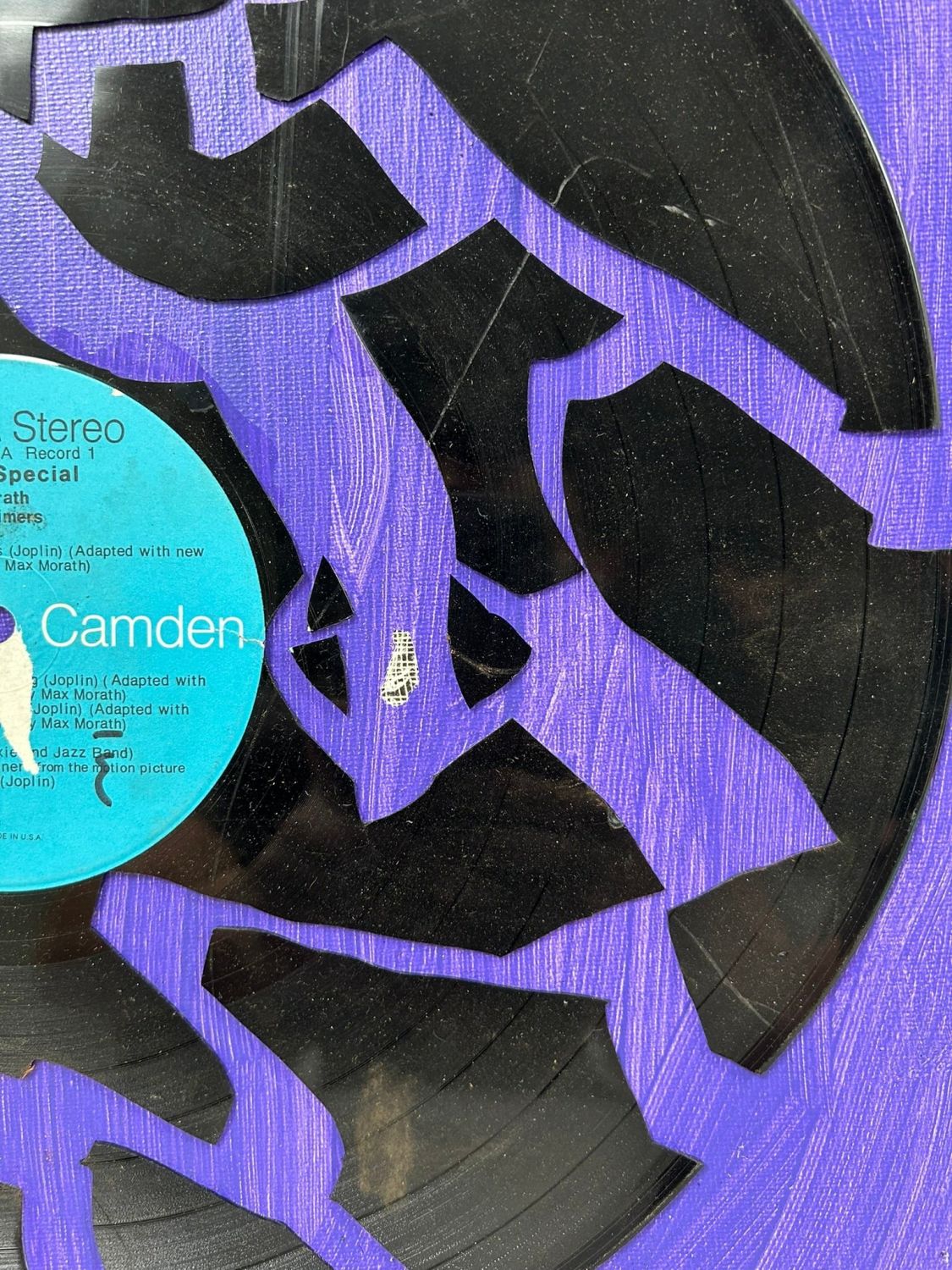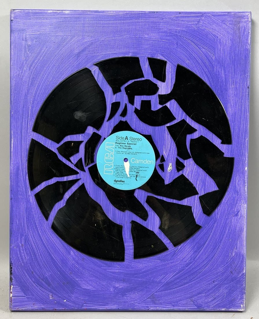 Mixed Media Art, Cracked Record on Oil on Canvas, Unsigned, canvas size 20”h x 16”w Condition: Good