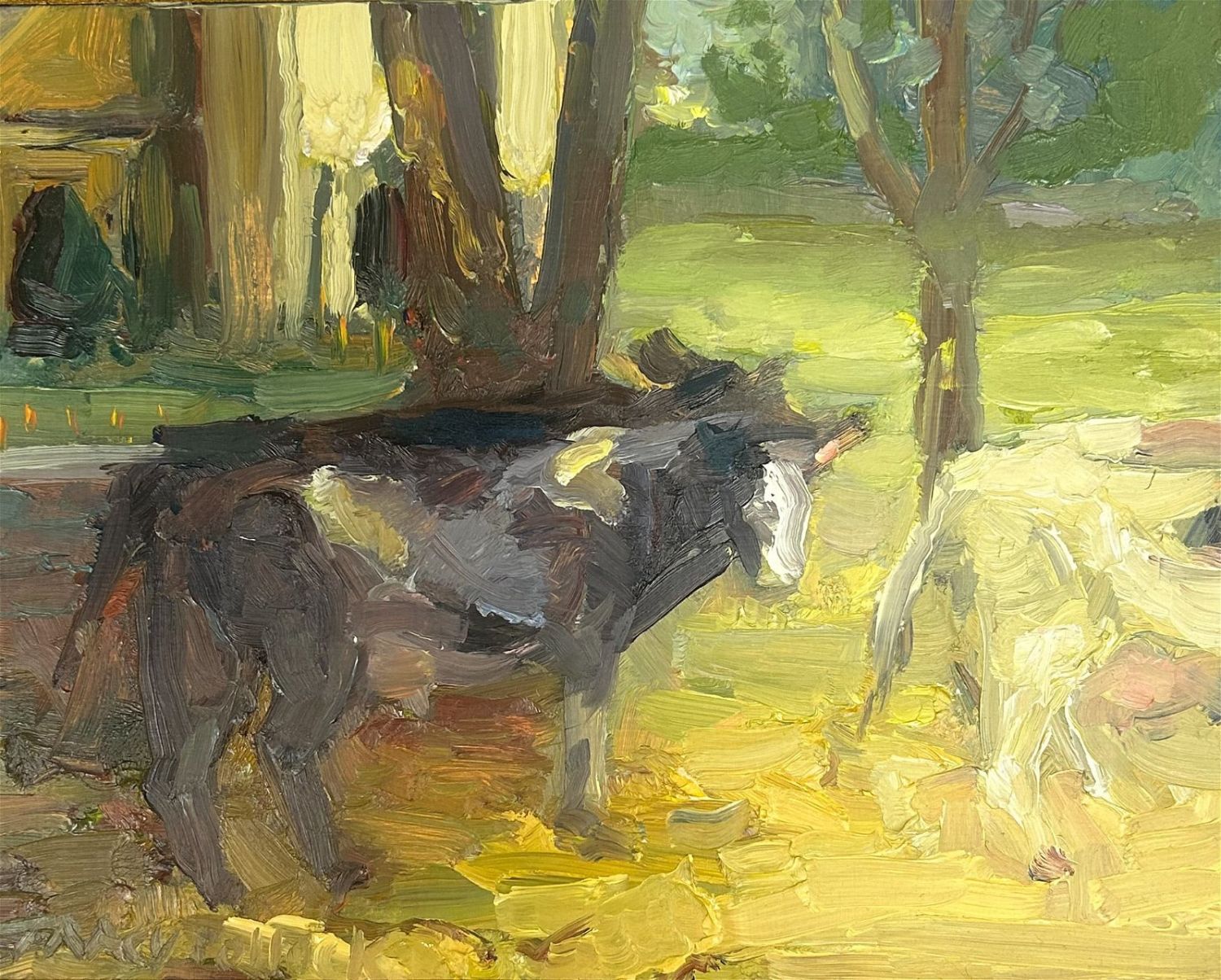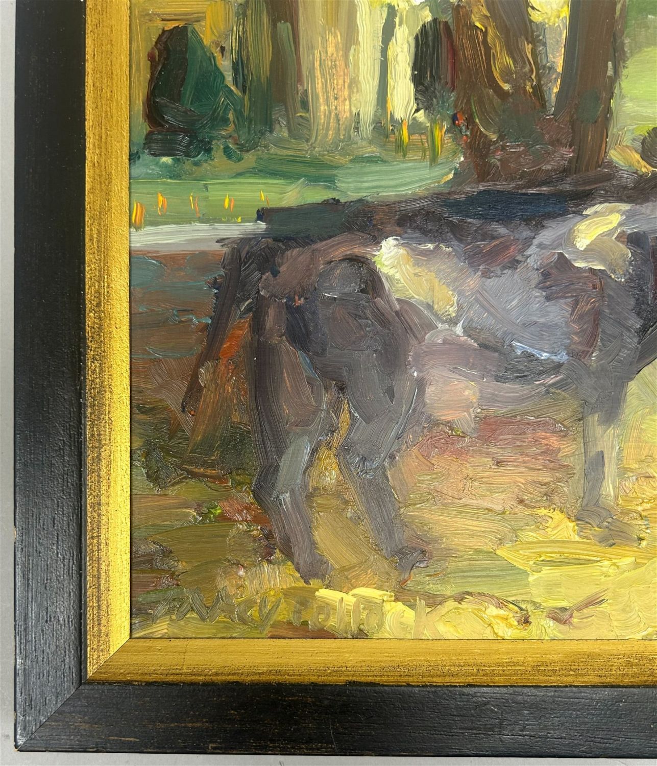 Vintage Oil on Canvas Board Cow in Farmscape Illustrative Painting, Signed by Mary Pollock, frame size 10”h x 14”w and sight size 7.5”h x 9.5”w Condition: Good, minor scratches on frame