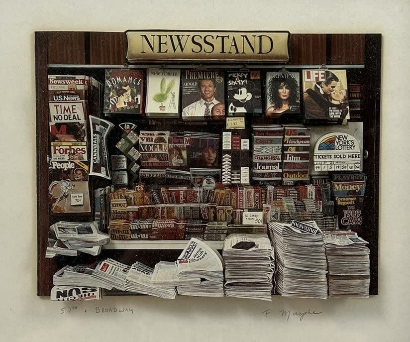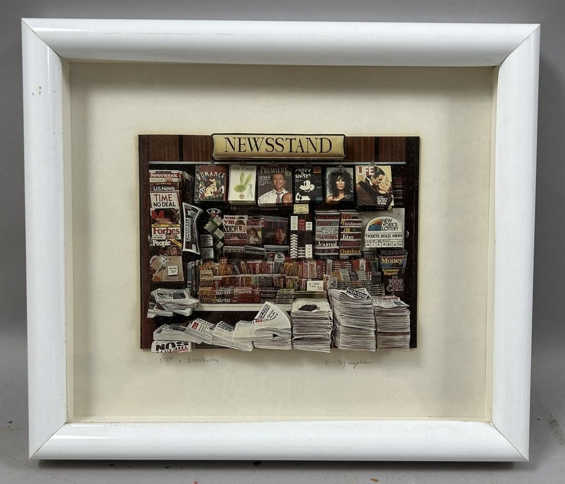 Mixed Media Art, Newstand by F. Mauphe, frame size 11”h x 13”w and sight size 6”h x 7”w