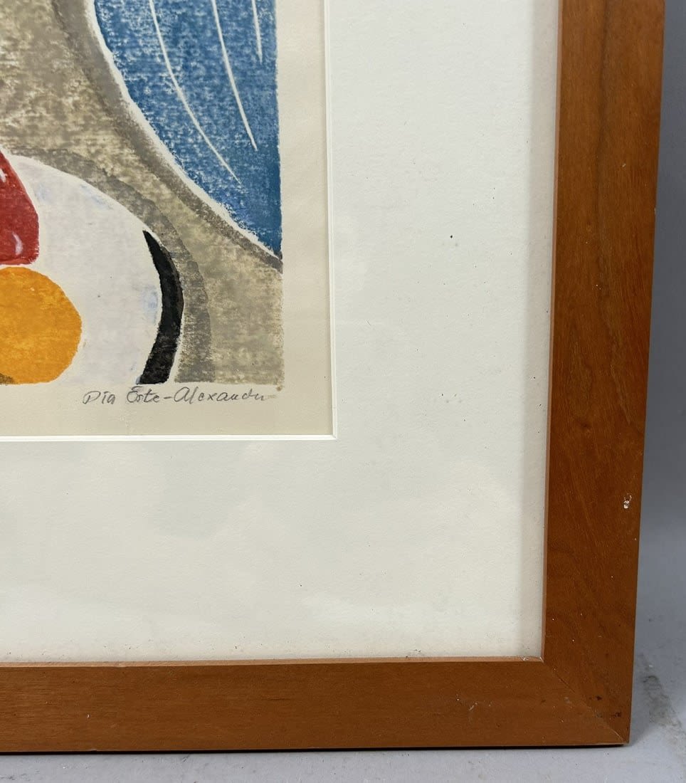 Vintage Abstract Color Woodblock Print, Pencil Signed by Pia Oste-Alexander at Lower Right and Titled as ”Leaves”, frame size 16”h x 13.5”w and sight size 9”h x 7”w