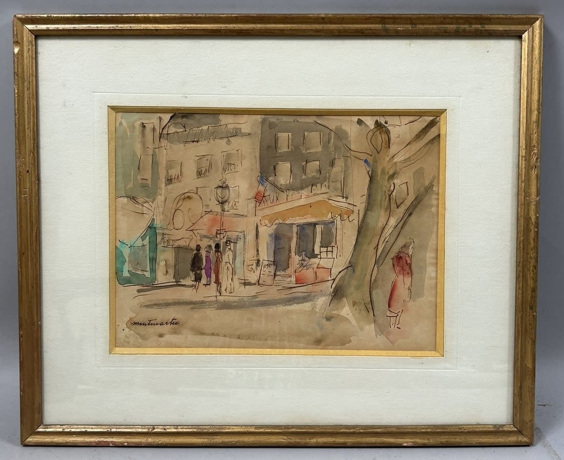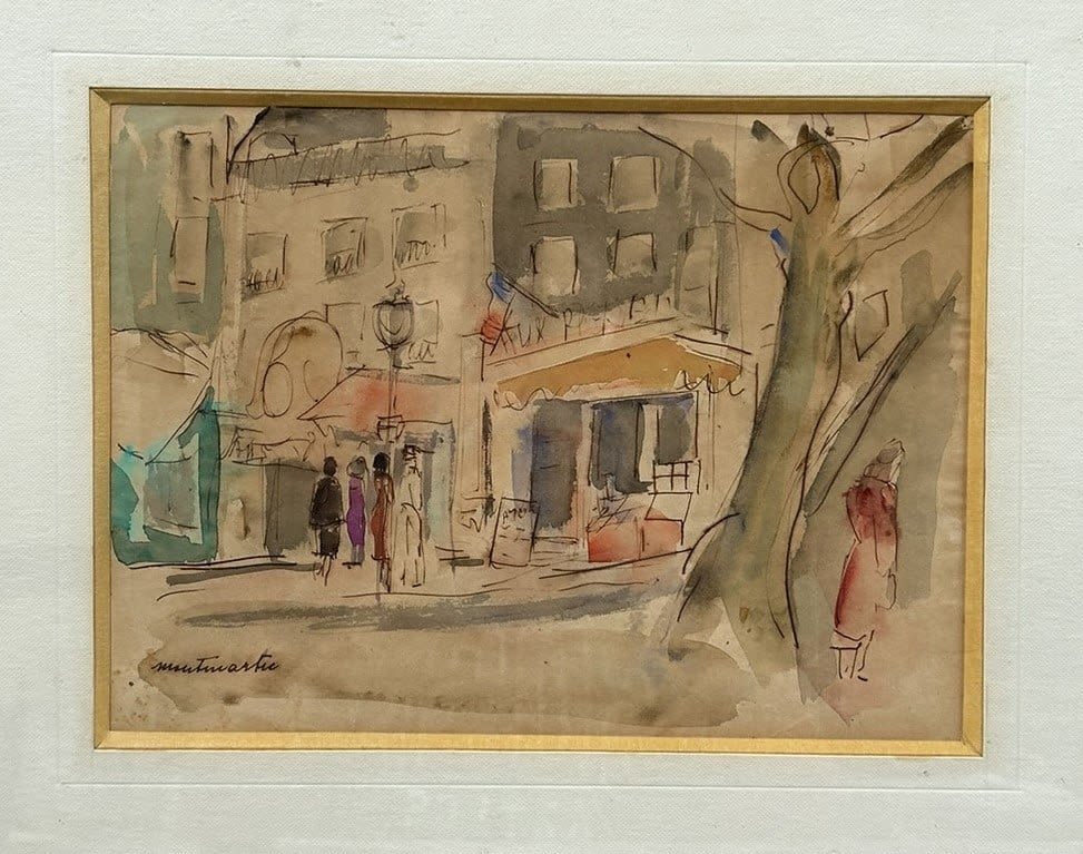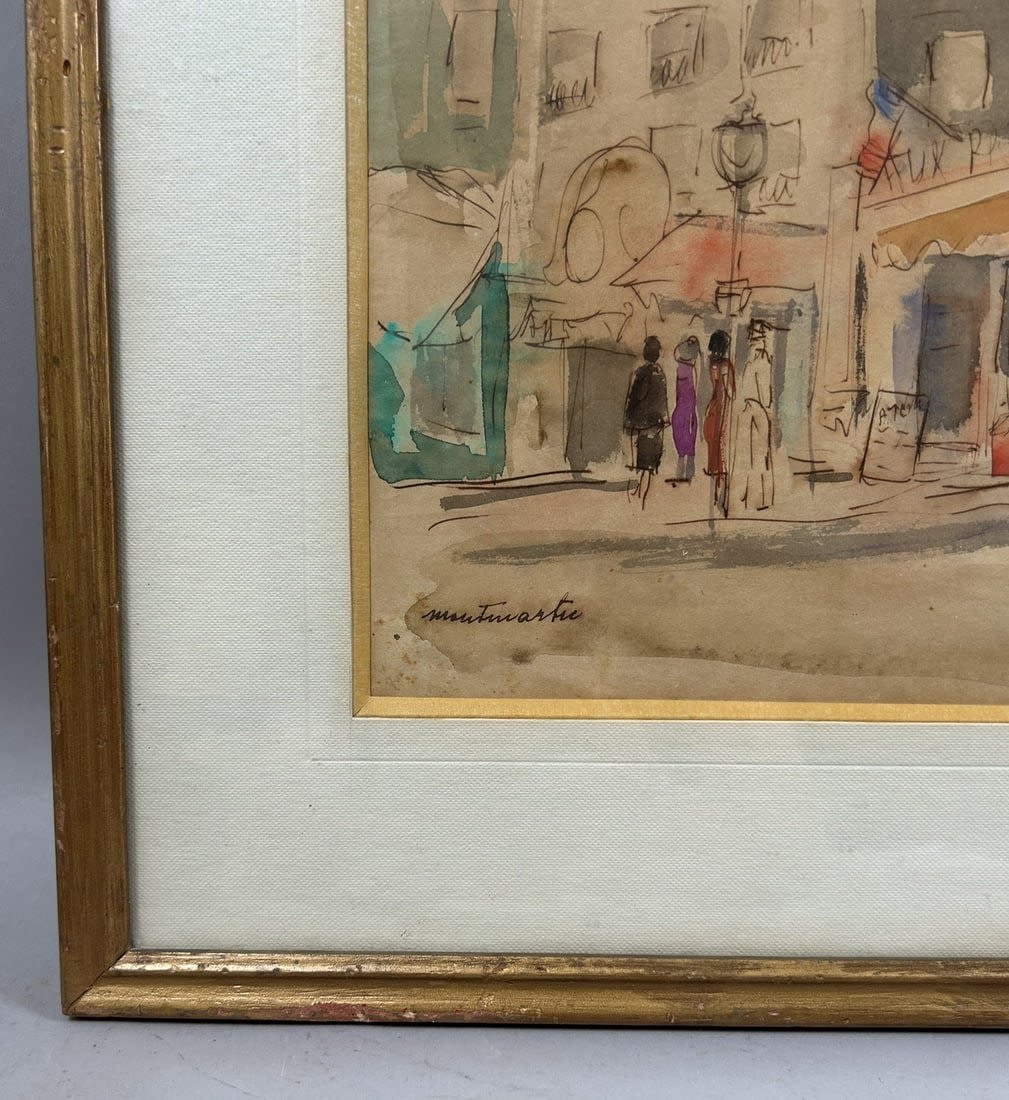 Vintage Watercolor Montmartre City Scene Painting, frame size 13.5”h x 16”w and sight size 7.5”h x 10.5”w