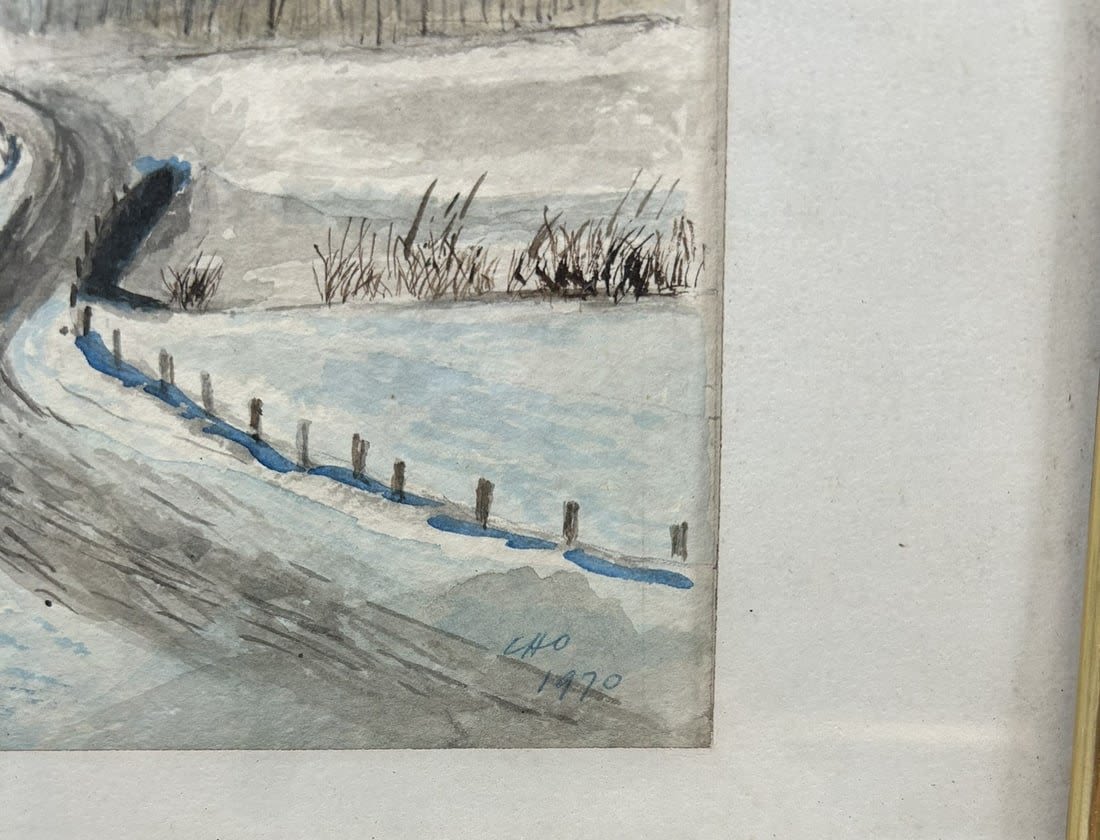 Vintage Watercolor Winterscape Painting, Signed by Cho 1970, frame size 13”h x 16”w and sight size 7.5”h x 9.5”w