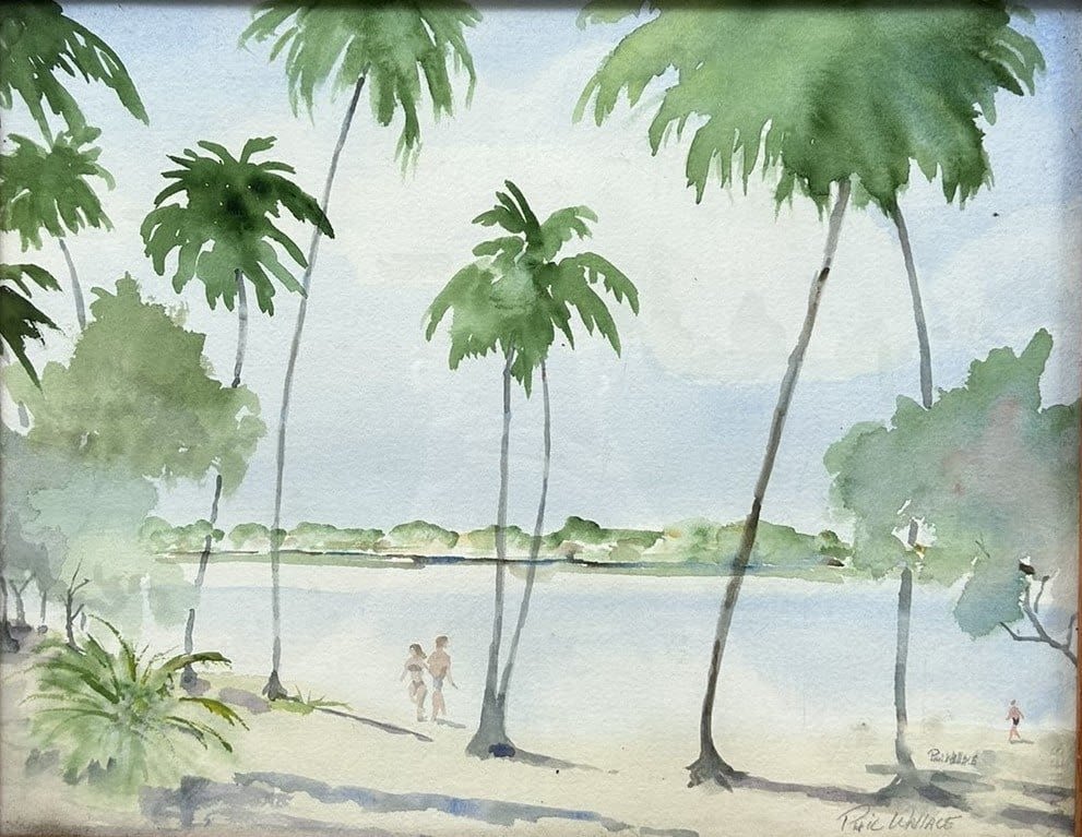 Vintage Watercolor Beach Scene, Signed by Phil Wallace, frame size 13.5”h x 16.5”w and sight size 10.5”h x 13.5”w Condition: Fair, minor scratches on frame