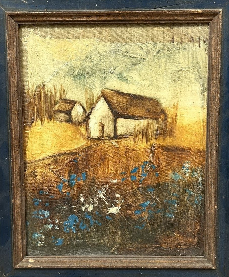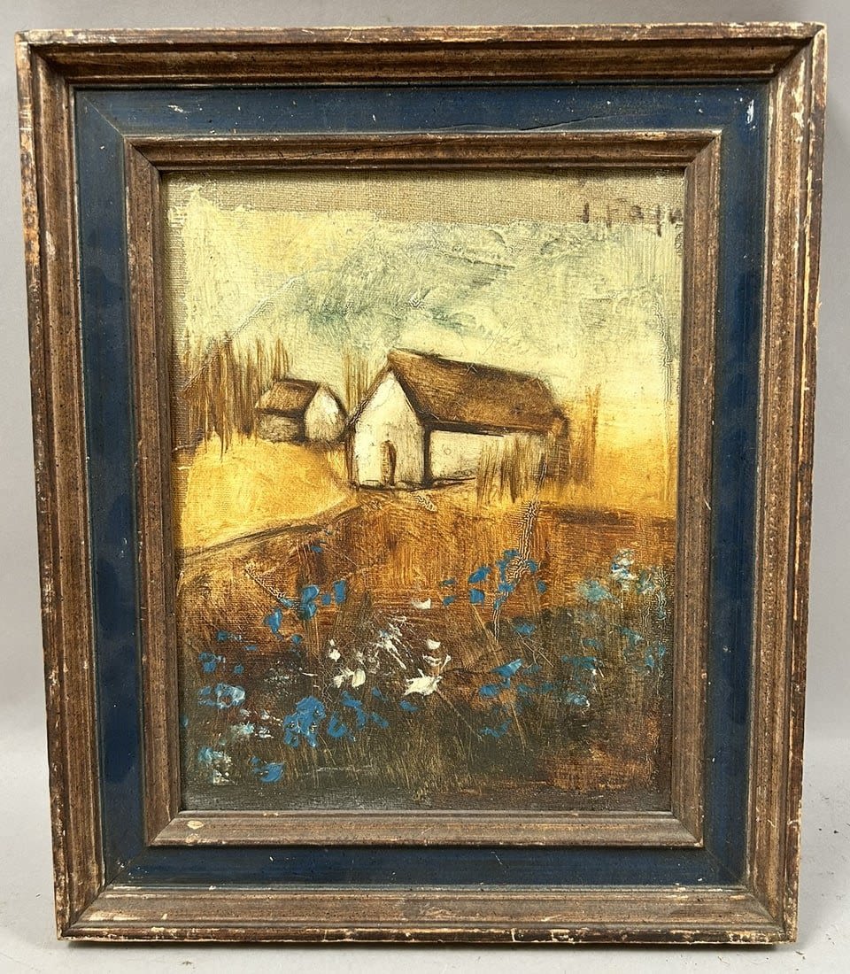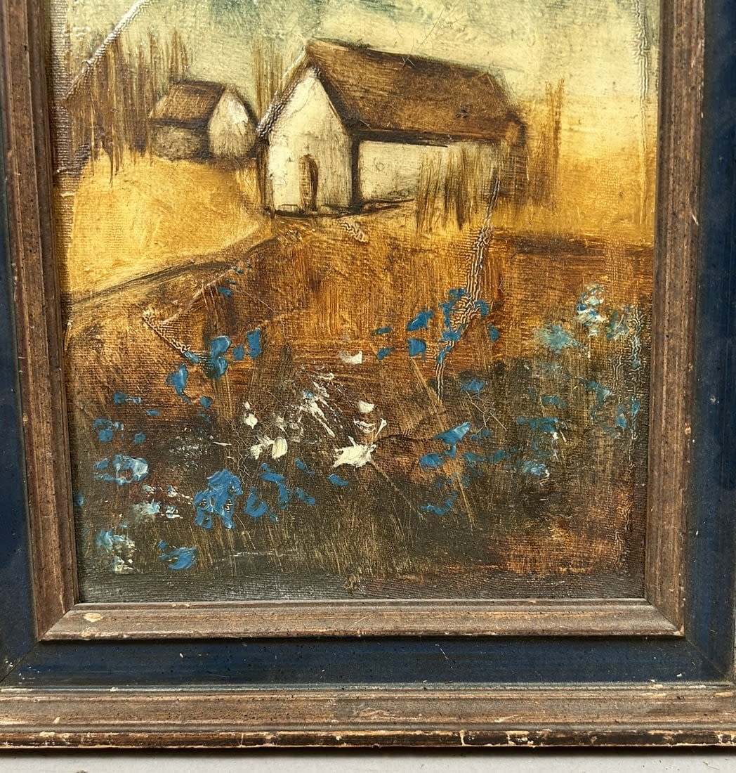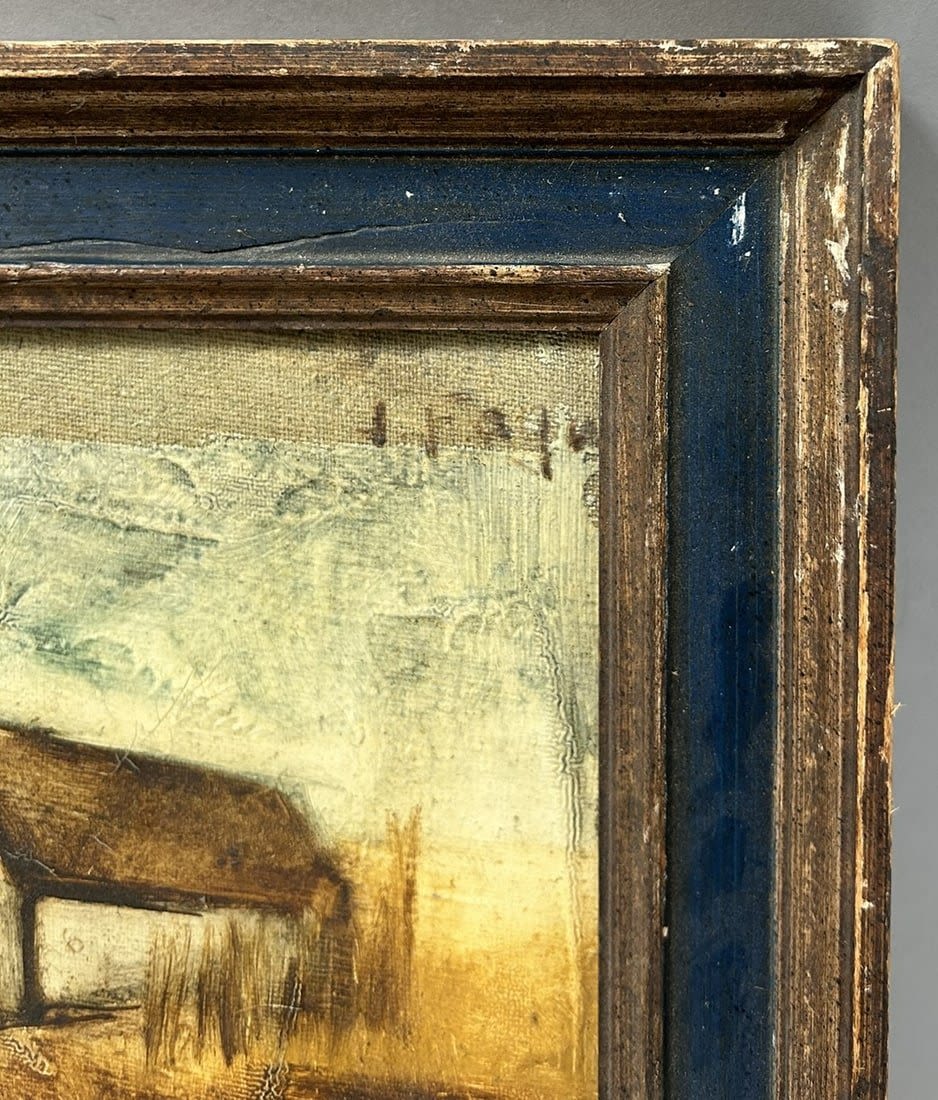 Vintage Oil on Canvas Farm Landscape Painting, Illegibly Signed at Upper Right, frame size 13”h x 11”w and sight size 9.5”h x 7.5”w