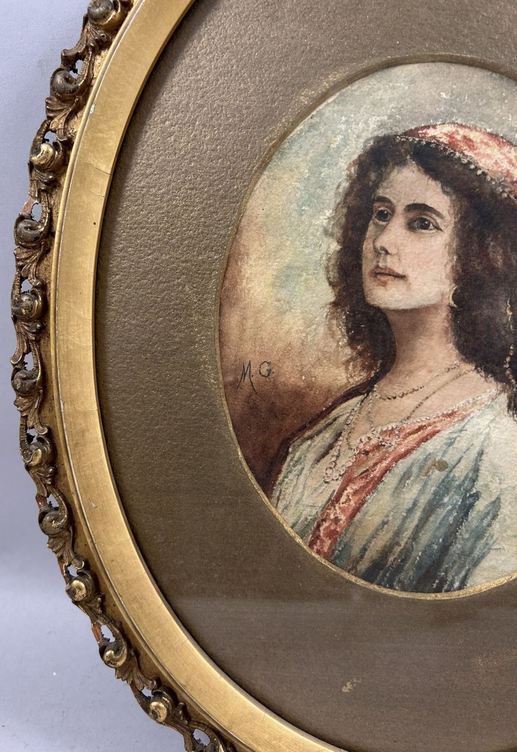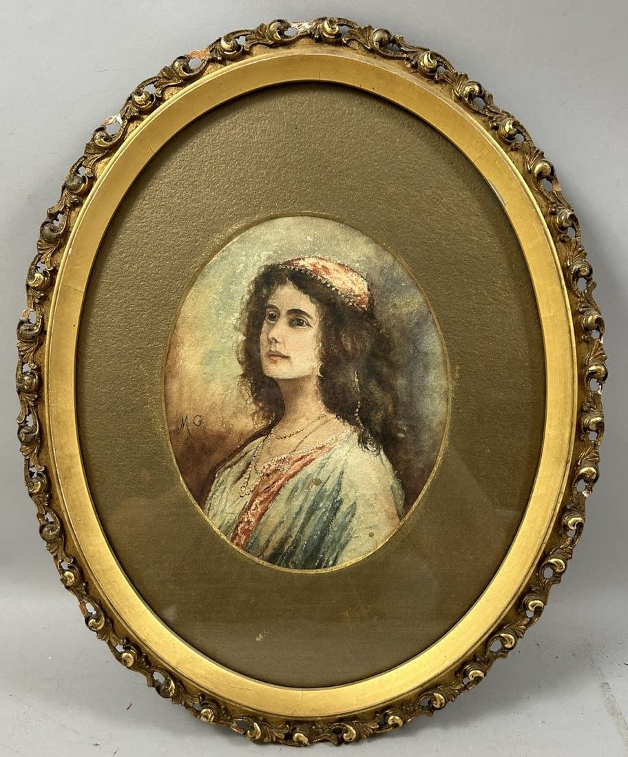 Vintage Watercolor Woman Portrait, Signed by M.G., frame size 16”h x 13”w and sight size 8”h x 6.5”w