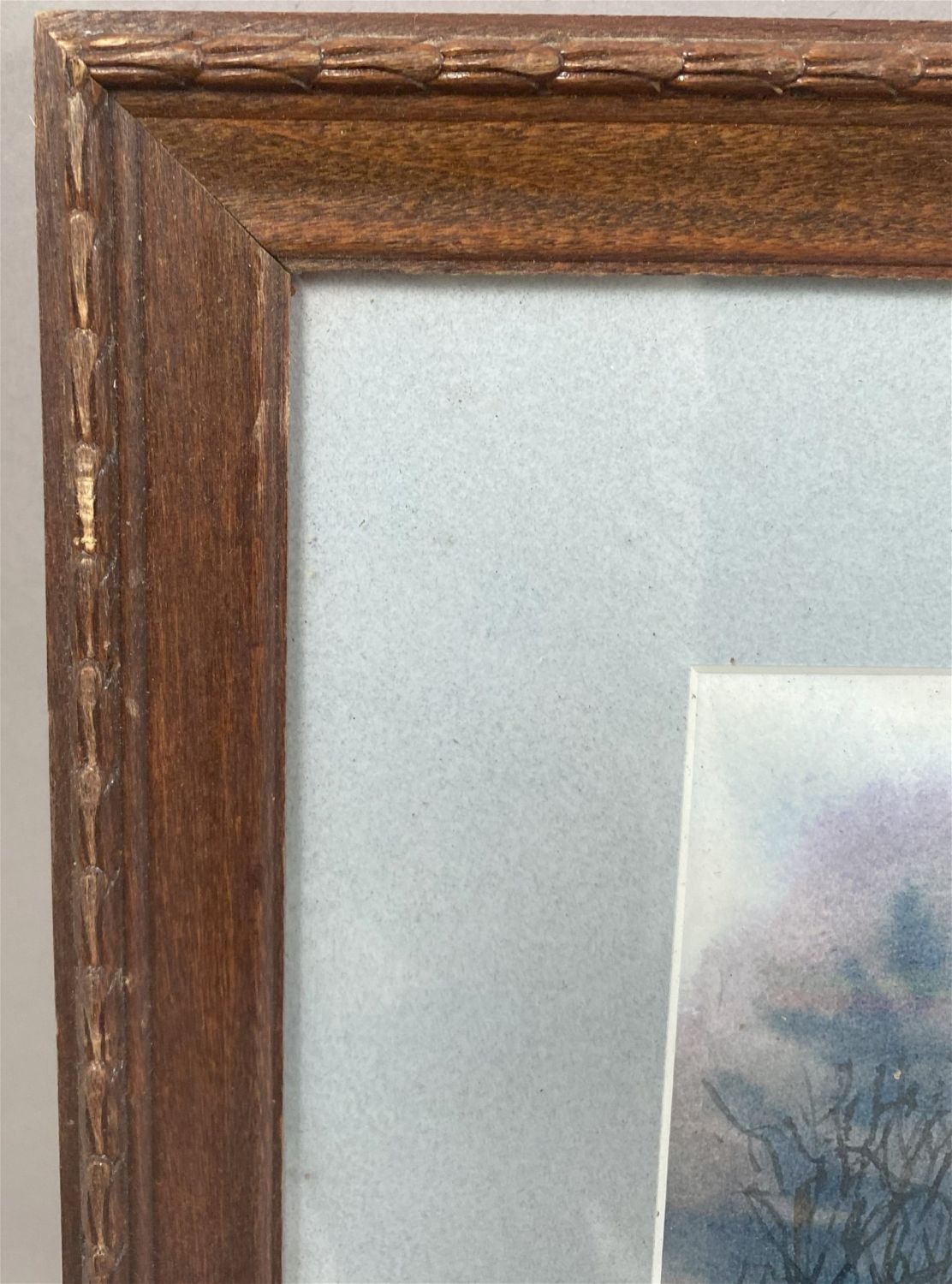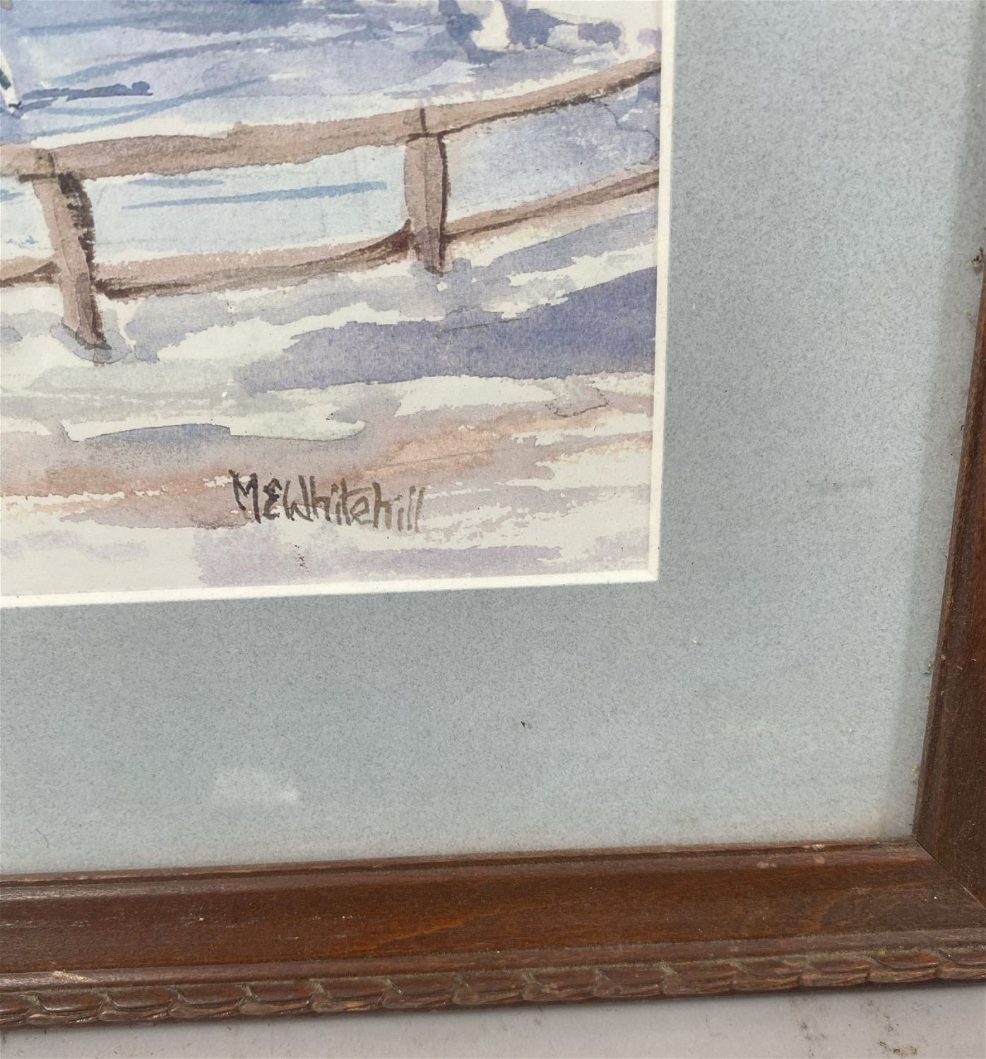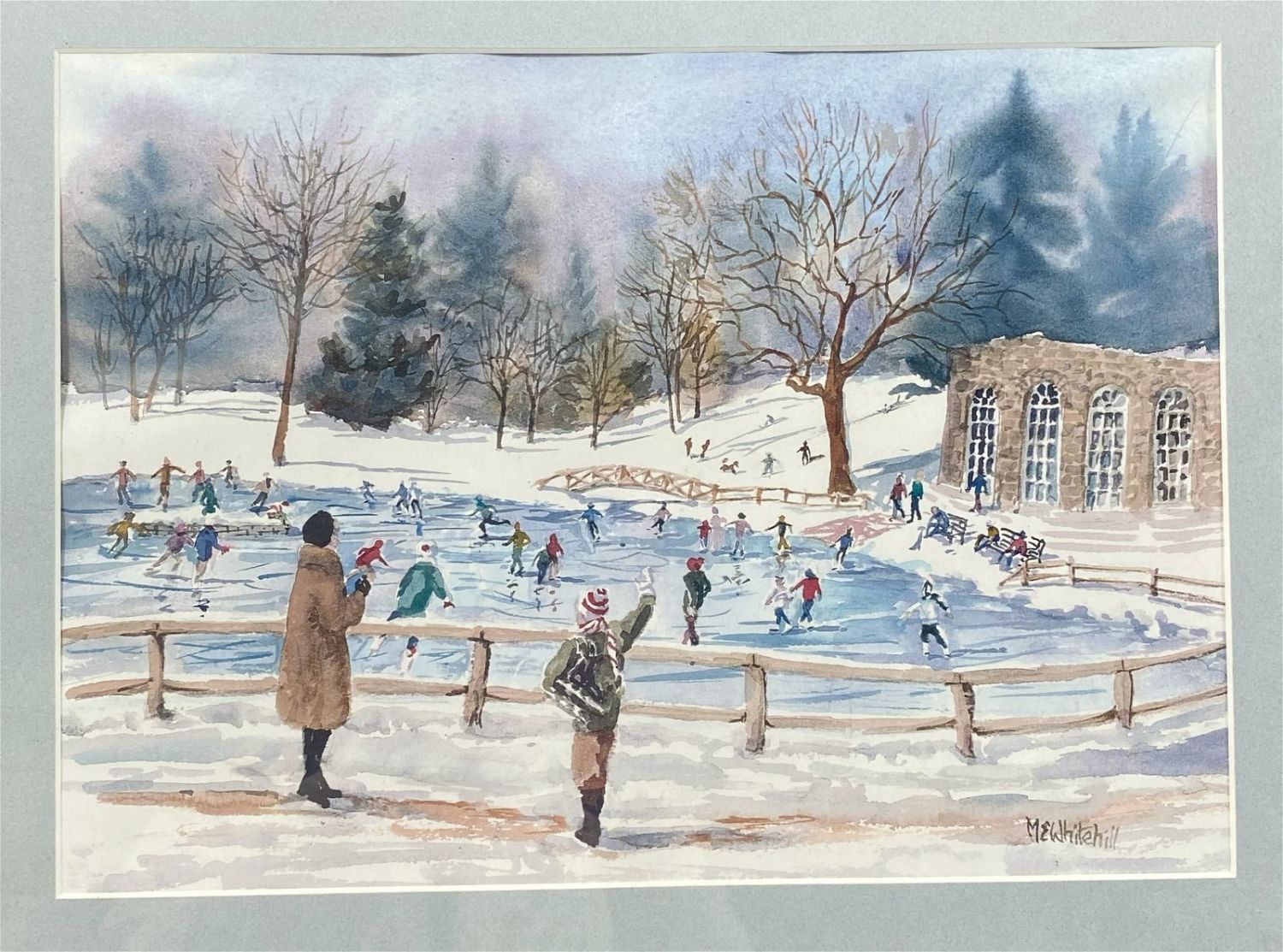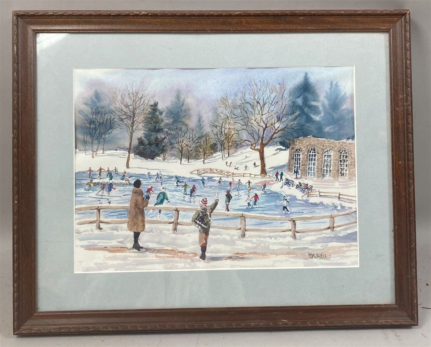 Vintage Winterscape, Signed by ME Whitehill, frame size 15.5”h x 19.5”w and sight size 10”h x 14”w Condition: Good, minor chips and scratches on frame, sign of use and age