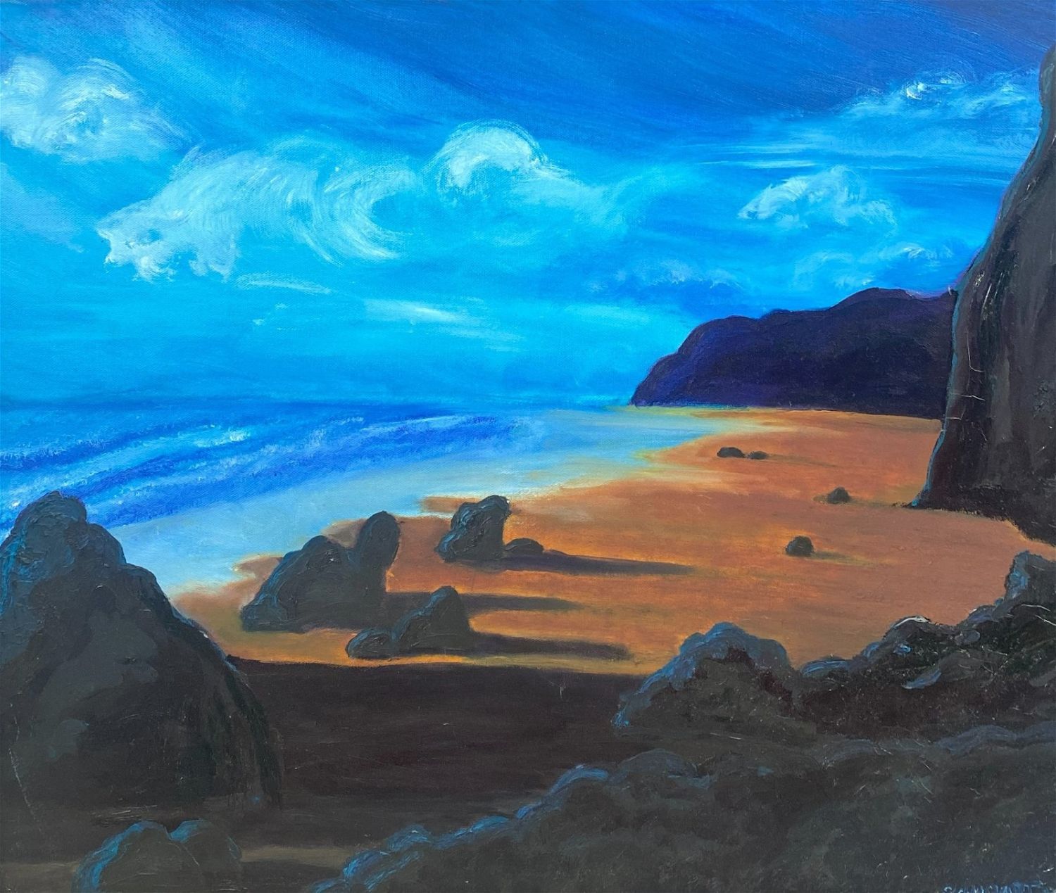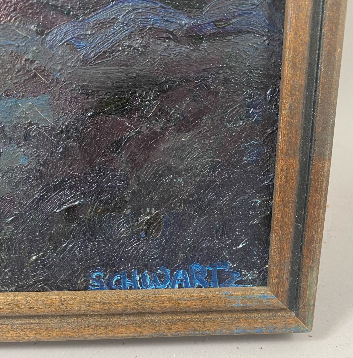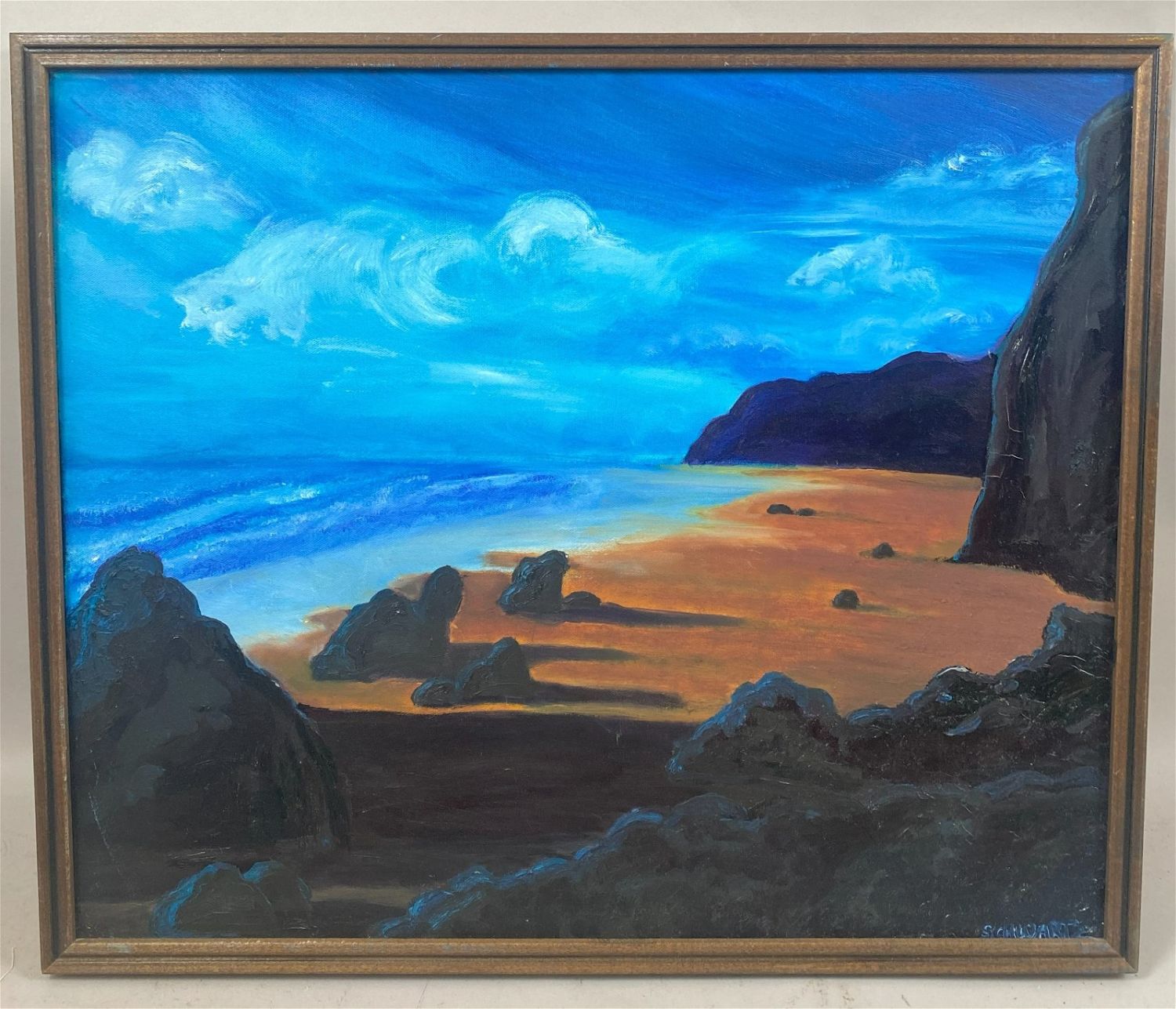 Vintage Oil on Canvas Seascape Painting, Signed by Schwartz, frame size 21”h x 25”w and sight size 19.5”h x 23.5”w Condition: Good, minor scratches on frame