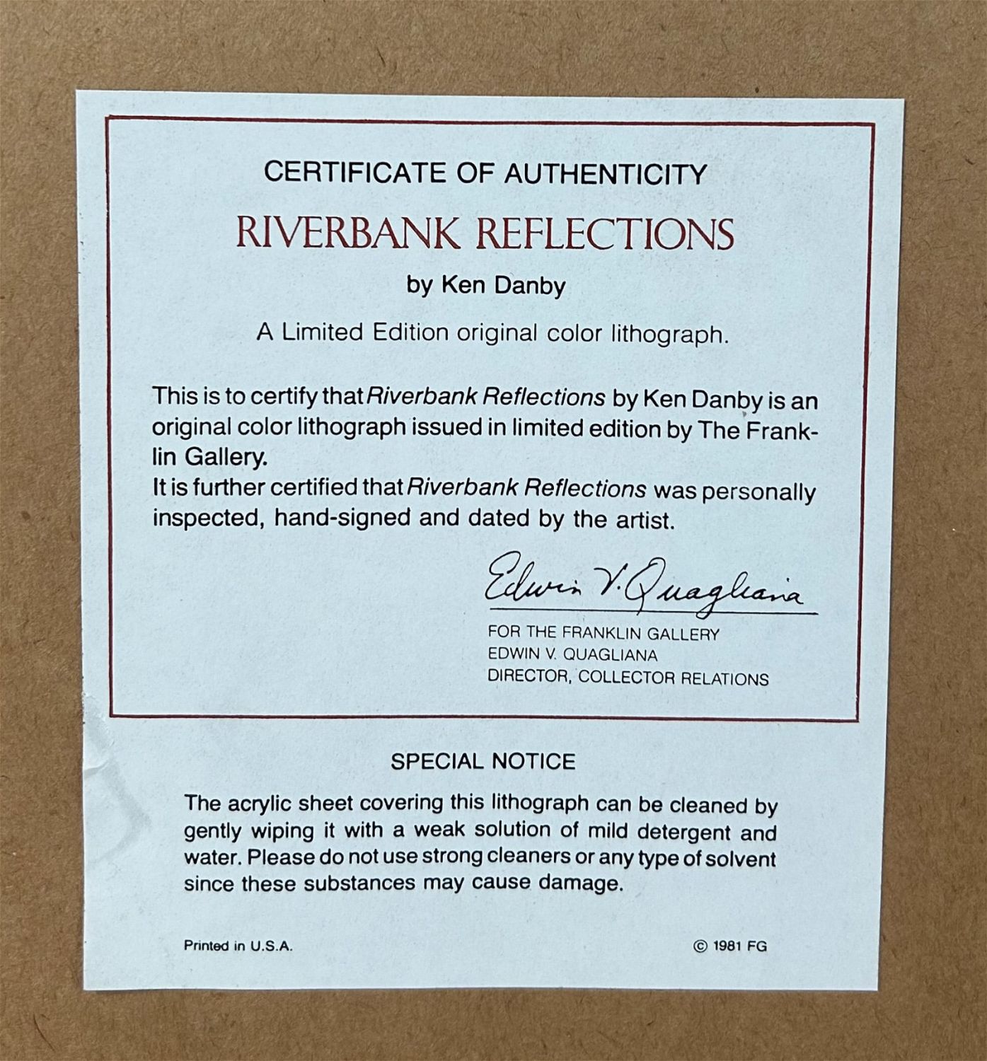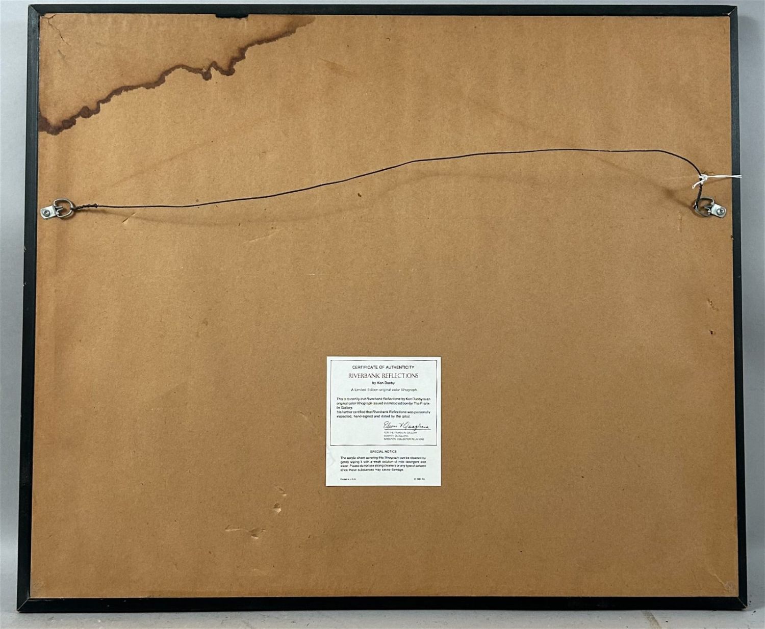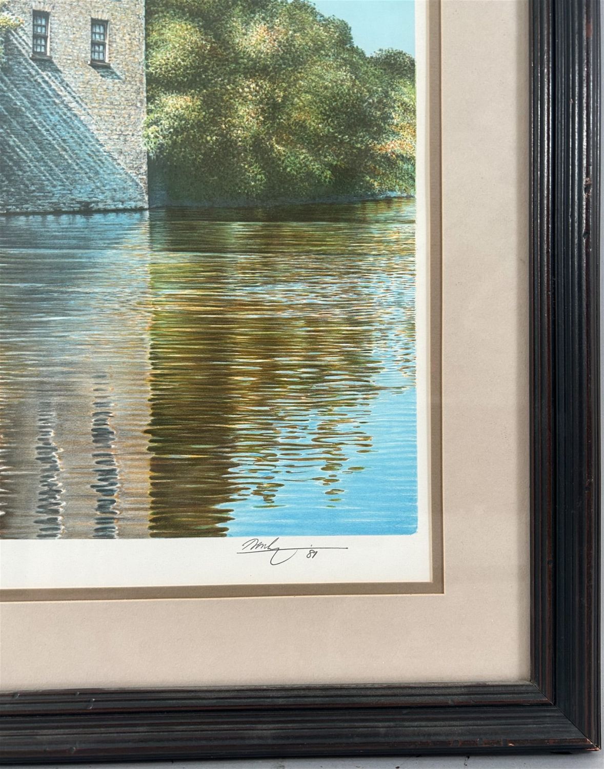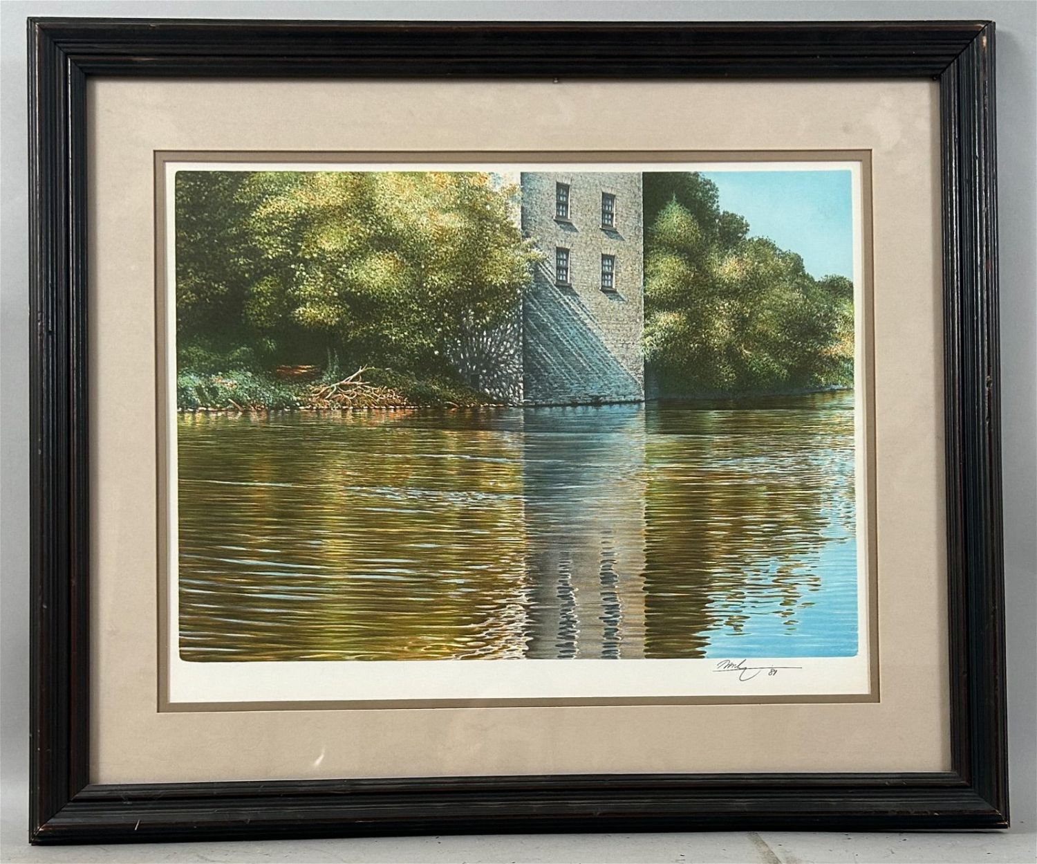 Riverbank Reflections Original Color Lithograpby by Ken Darby, frame size 21.5”h x 25.5”w and sight size 14.5”h x 18.5”w Condition: Good, stain mark on the back of frame