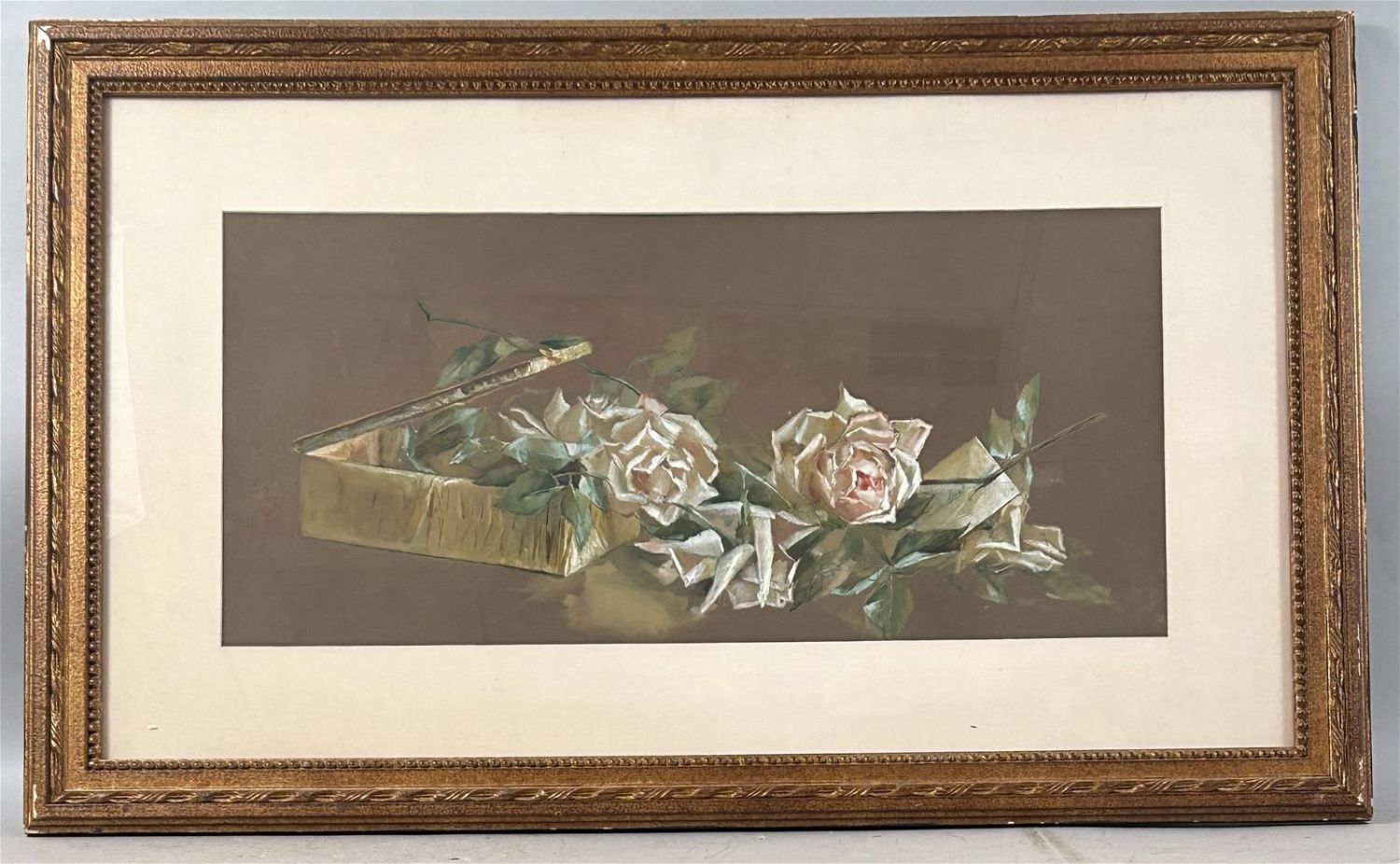 Vintage Watercolor on Paper Still Life Painting, Signed by E. Matern 89, frame size 26.5”h x 36.5”w and sight size 12”h x 26”w