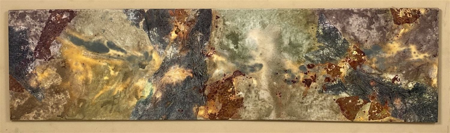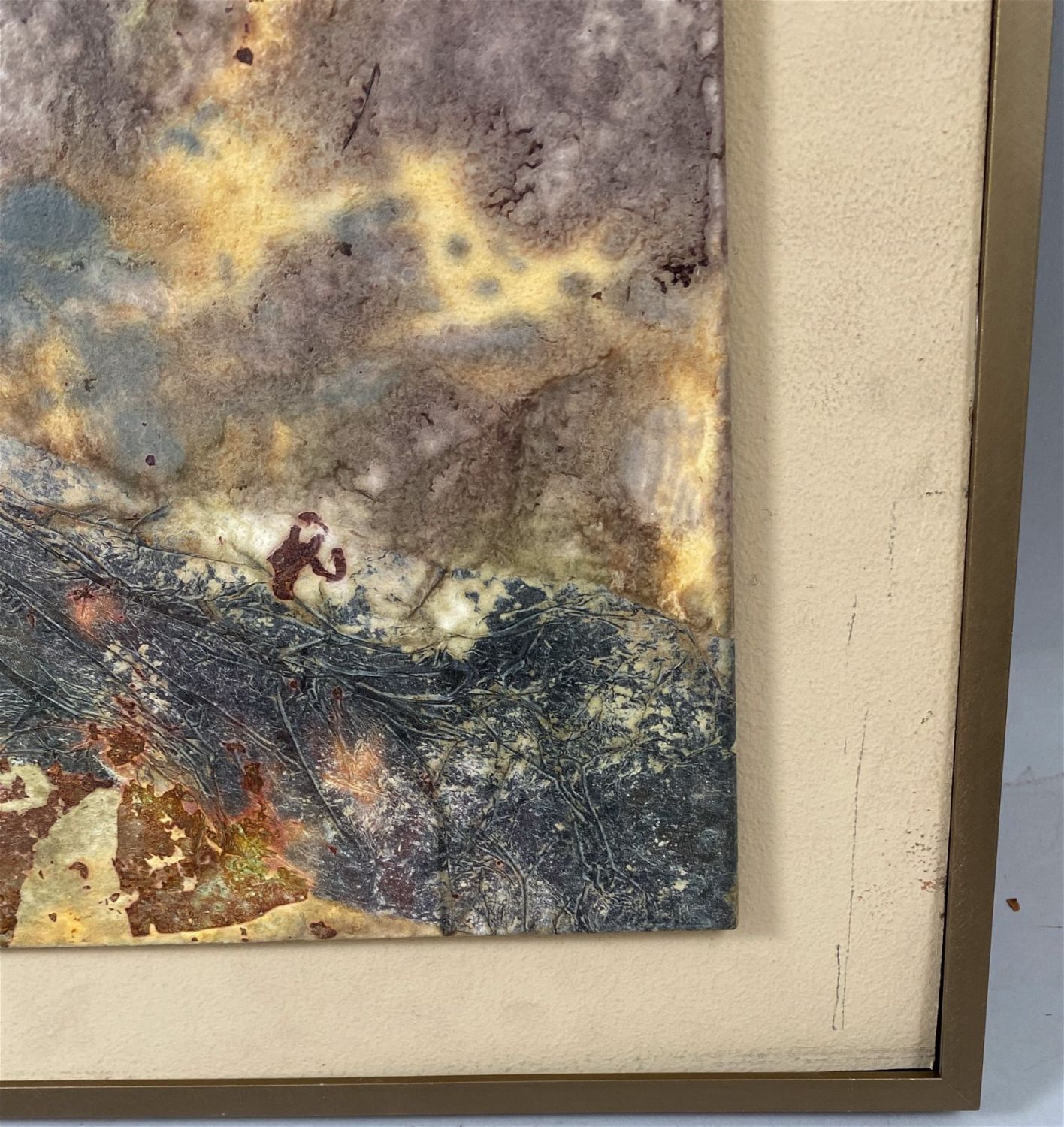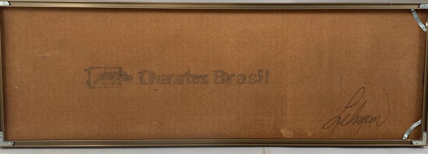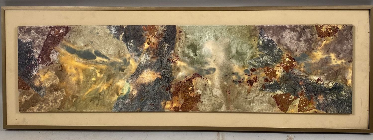 Mix Media Art, Illegibly Signed Verso, frame size 14.25”h x 42.25”w and sight size 10”h x 38”w Condition: Good, minor chips and scratches on frame, loose frame, some dirt, sign of use