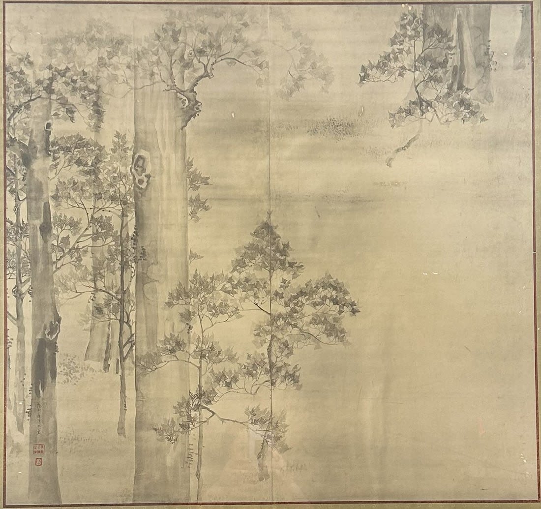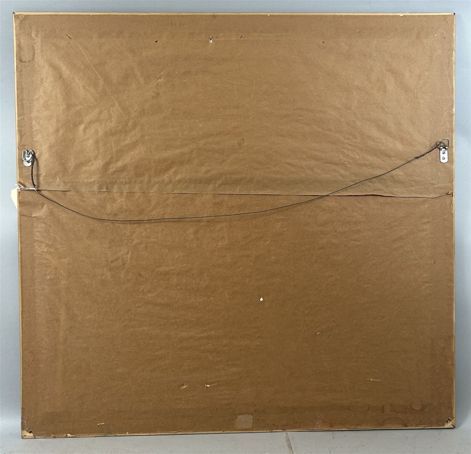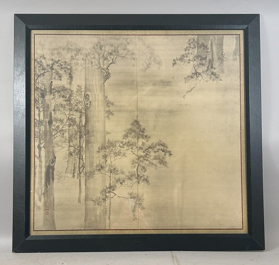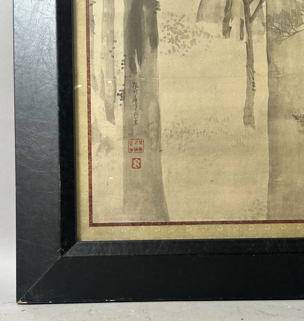 Vintage Large Asian Artwork, Stamped at Lower Left, frame size 36.25”h x 37”w and sight size 31”h x 32.5”w