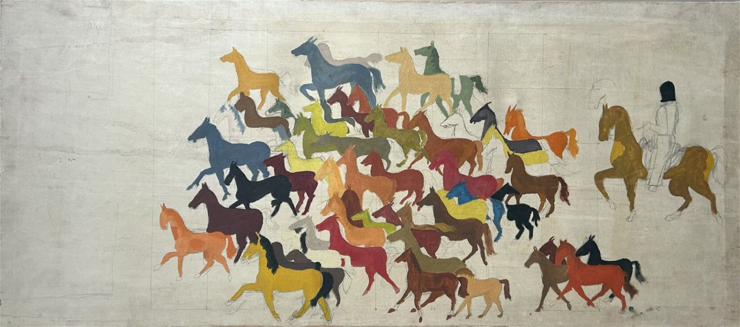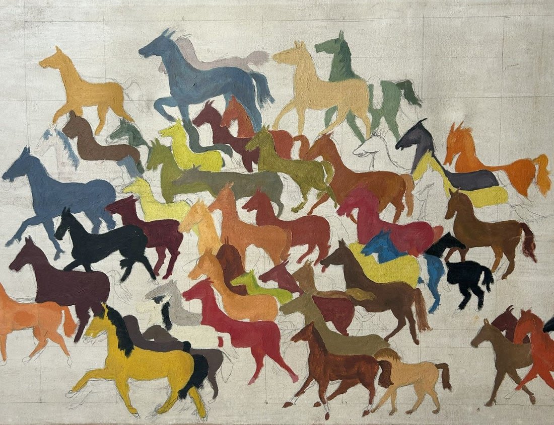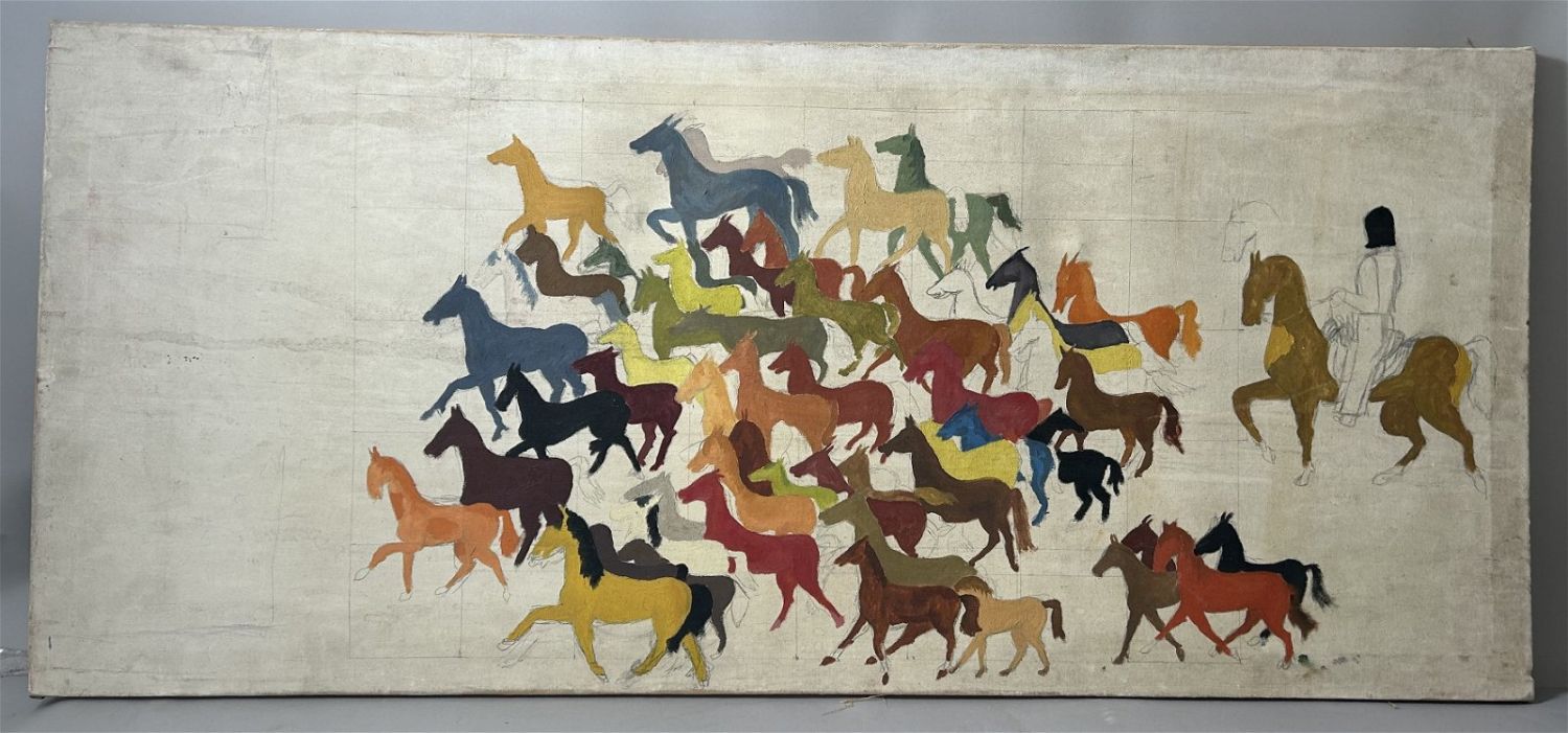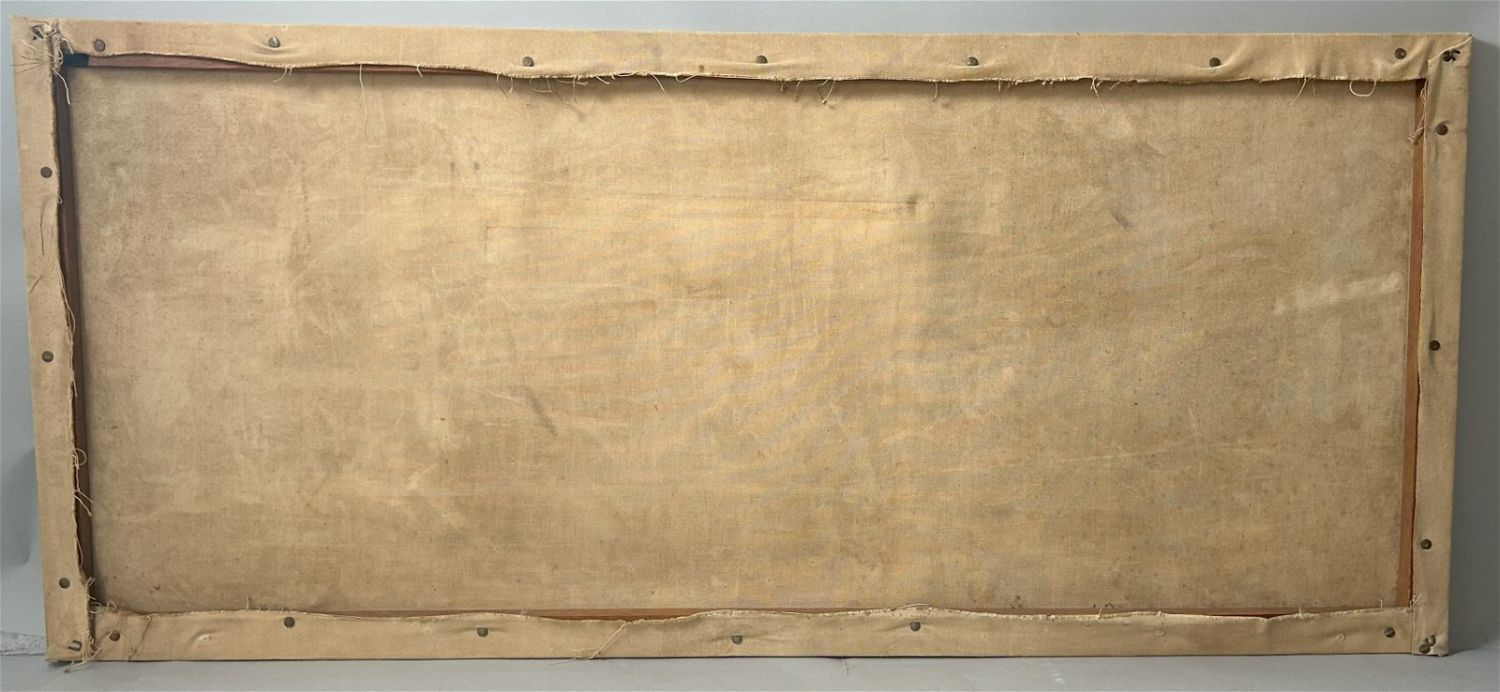 Large Oil on Canvas Abstract Unfinished Painting, Unsigned, canvas size 23.5”h x 53.5”w Condition: Good, minor scratches on frame, some dirt, sign of use