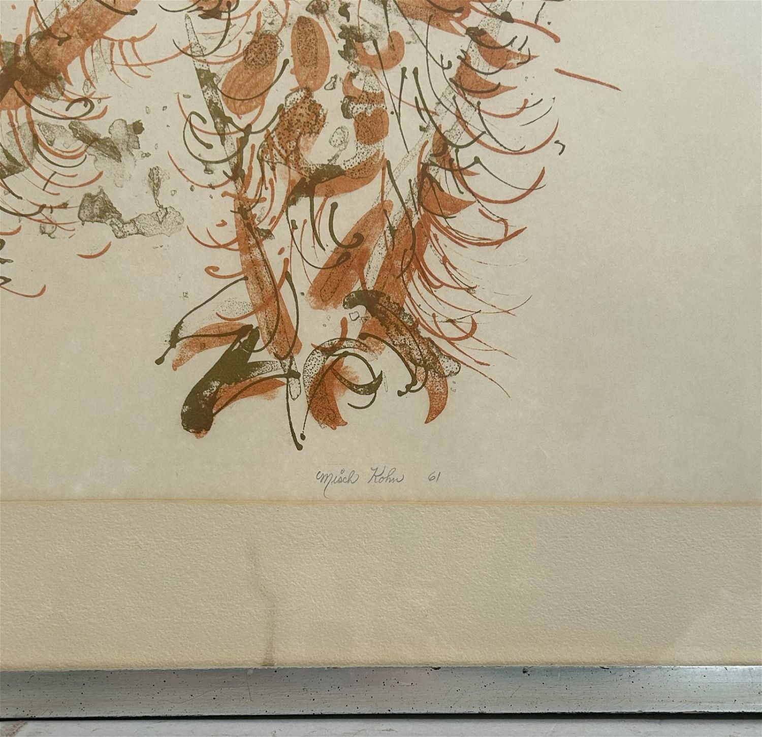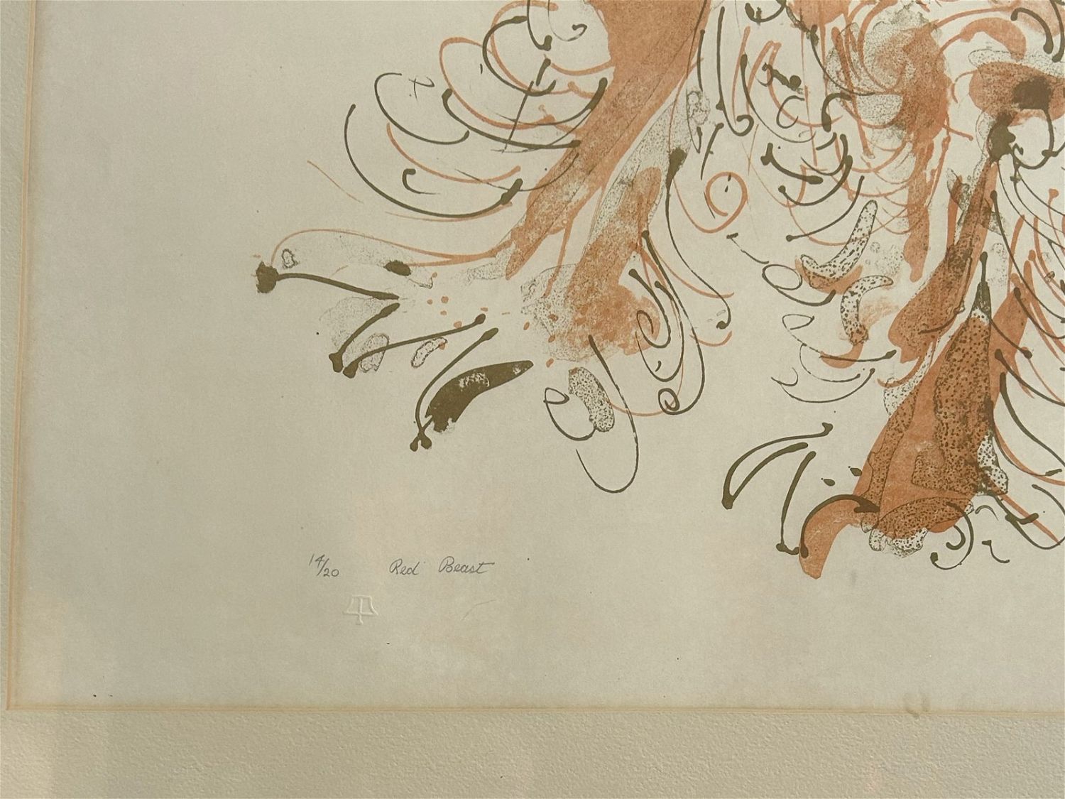 Vintage Large Art Print, Pencil Signed by Misch Kohn 61 with a title ”Red Beast”, frame size 37.25”h x 47.75”w and sight size 31.5”h x 42”w