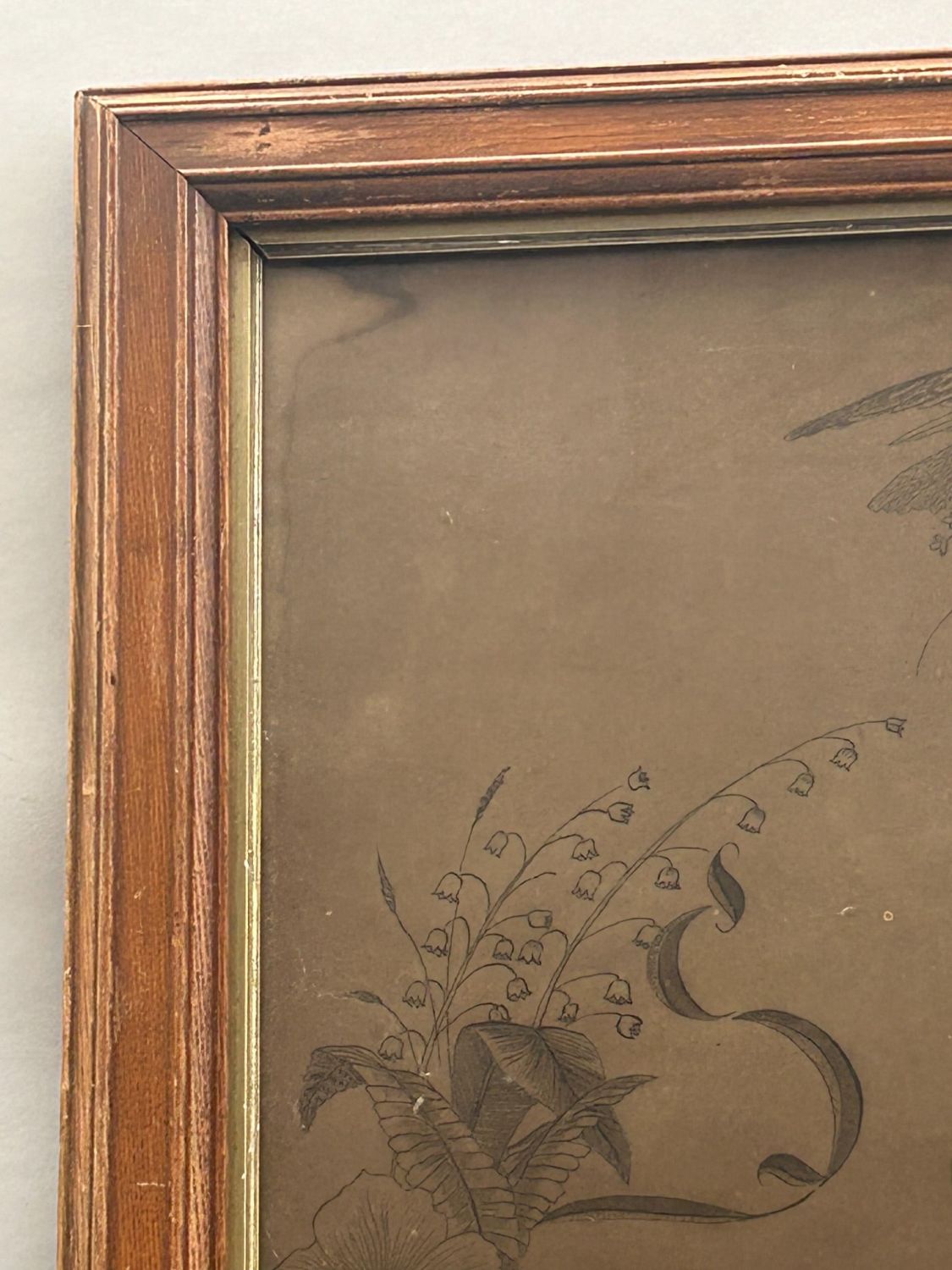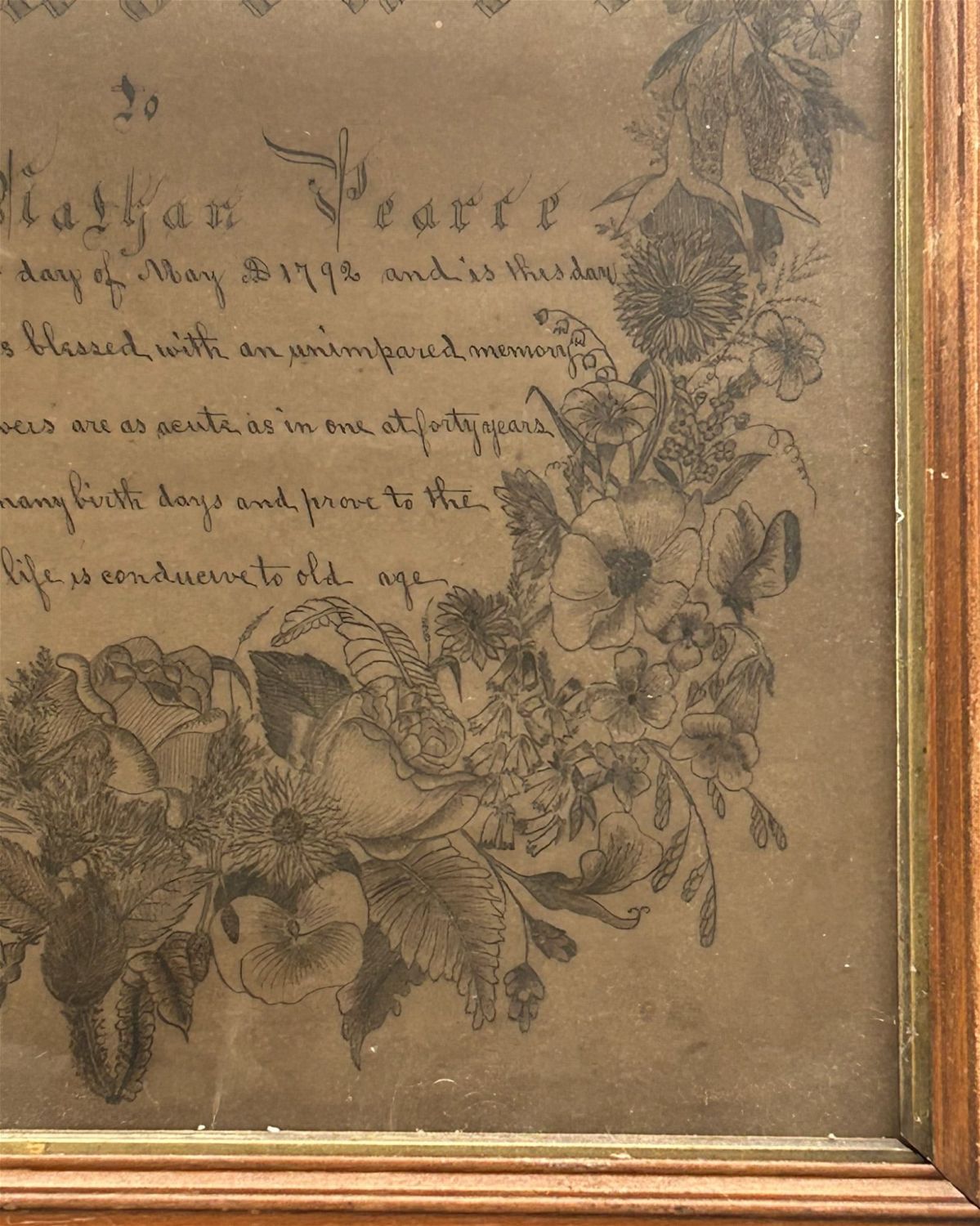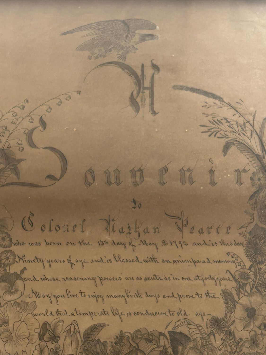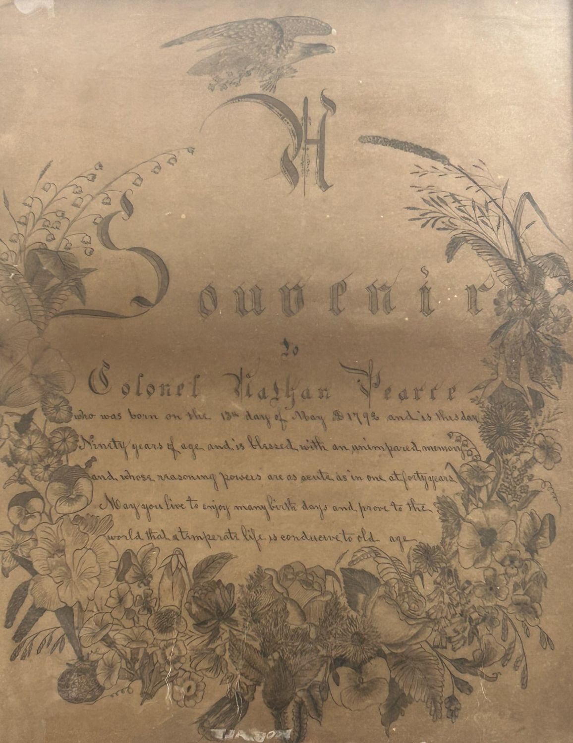 Drawing of eagle and floral wreat around the writing: ”Souvenier to Colonel Nathan Pearce”, framed in glass, frame size 28.25"l x 23"w and sight size 24"l x 19"w