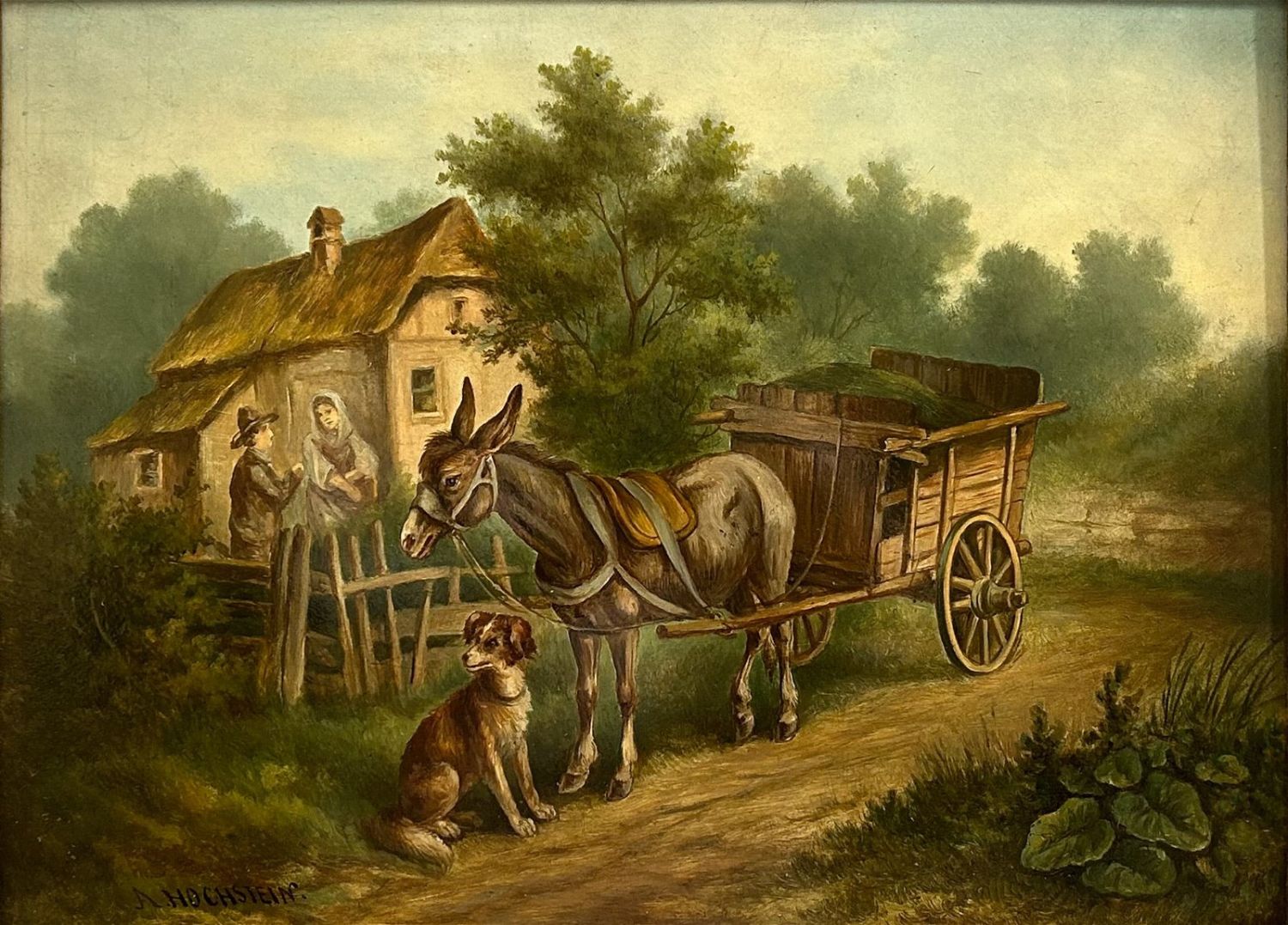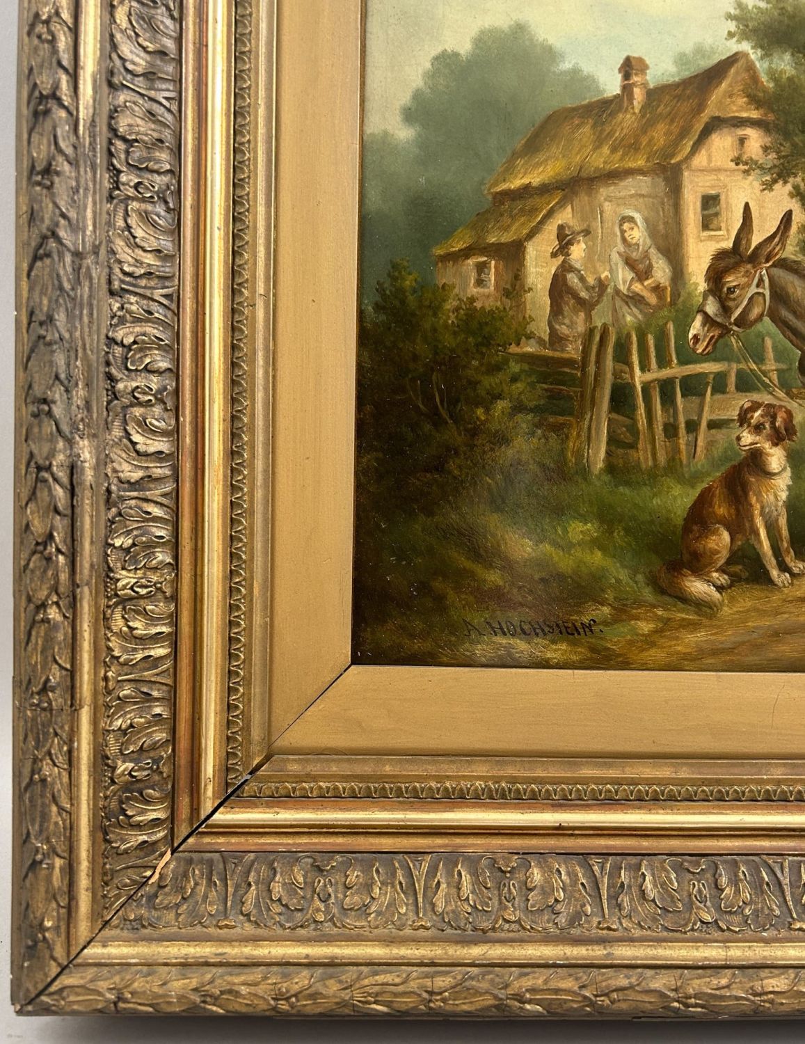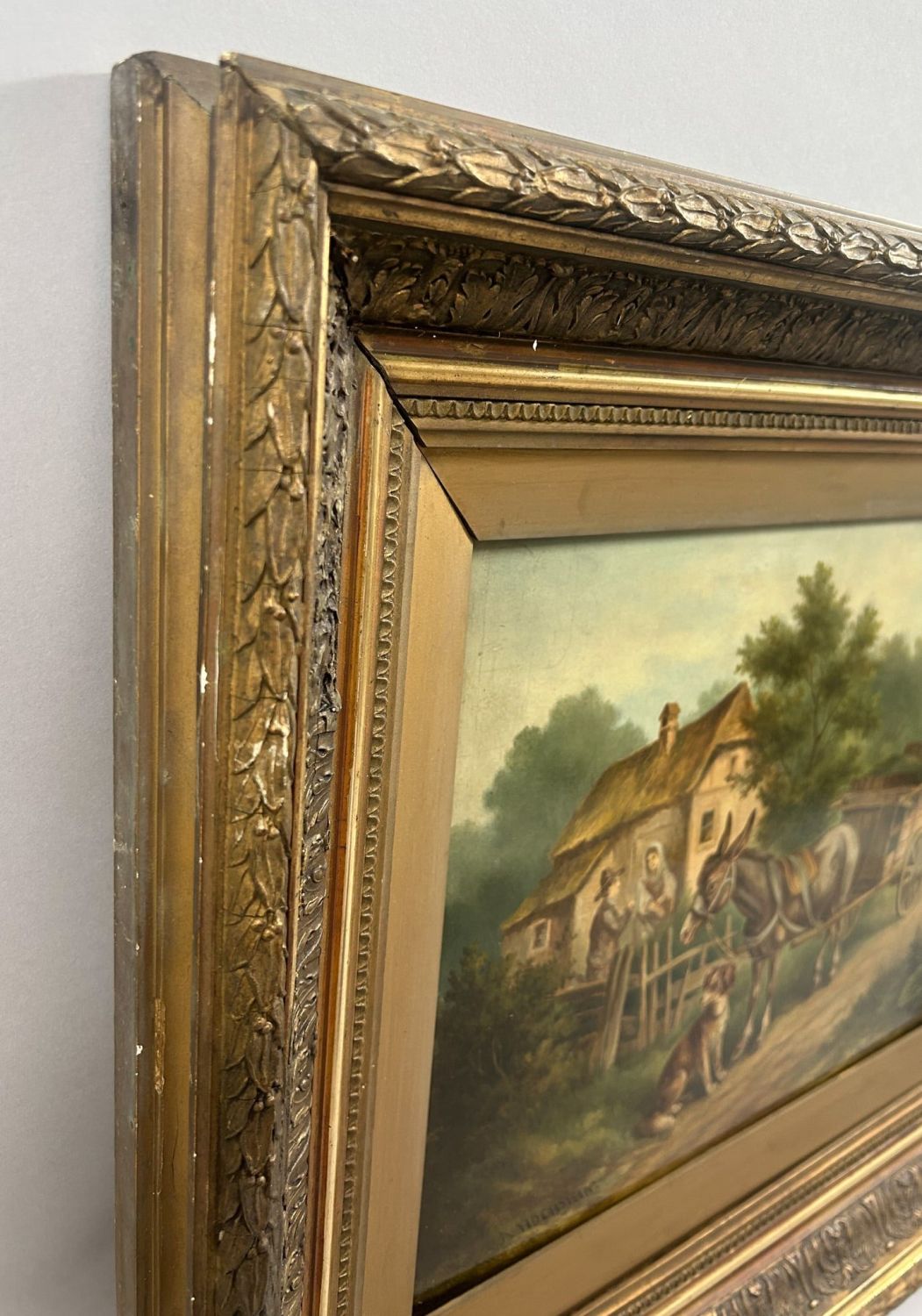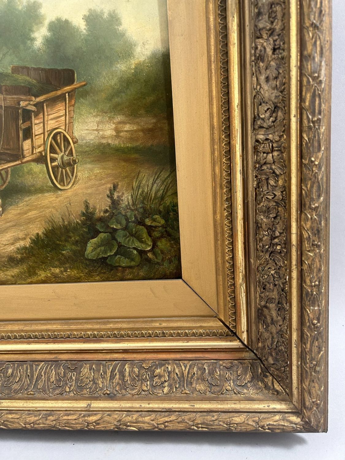 Vintage Oil on Board Farmscape Painting with Elegant Frame, frame size 14.25"H x 15.25"W and sight size 20"H x 24"W Condition: Good, painting is in good condition, some chip on frame