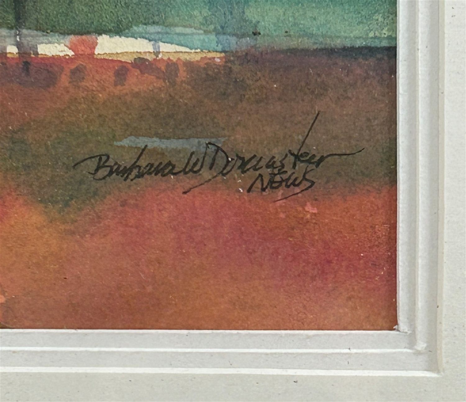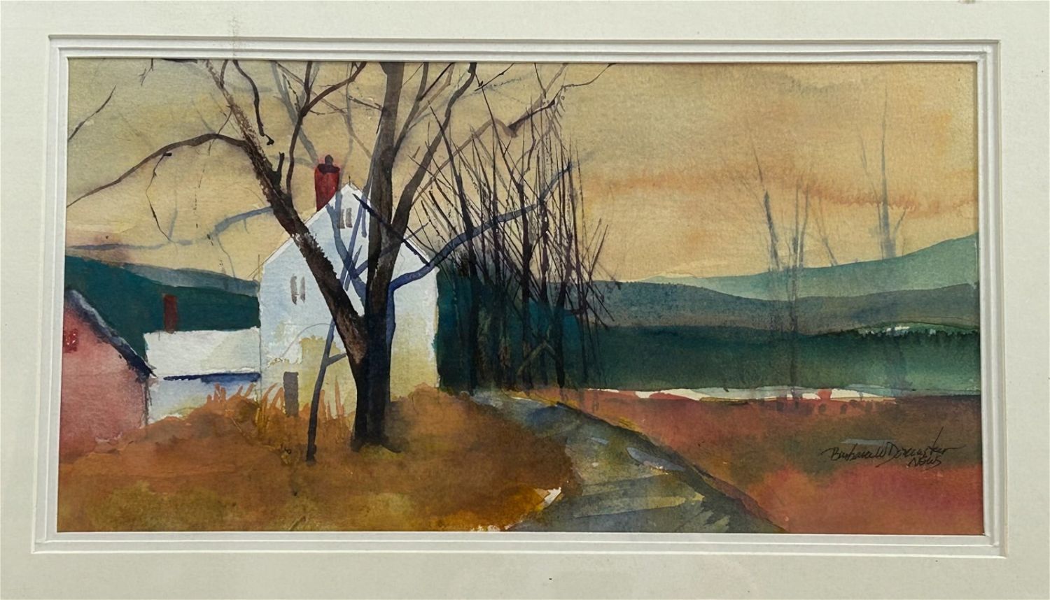 Framed Vintage Watercolor Landscape Painting on Paper, Signed by Barbara Doncaster at Lower Right, frame size 20"H x 14"W and sight size 12.5"H x 6.5"W