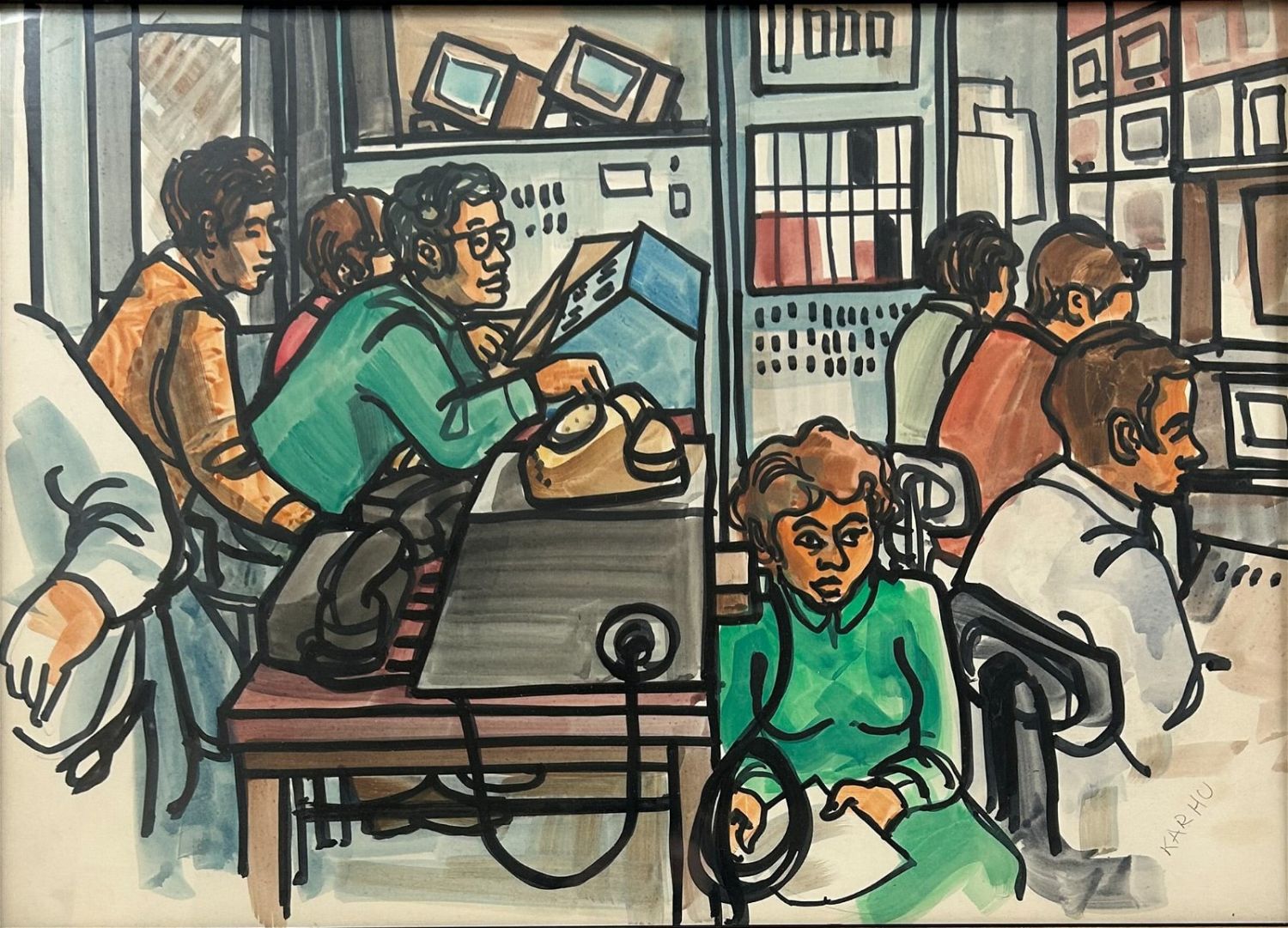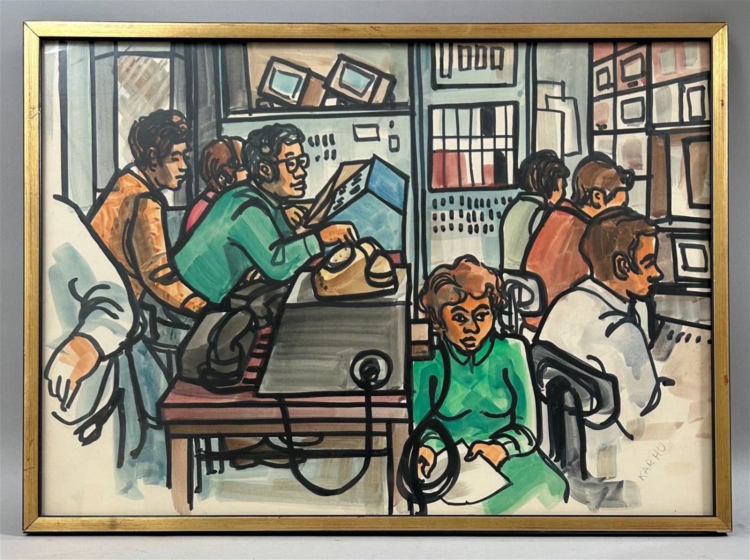 Modernist Art Pencil Signed by Karhu at Lower Right, frame size 15"H x 20.75"W and sight size 14.5"H x 20.25"W Condition: Good