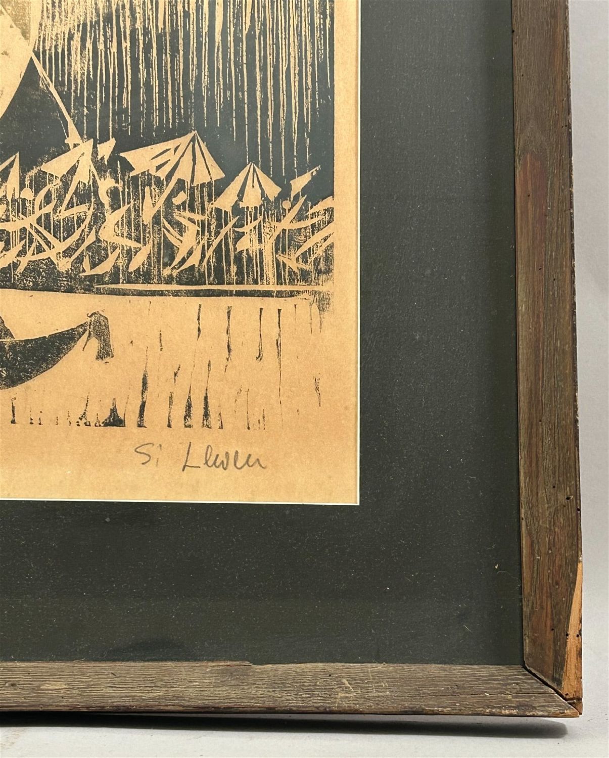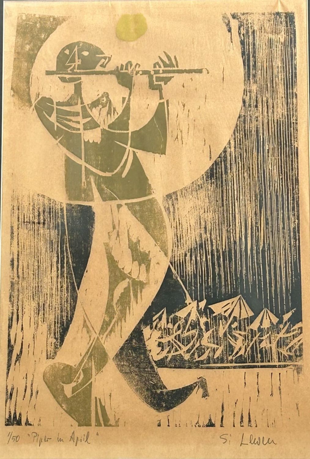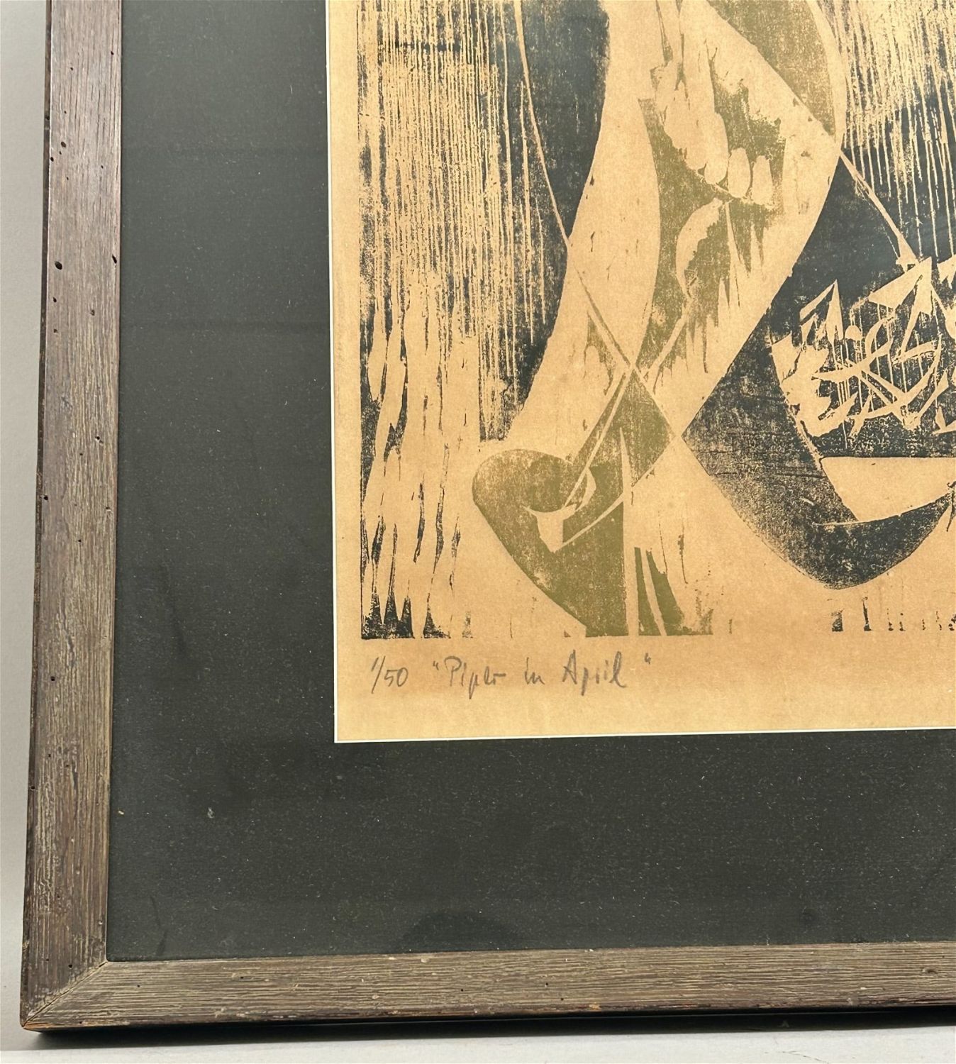 Vintage Print on Paper with Wooden Frame, Signed by Si Lewen at Lower Right, and Titled as ”Piper in April”, frame size 27.5"H x 21"W and sight size 20"H x 13.5"W