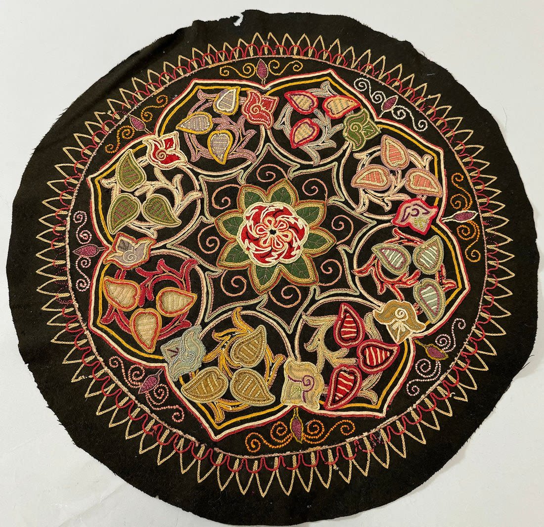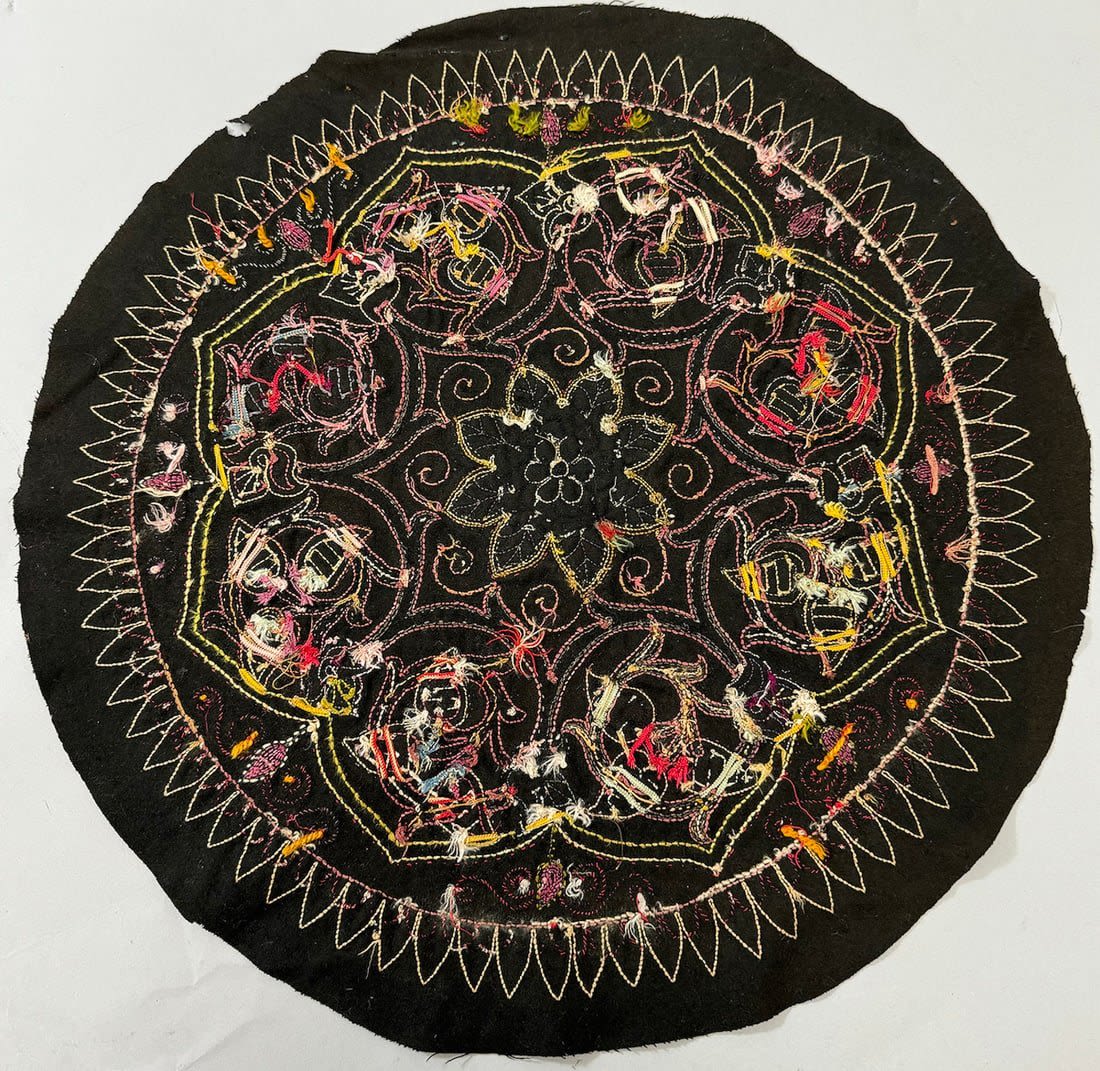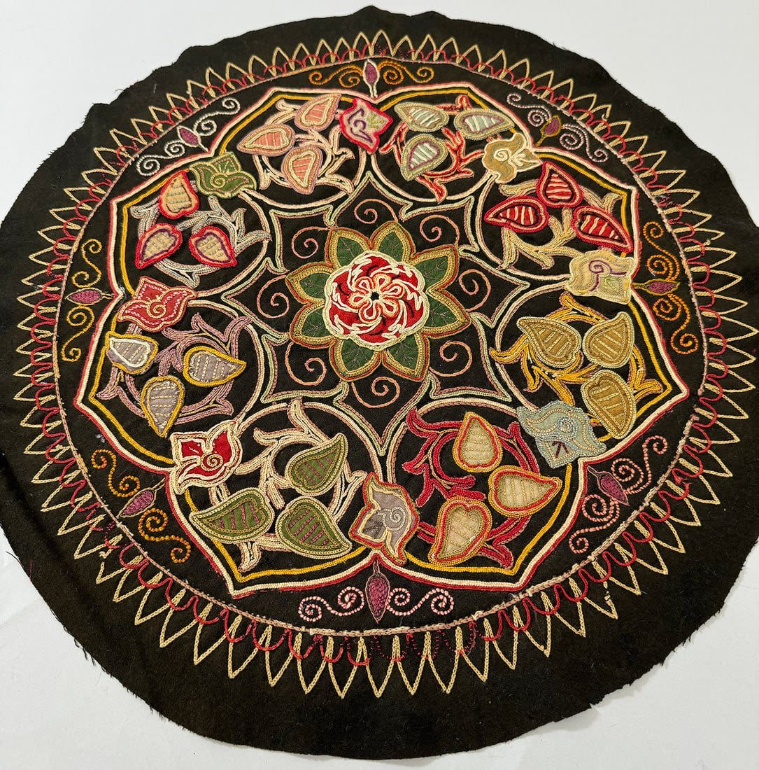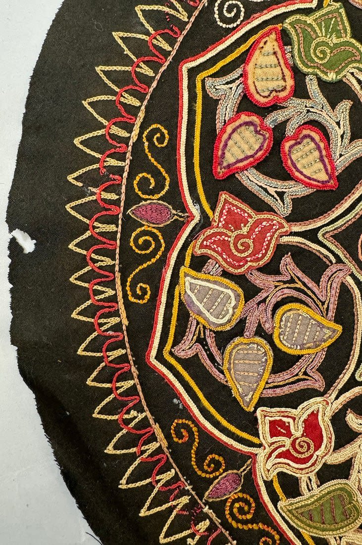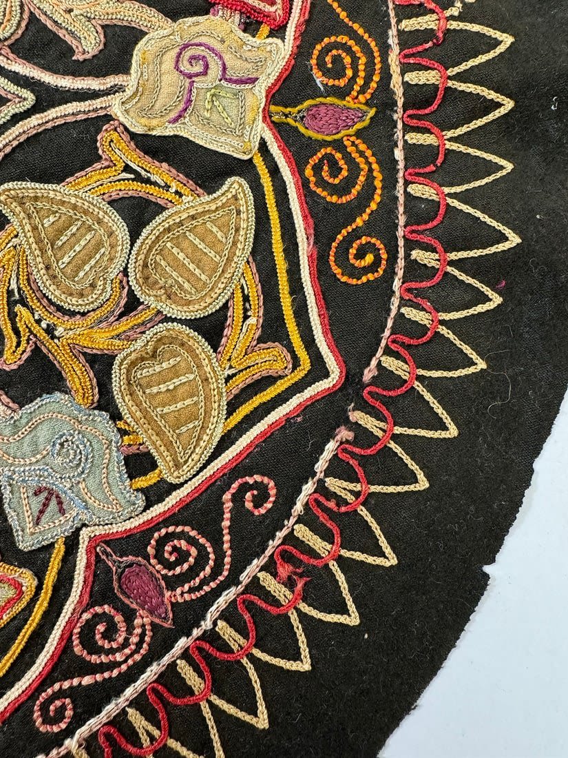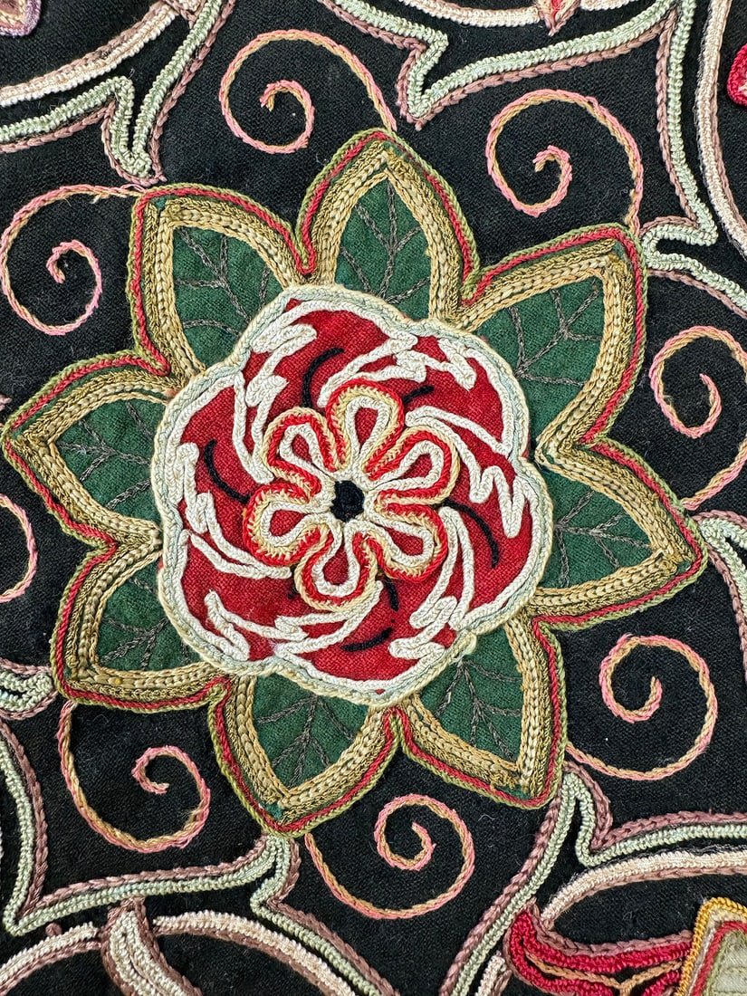 Multicolor handmade embriodery on black round textile. Diameter: 20 in.