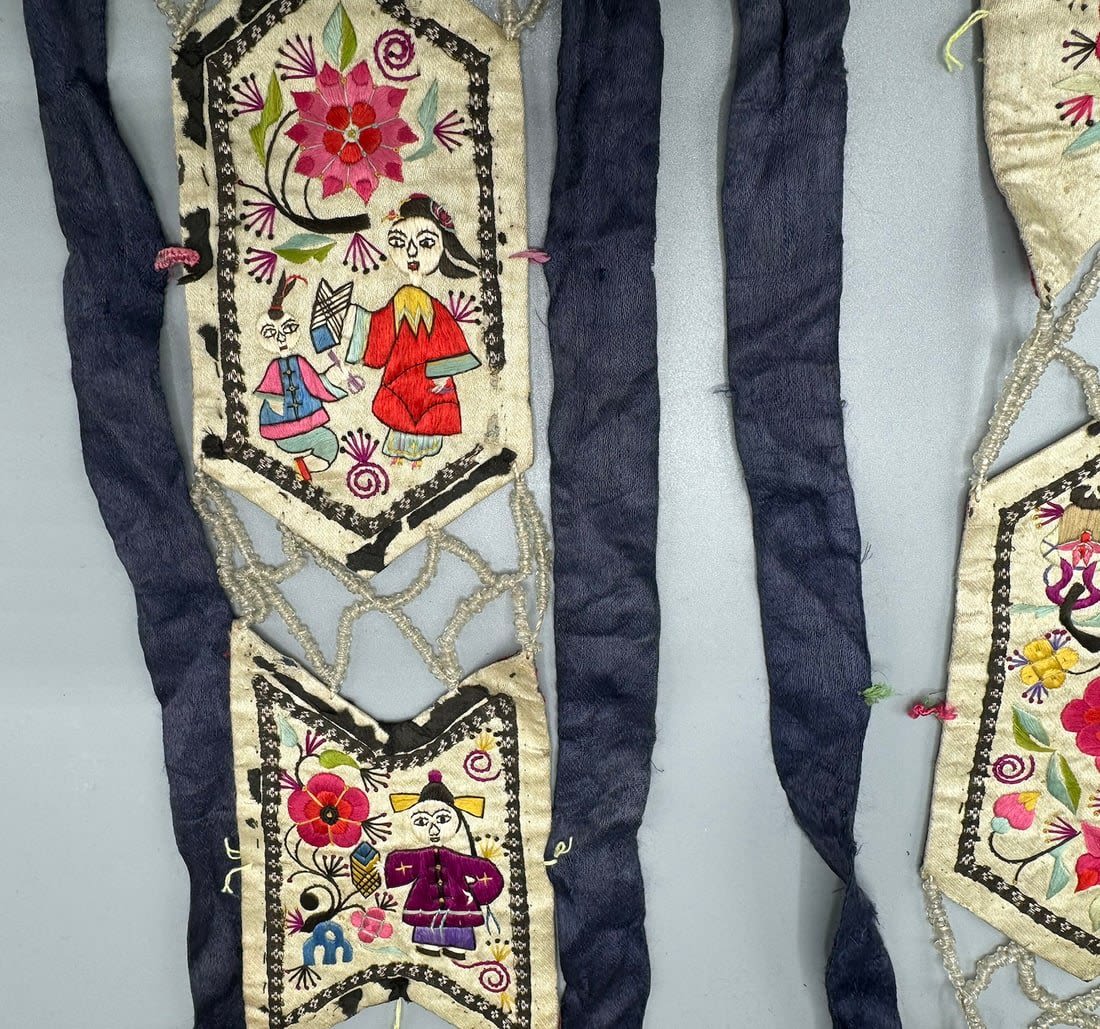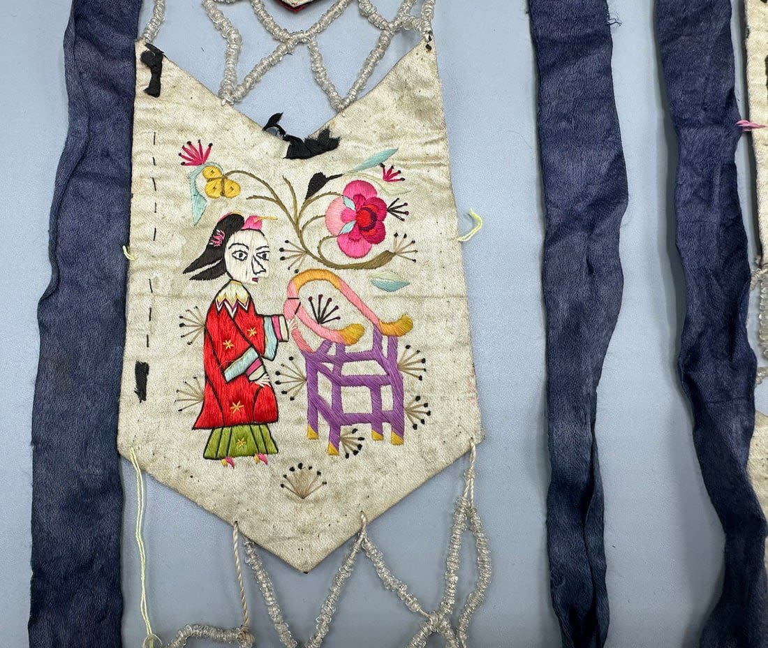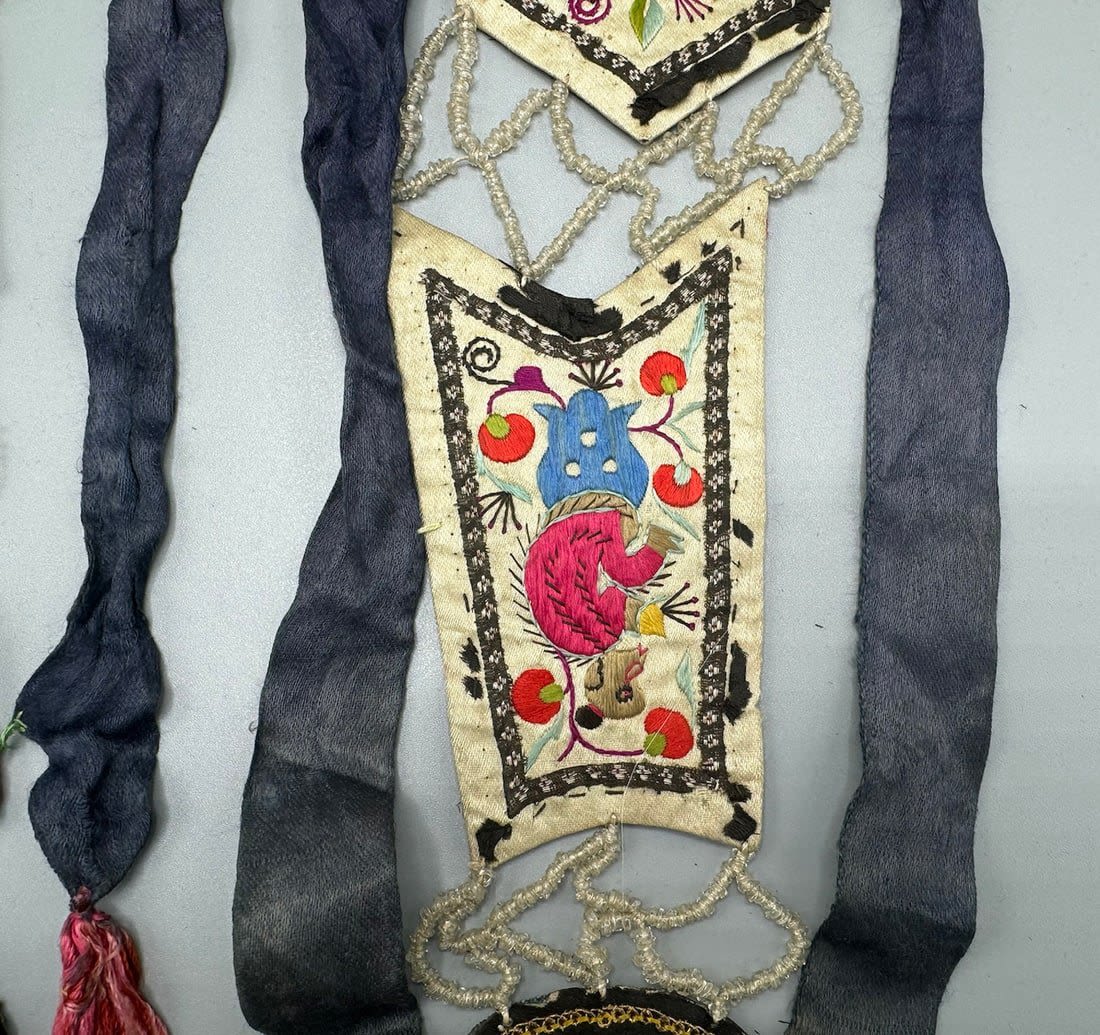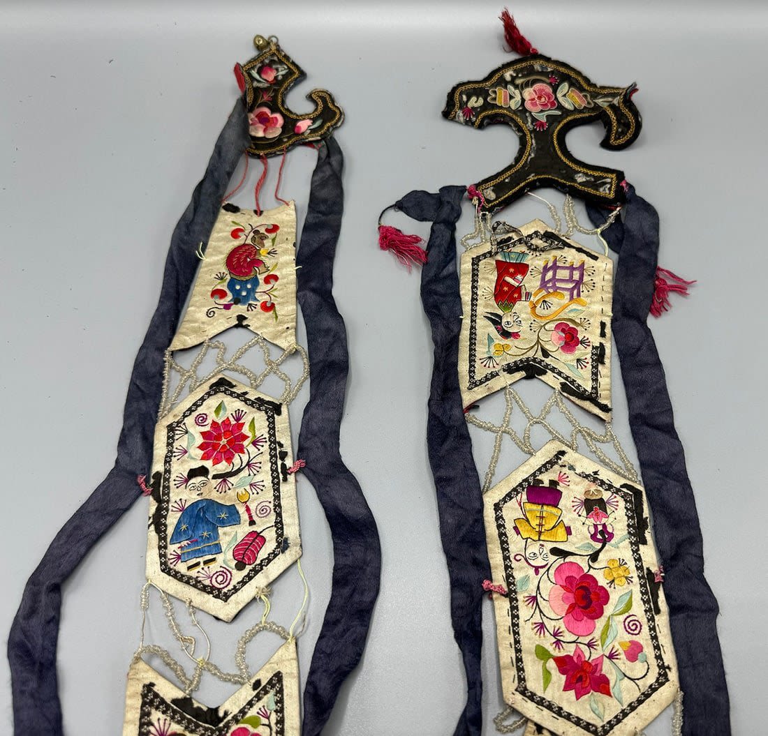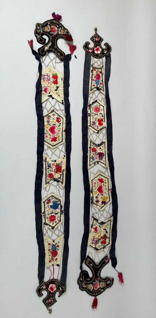 Two embroidered silk Chinese textile fragments with beads. Item 1 dimensions: 40L x 5 W. Item 2 dimensions: 38L x 5 W in