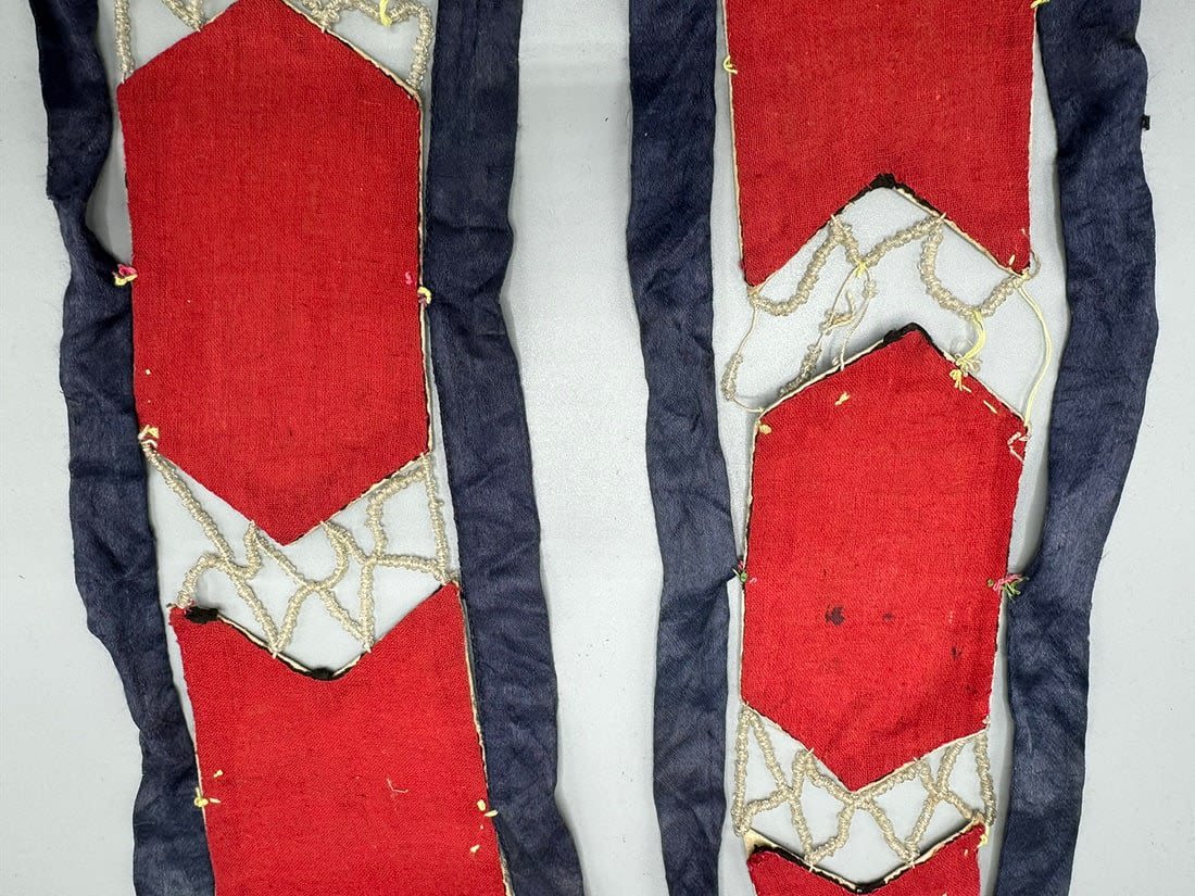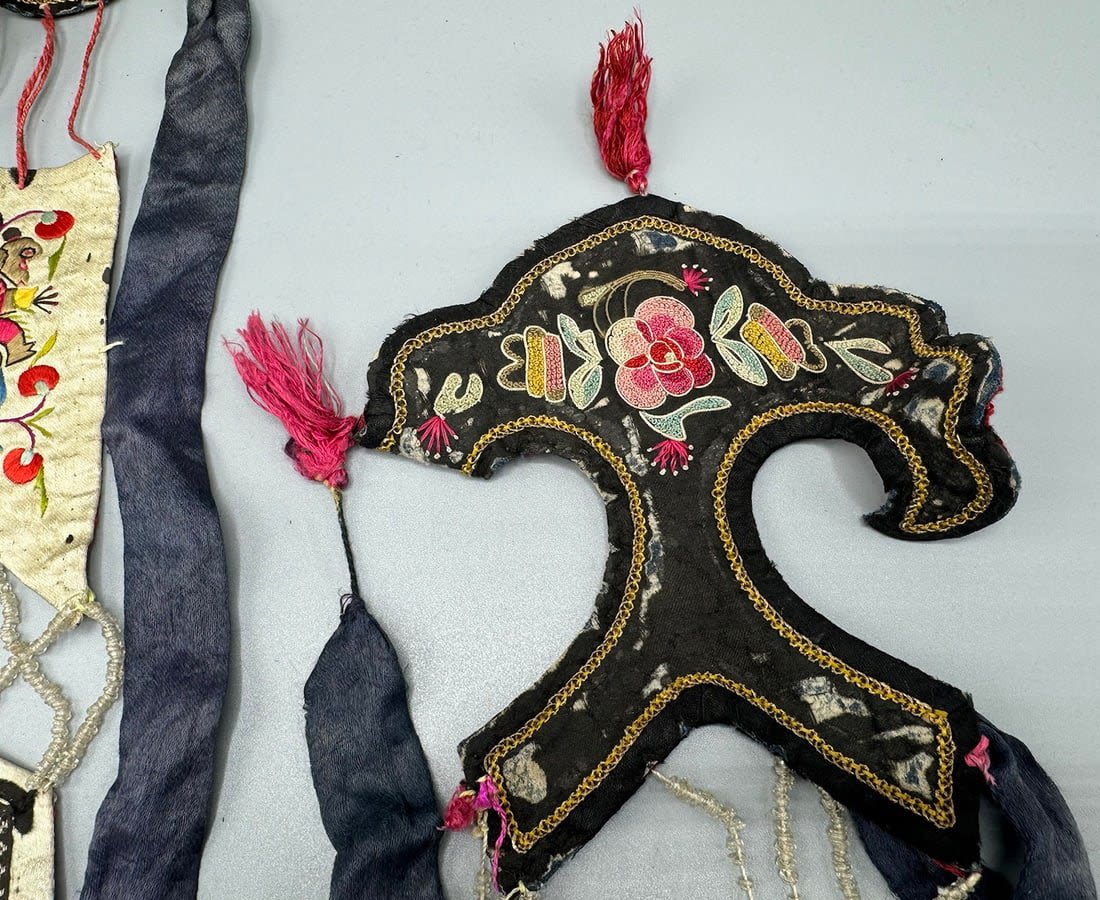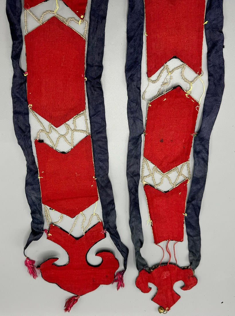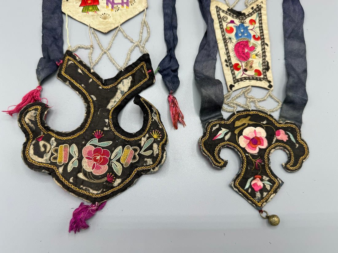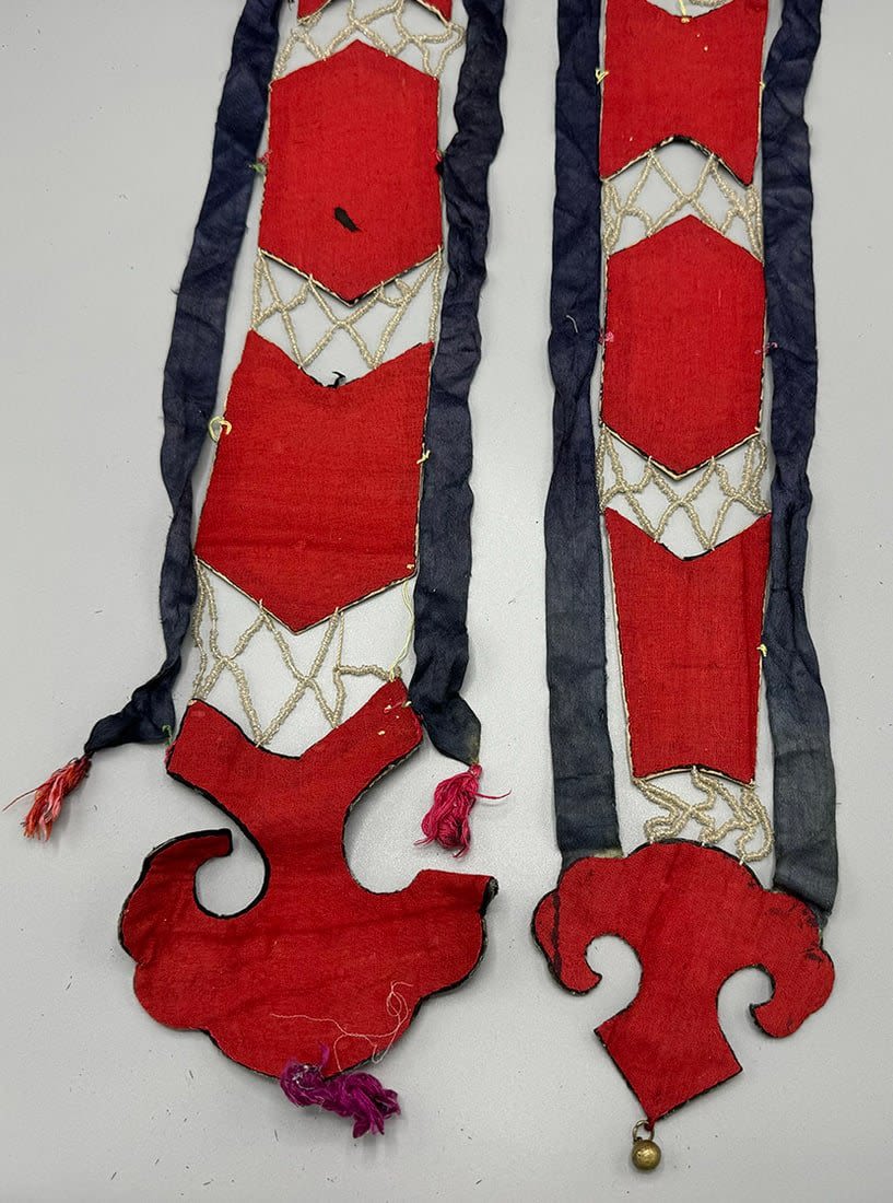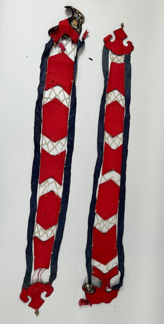 Two embroidered silk Chinese textile fragments with beads. Item 1 dimensions: 40L x 5 W. Item 2 dimensions: 38L x 5 W in