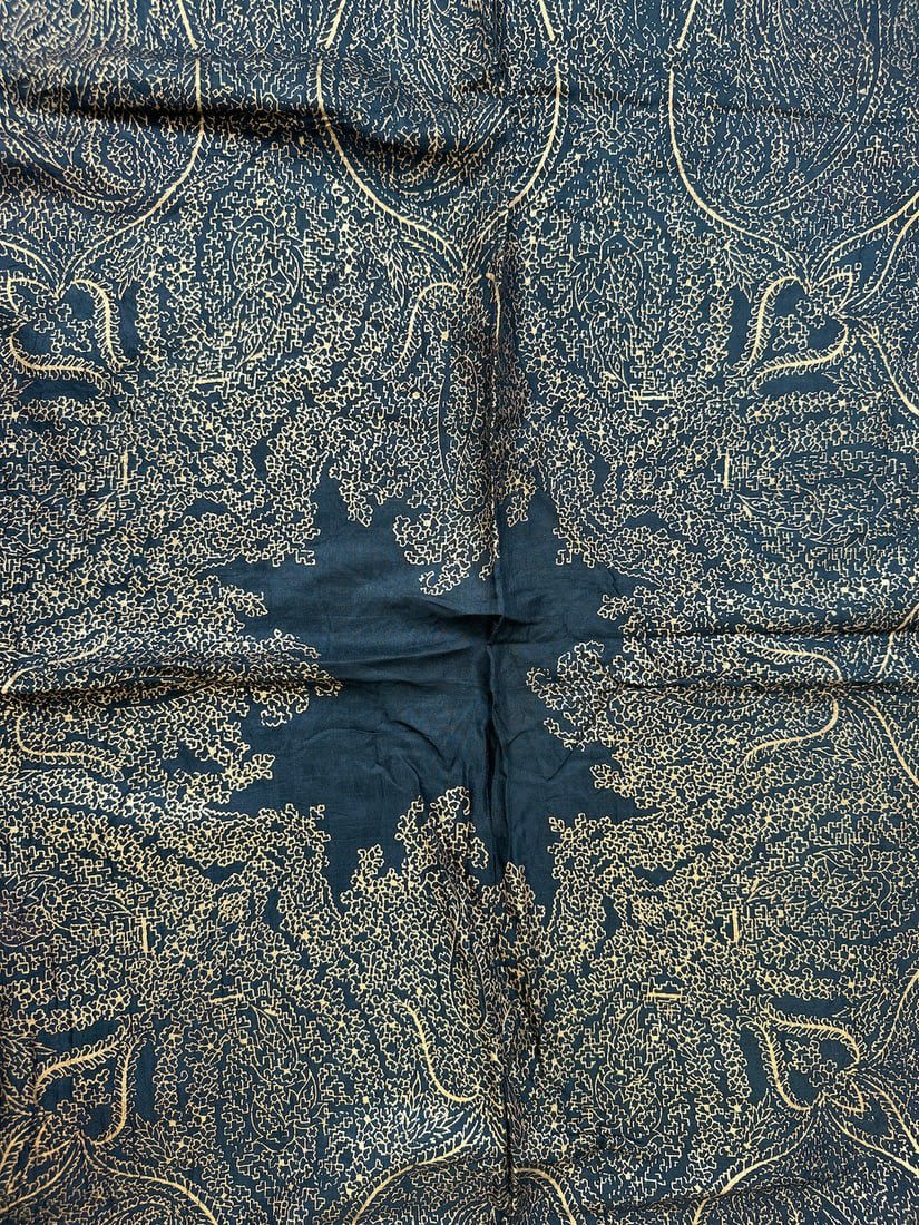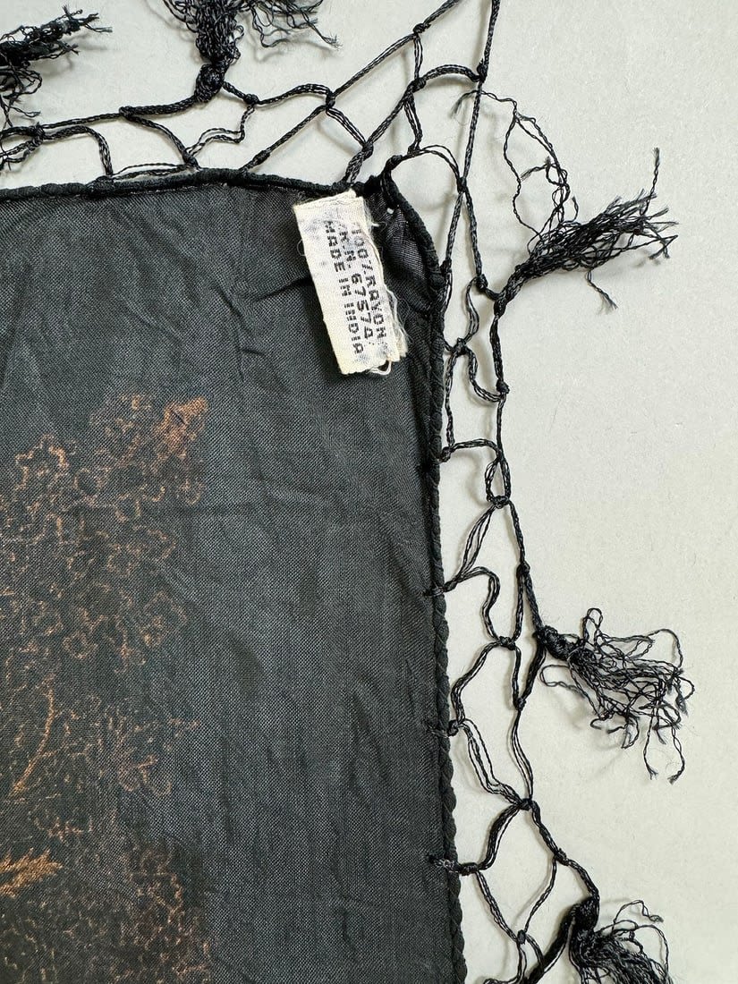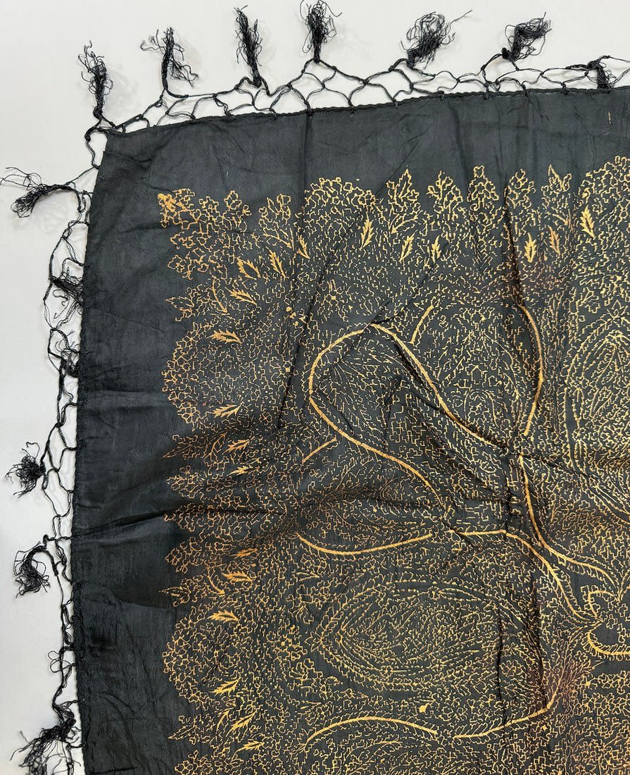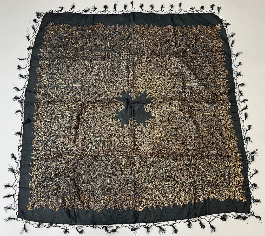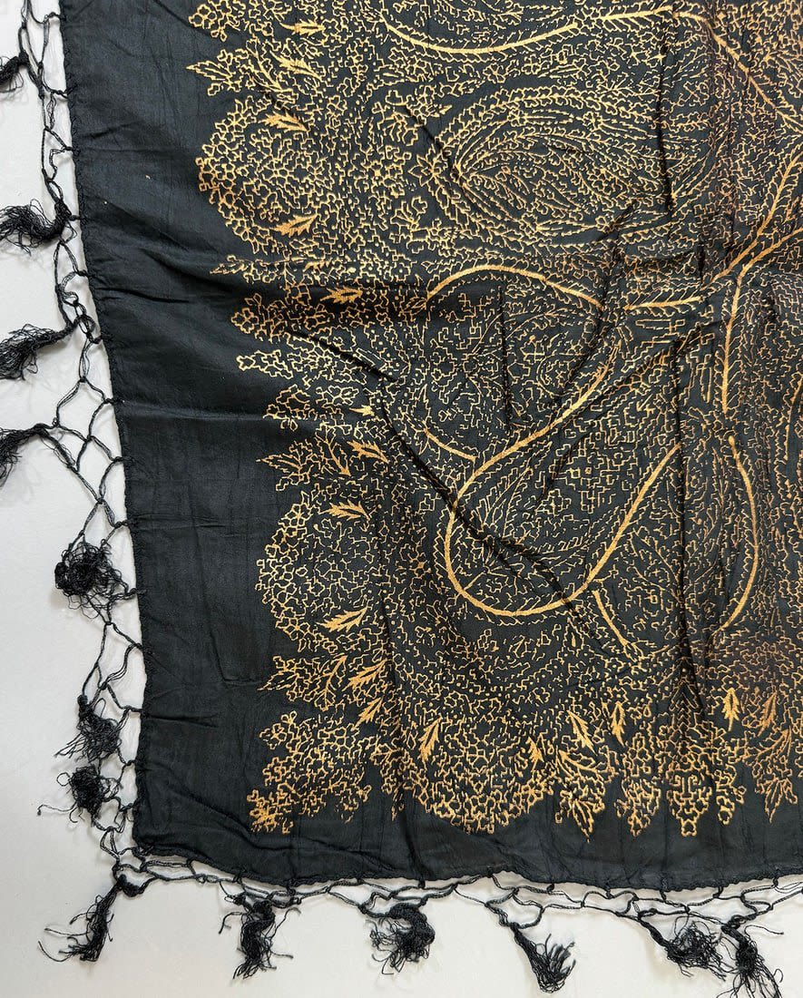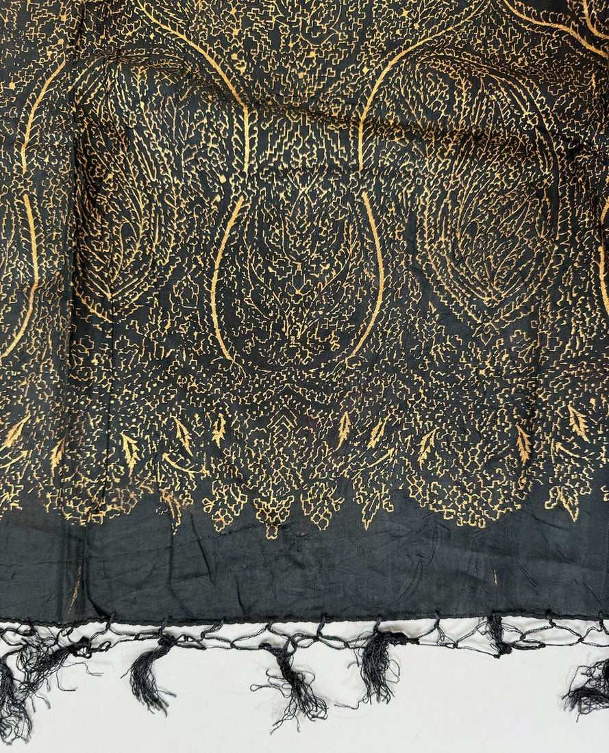 Indian 100% Rayon black color gold paisley patterned scarf. D: 42L x 39W in.