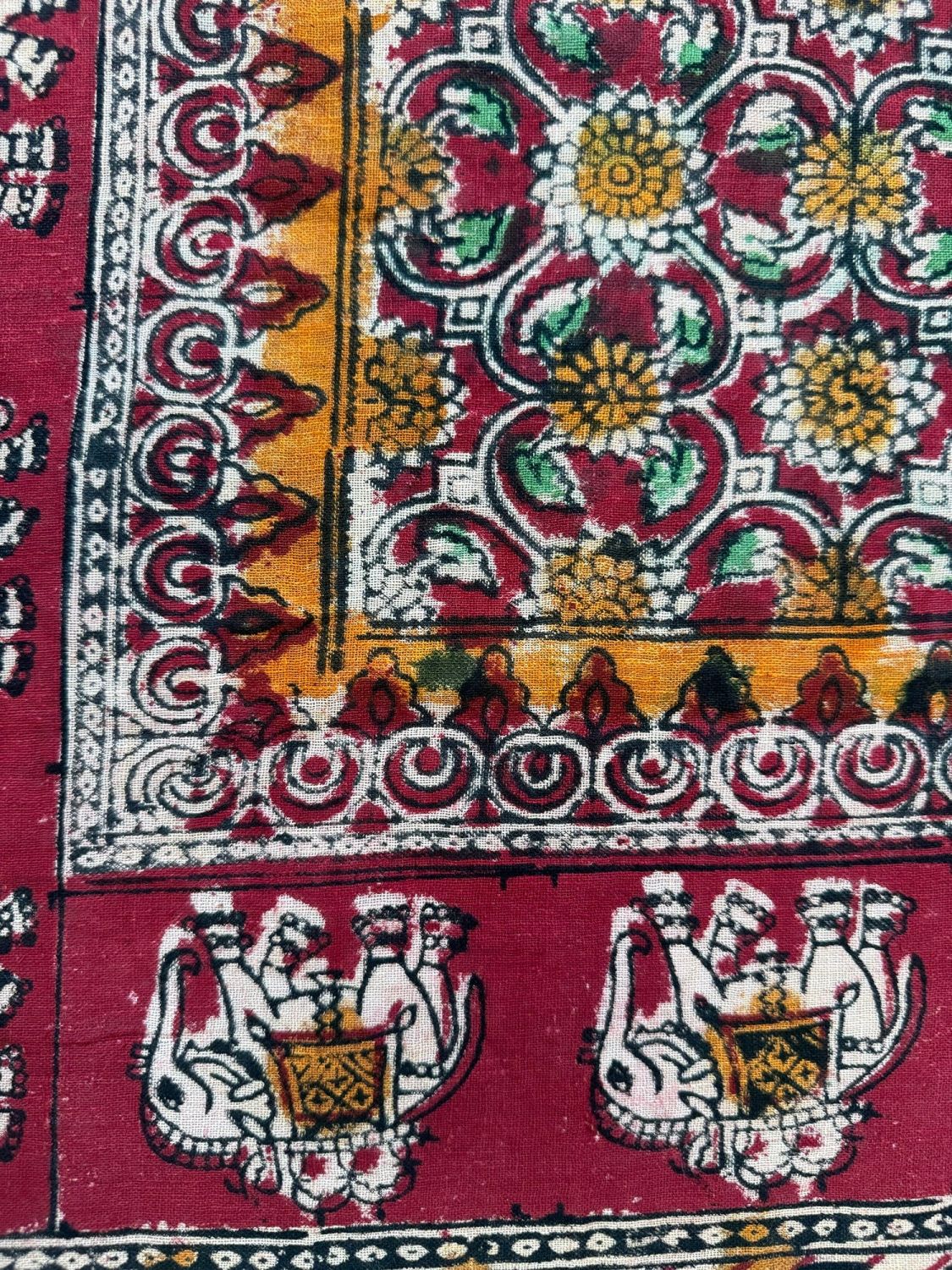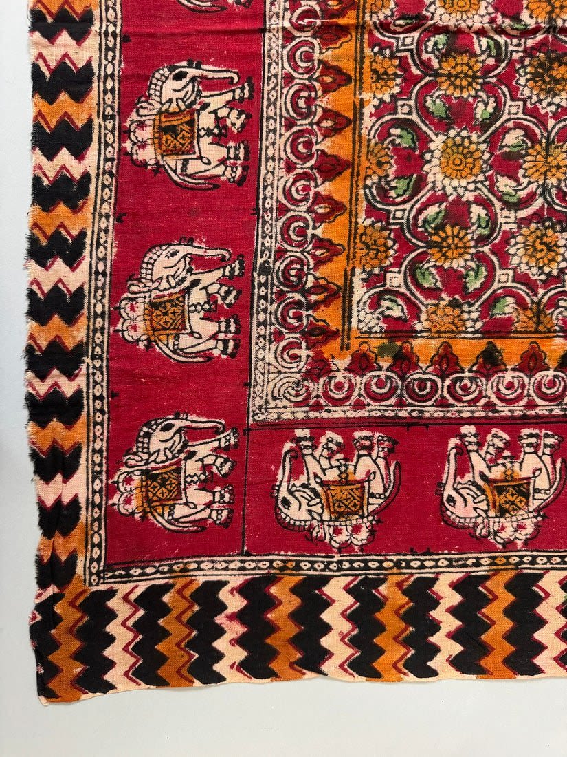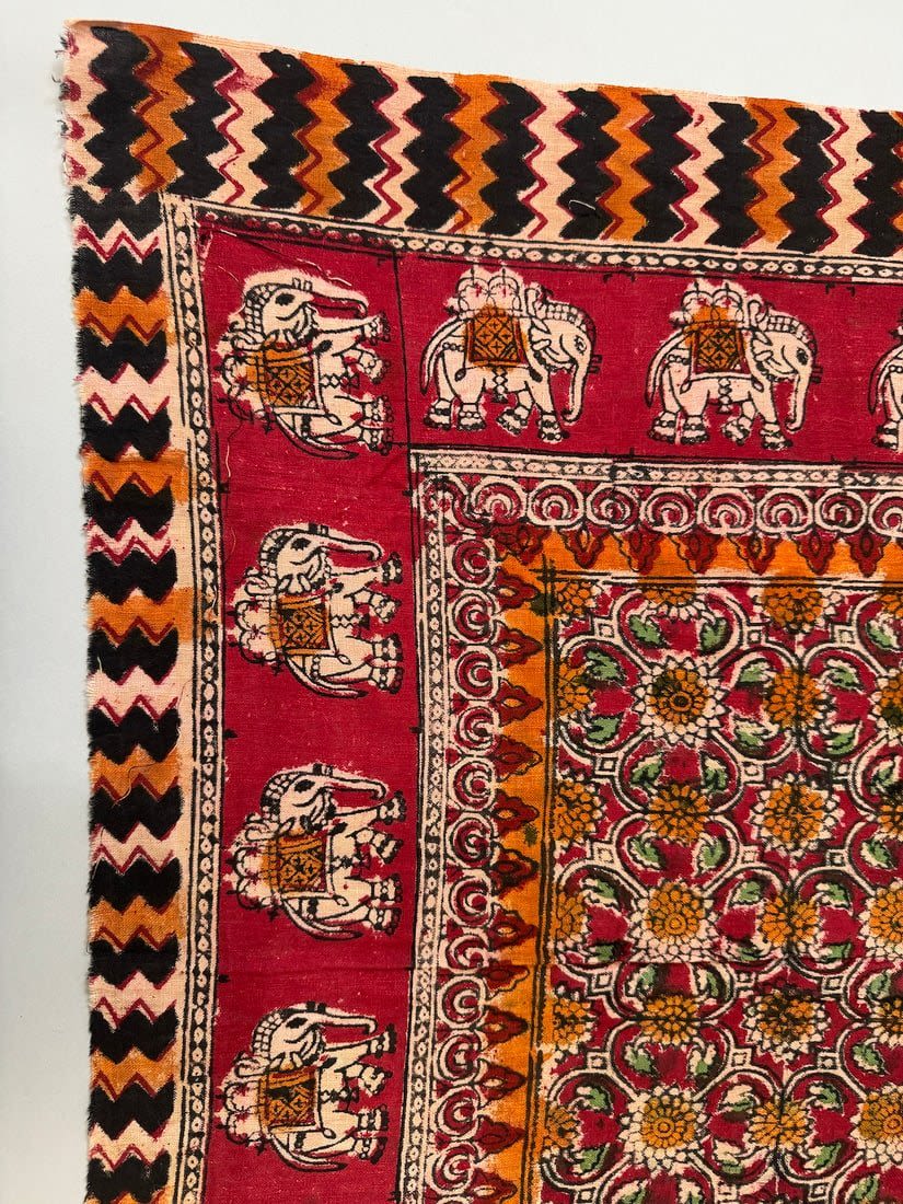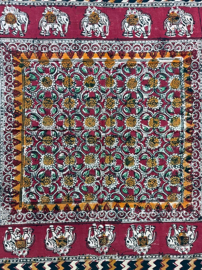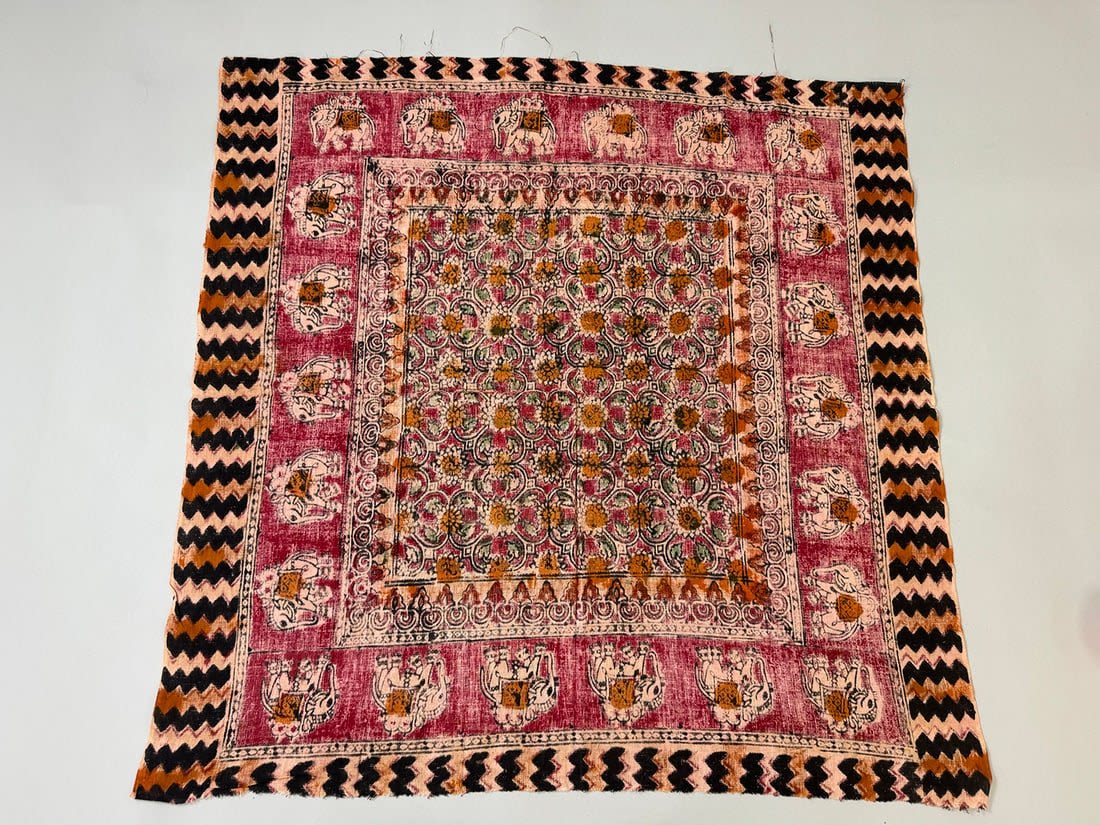 Indian multi-color batik cotton textile with elephant and floral patterns. D: 33.5 x 32.5 in.