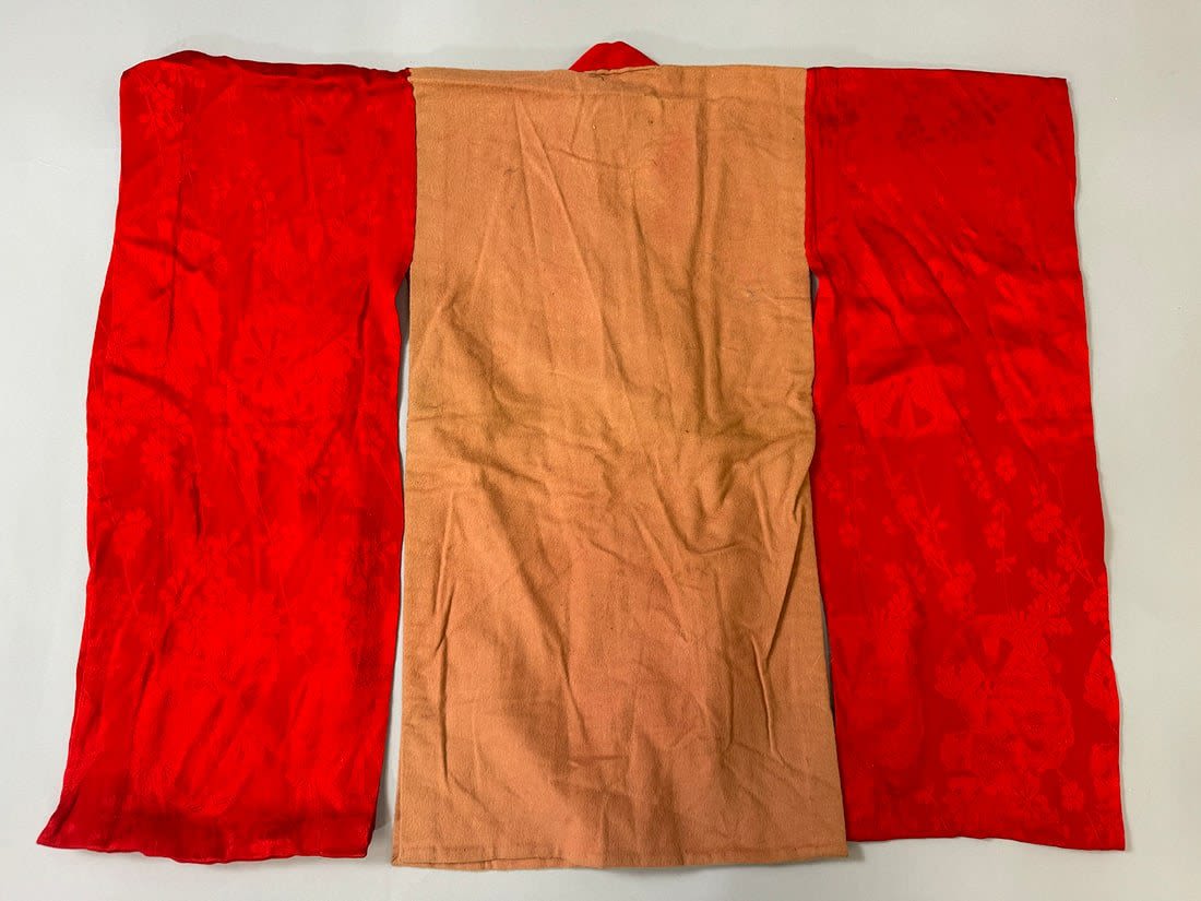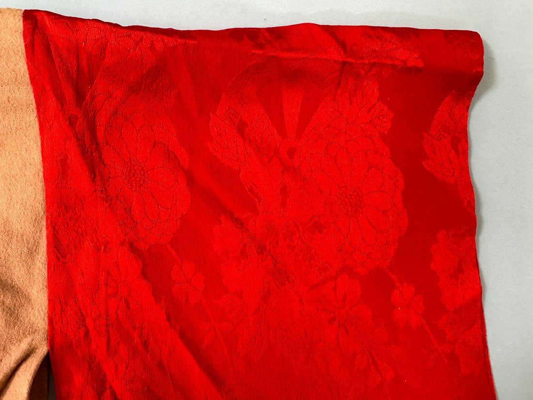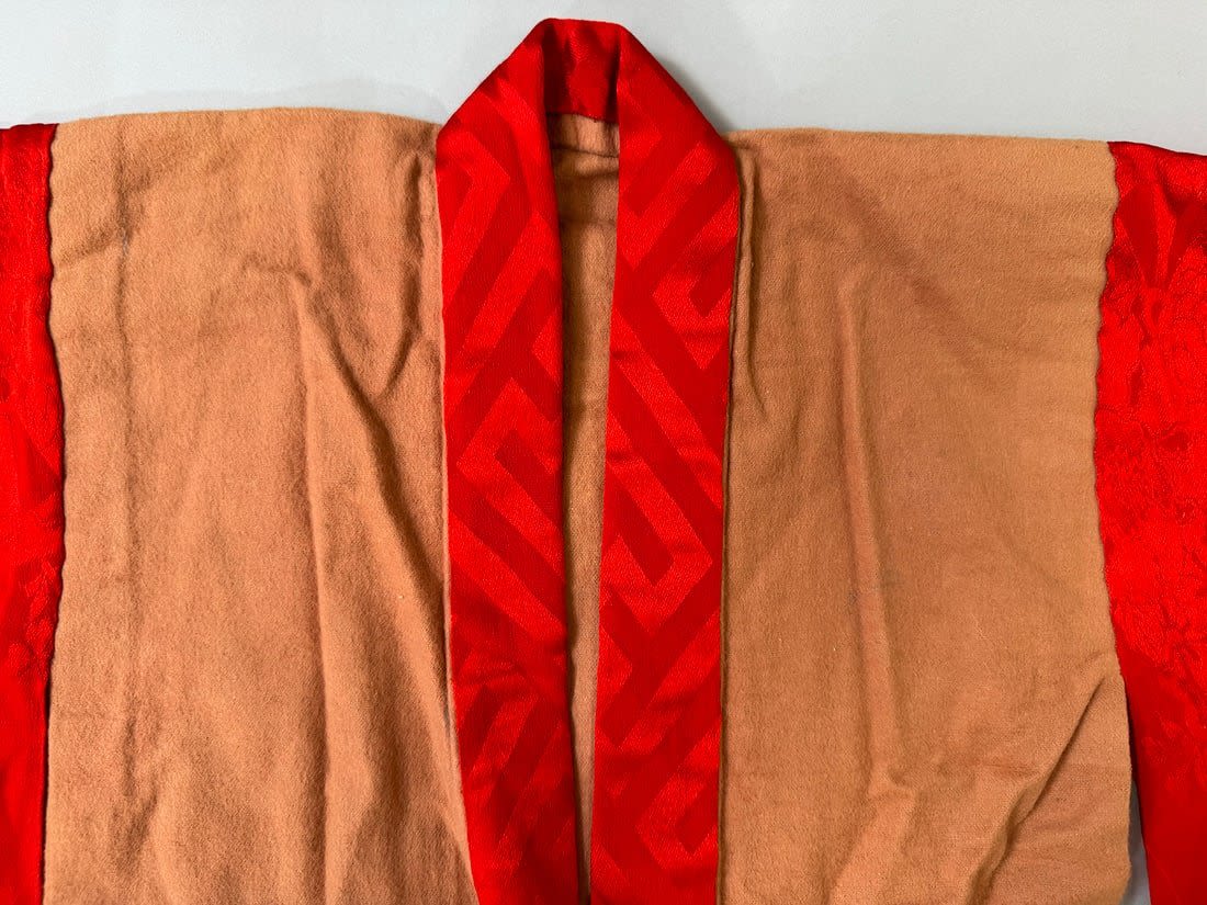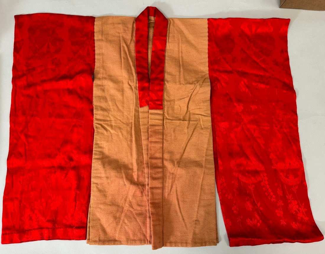 Vintage Japanese kimono haori. Handstiched. Arms made of red silk floral degisn. D: 29 W (shoulder to shoulder) x 24L in.