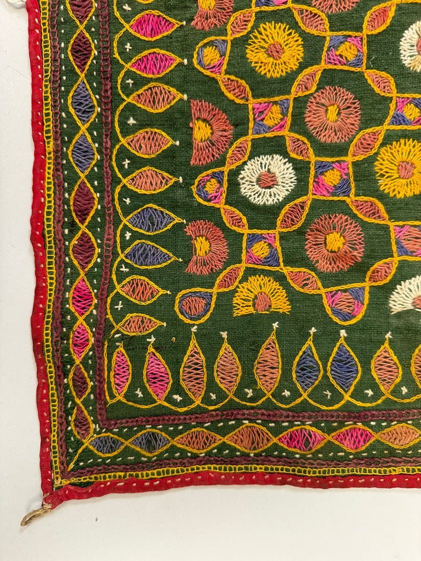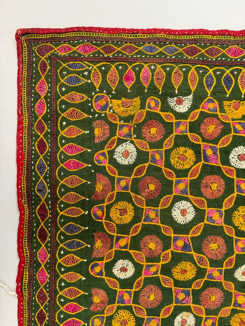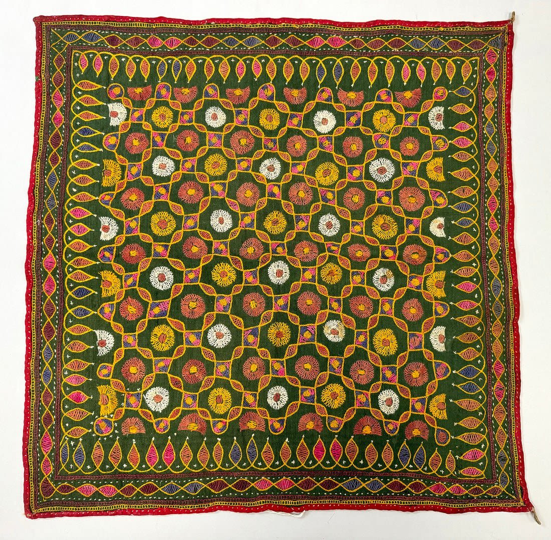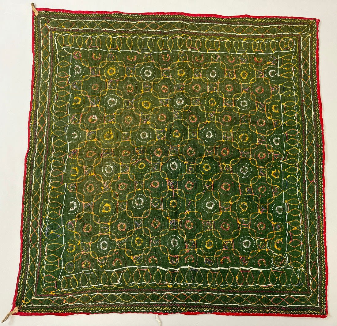 Possibly Indian hand-embriodered cotton wall hanging. D: 22.5L x 22.5 W in.