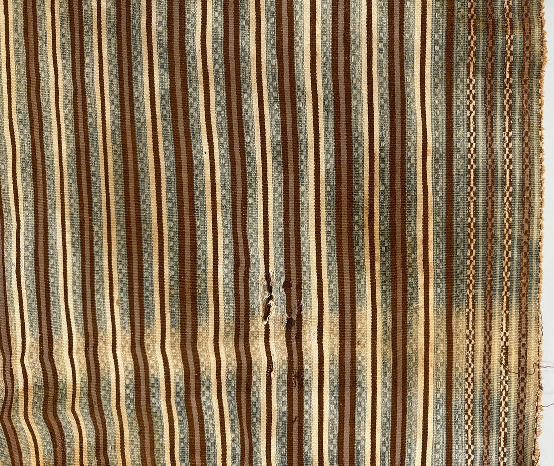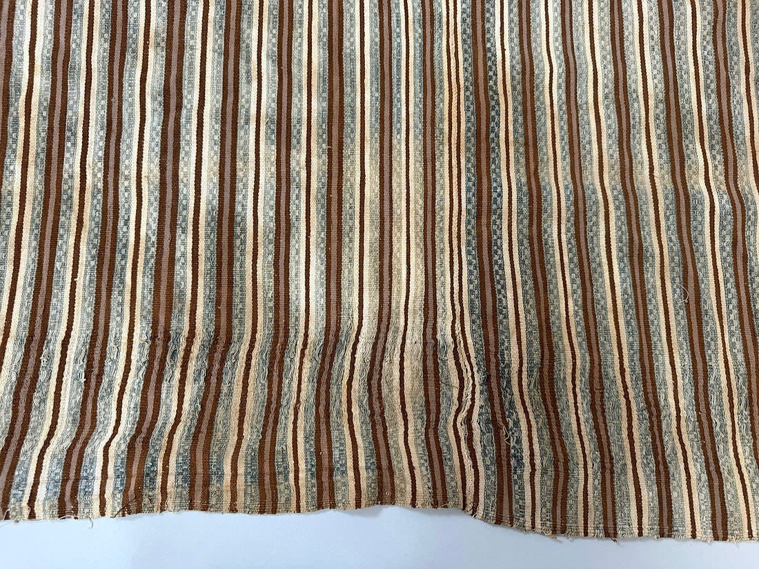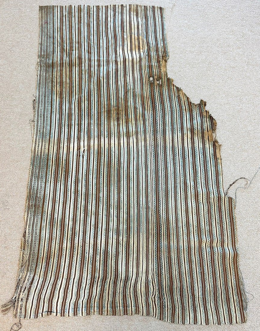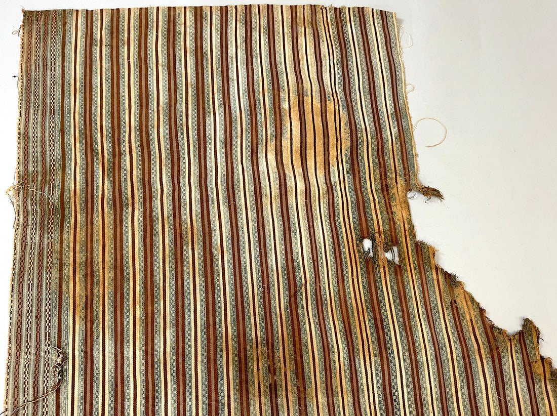 Condition: Fairly poor condition. Part of the textile is burned. Loose thread on multiple places. Visible surface dirt, stain, discoloration, rips and tears.